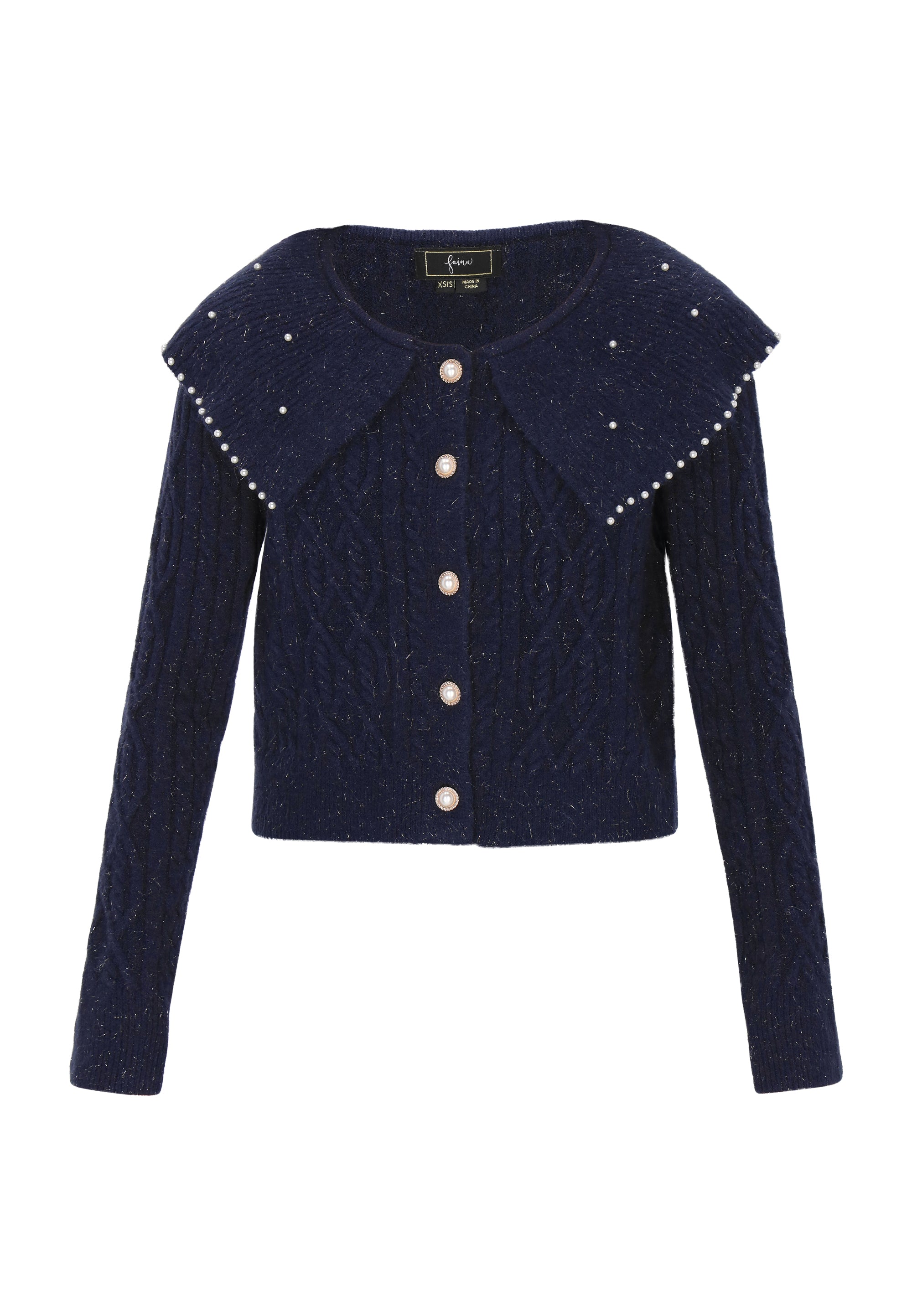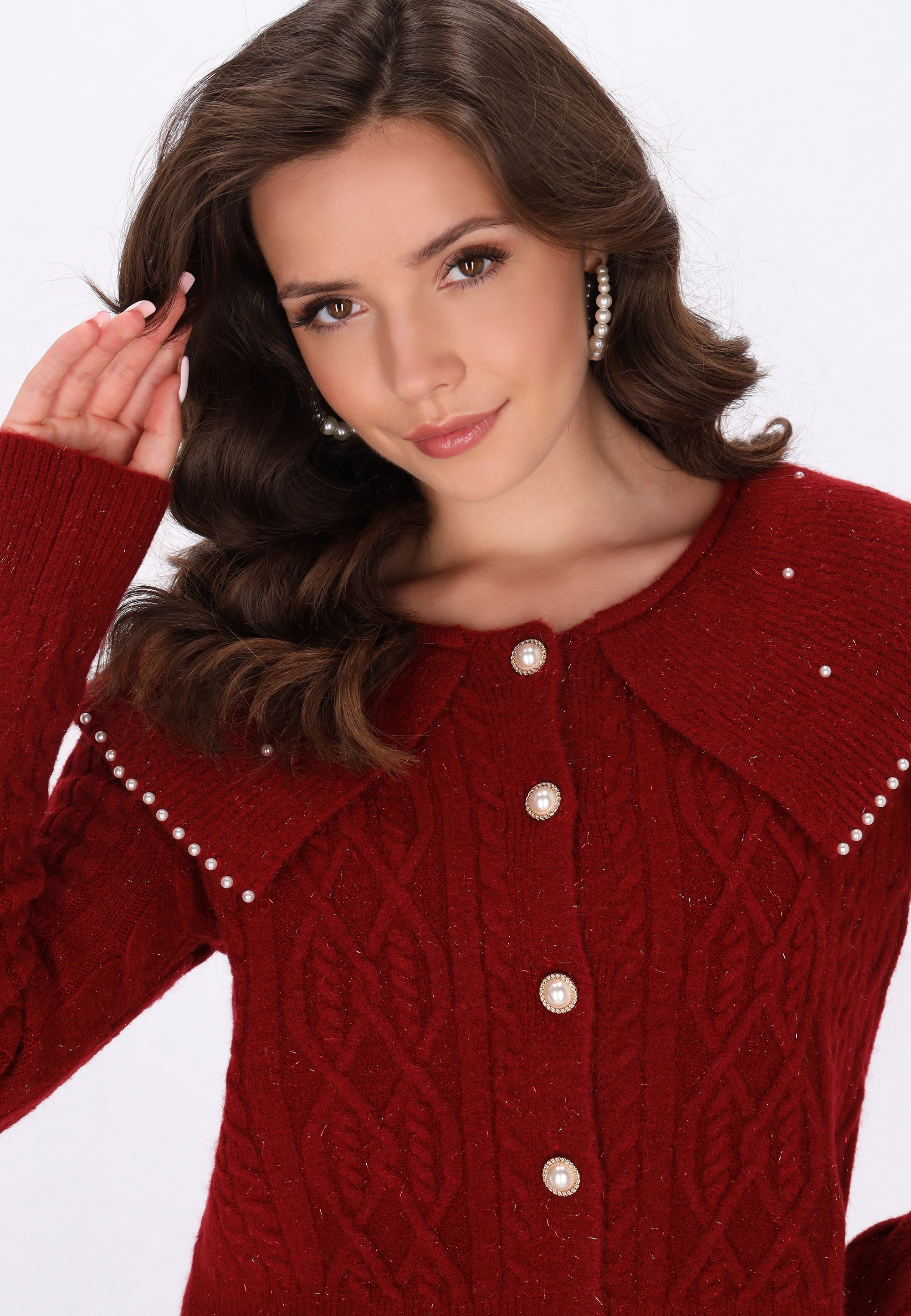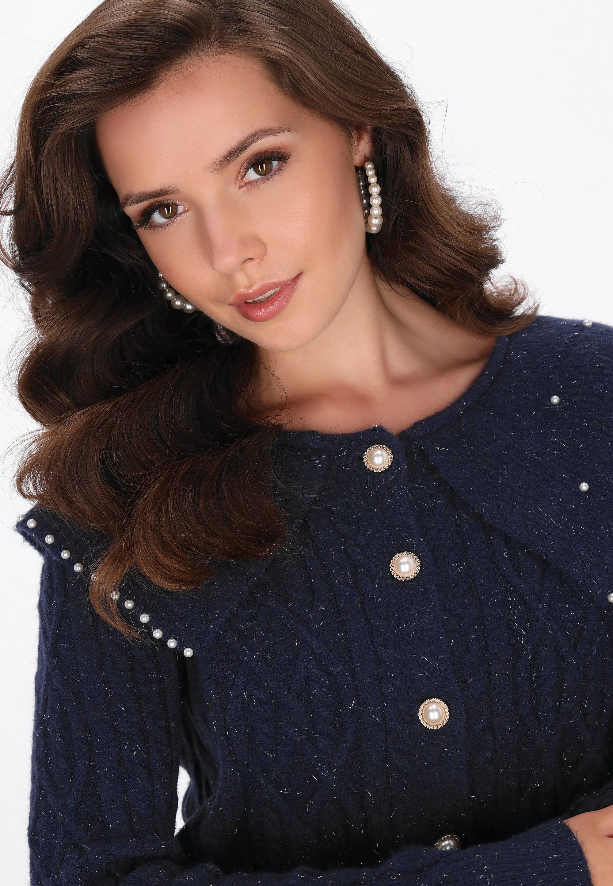 The stylish regular cut cardigan is a unique combination of classics and girlish charm. Made of soft knit fabric with a decorative plaid weave, it impresses with its details: an elegant puritan collar, shiny metallic thread and decorative pearl buttons. Long sleeves and comfortable cut make it an ideal choice for everyday wear - with jeans, skirts or dresses. The cardigan combines comfort and subtle elegance, fitting perfectly into a casual style with a touch of romance. It is part of the Fashion Look Collection.