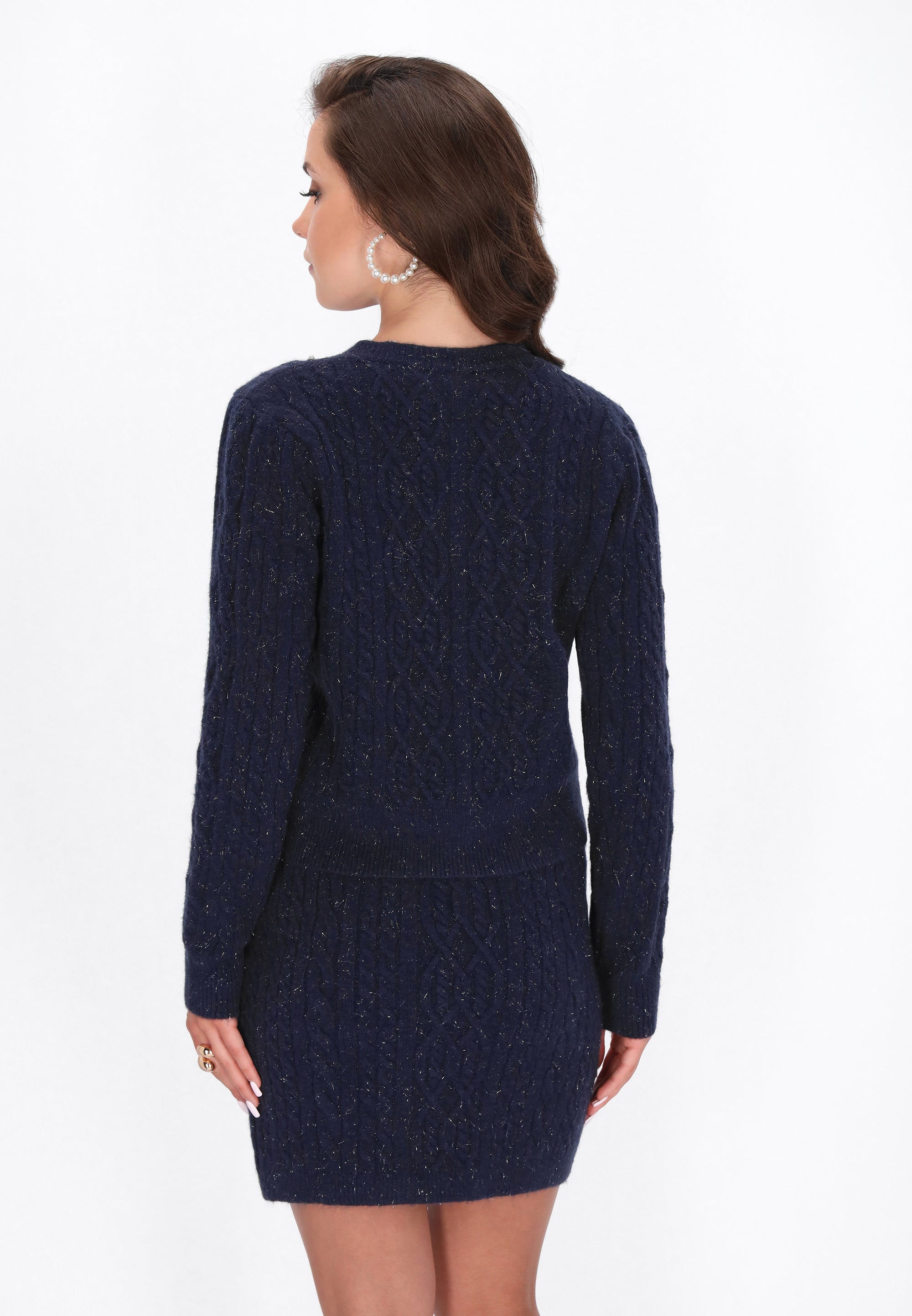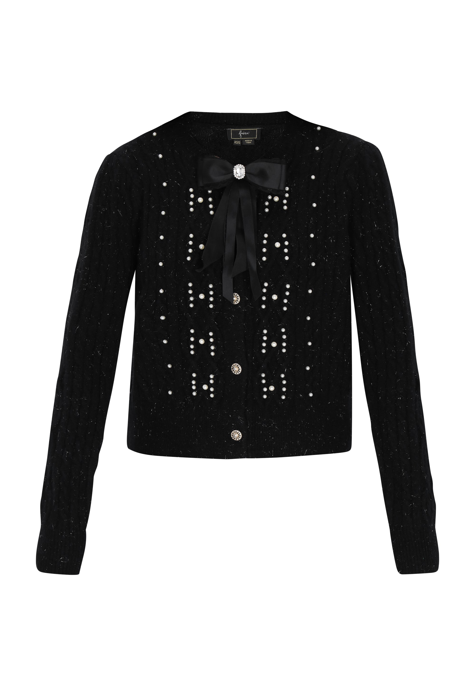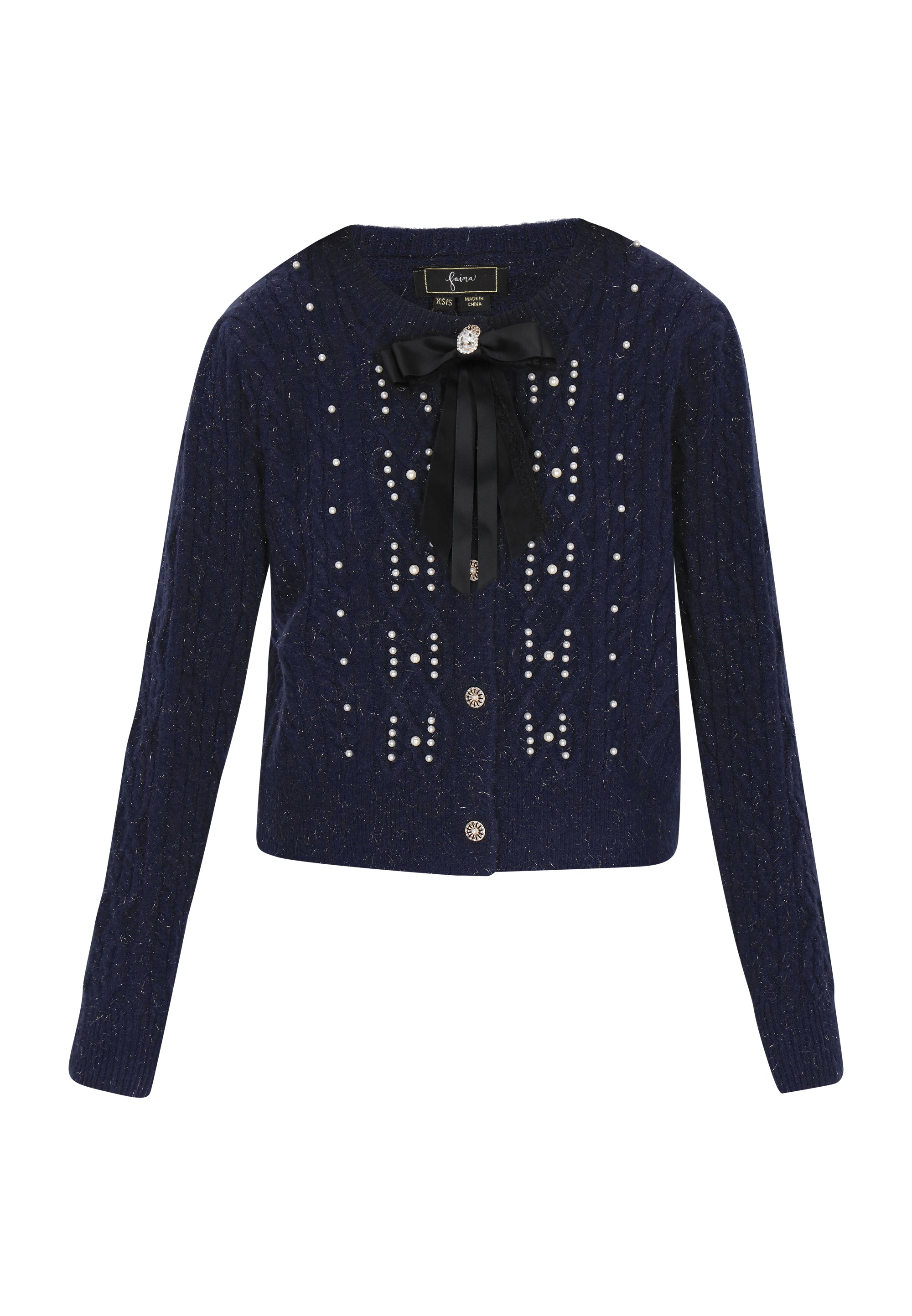 Keyword: bow, button-up, cable pattern, cardigan, casual, comfortable, fashion look collection, knitted, long sleeves, pearls, regular fit, round neck