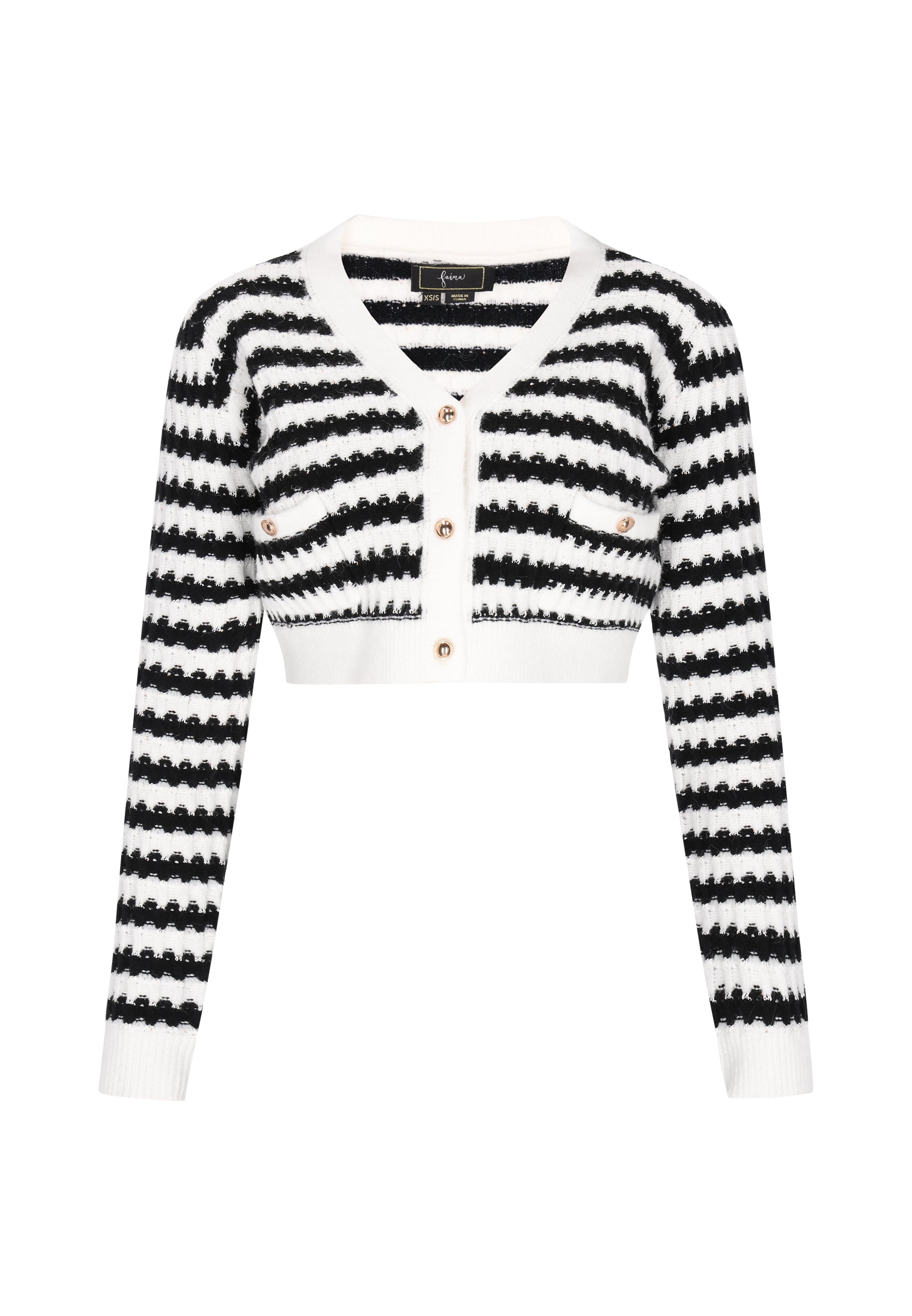 Stylish and comfortable knitted cardigan from Fashion Look Collection. It presents a regular cut and a shortened length. It perfectly emphasizes the silhouette, adding lightness to any styling. It has a classic heart neckline, long sleeves and a decorative button closure. It combines timeless elegance with a fashionable casual style. The pockets add practical charm, while the knitted structure and stripes give it a modern touch. This cardigan is a must-have item in the closet of every lover of everyday fashion with character.
