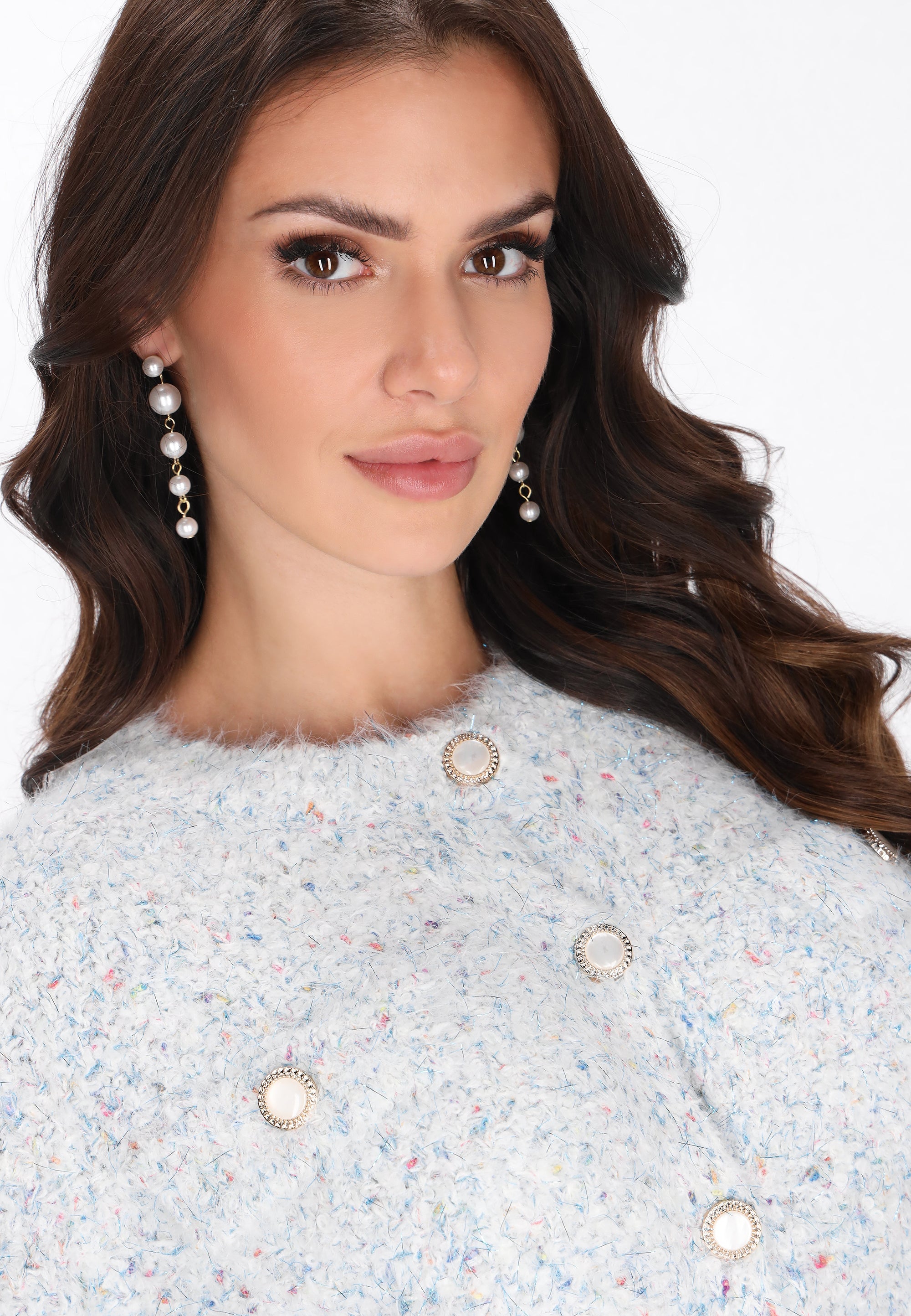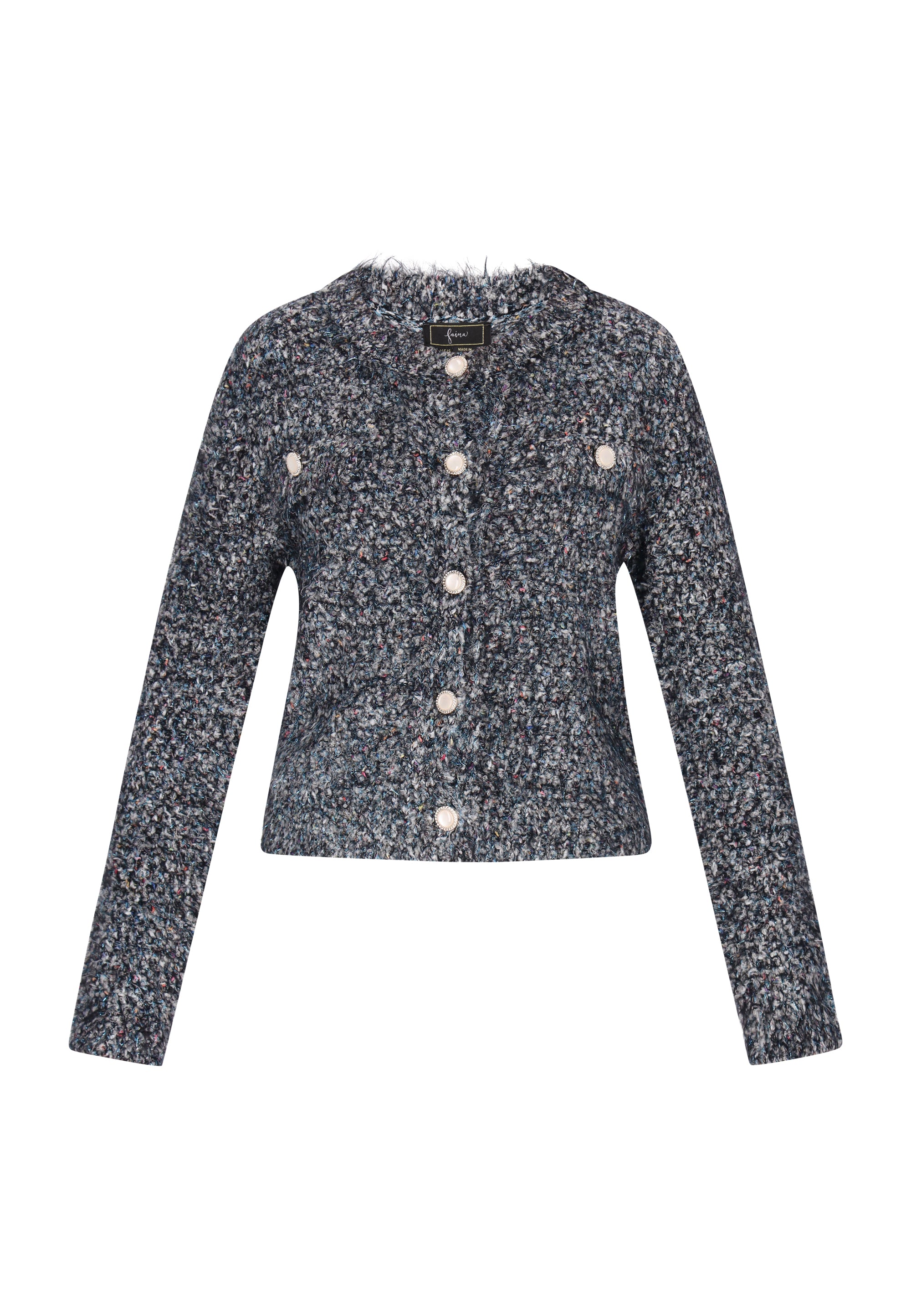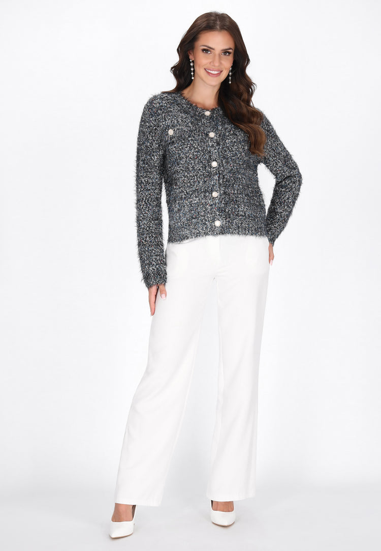 This cardigan from the Fashion Look Collection is a combination of casual style, comfort and subtle elegance. Made of soft bouclé fabric with metallic thread, it features a fashionable melange pattern that gives the whole piece a unique character. It features a regular fit, round neckline and long sleeves. A decorative button closure and chest pockets add feminine charm and a practical finish. This cozy, stylish and versatile cardigan will be perfect for everyday styling.