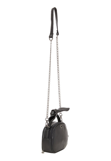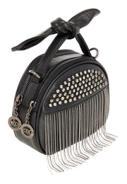 Introducing our latest handbag design that features a unique round shape with a flat bottom for easy placement. The upper front features an eye-catching array of circular studs, while vertical chain-like tassel embellishments add a touch of fringe.