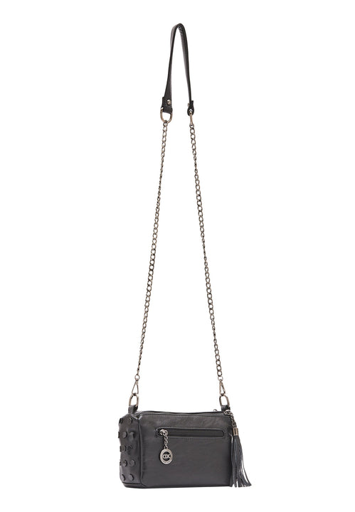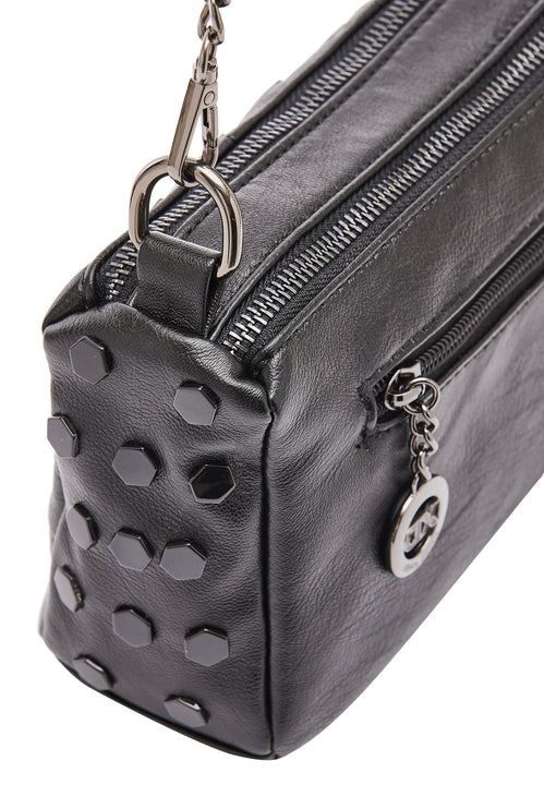 We proudly present our latest piece from the collection - a stunning rectangular shoulder bag with a quilted design and embellished studs. The top zip is decorated with a tassel for added style and functionality. The long shoulder strap consists of a metal chain connected by smaller rings and is worn over the shoulder with a comfortable leather-like material.