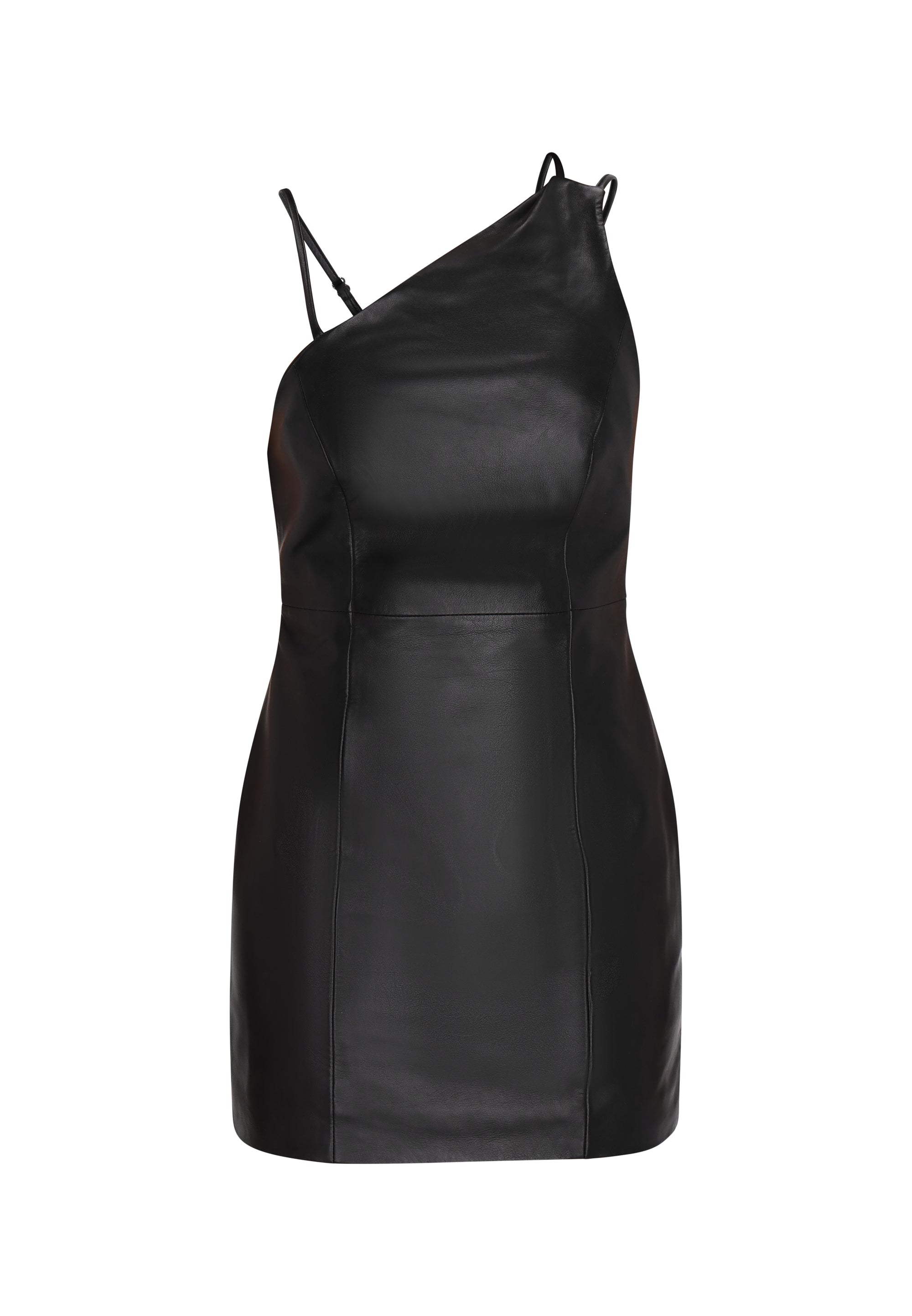 This elegant mini dress has a slim fit with a stylish one-shoulder cut and an asymmetrical neckline. The sleeveless style is perfect for parties, and the chic lambskin adds sophistication. With a zipper closure and a bold slit, this simple dress provides a comfortable and fashionable look. It is part of the Fashion Look Collection.
