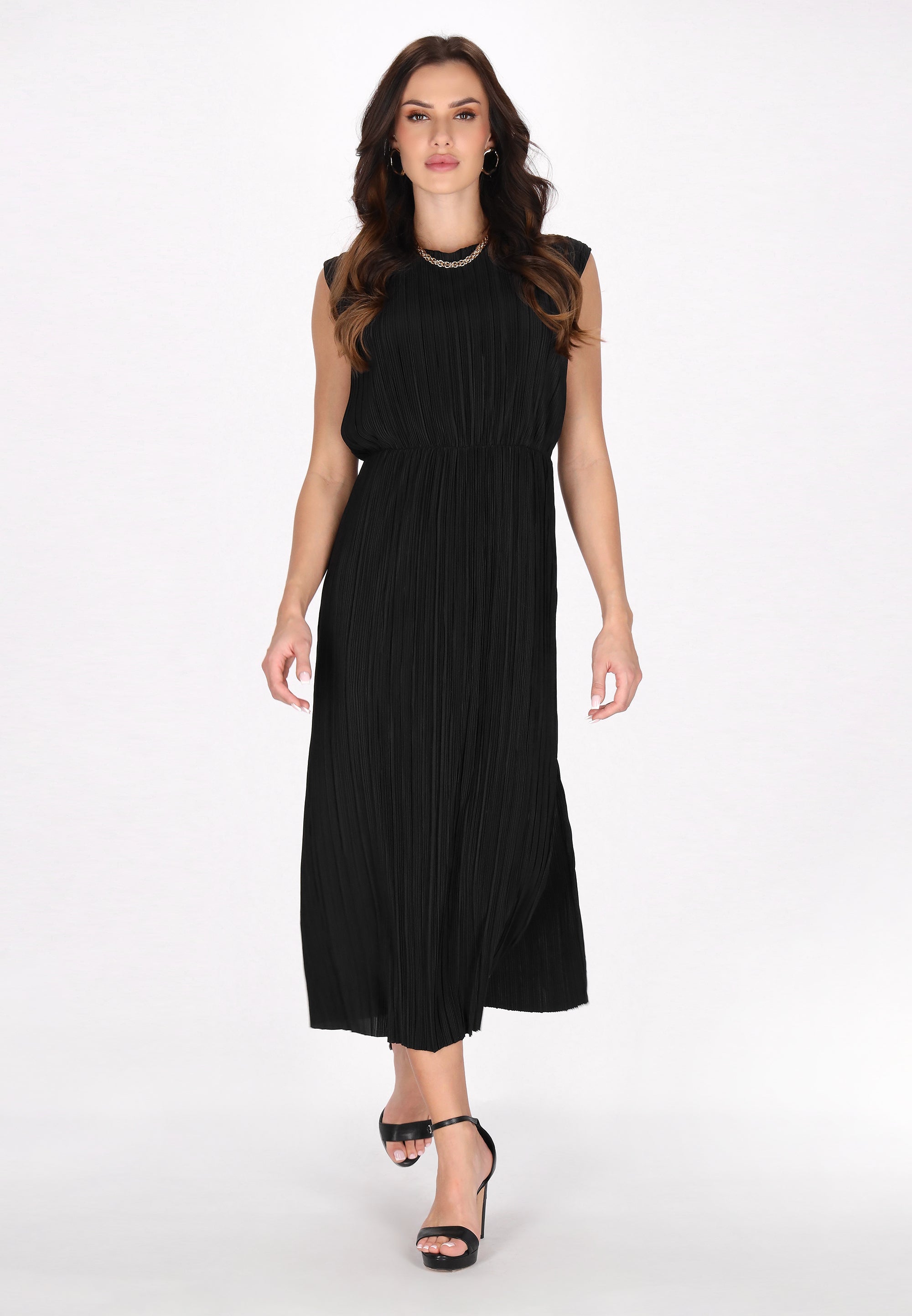 Elevate your everyday style with this chic pleated dress from the Fashion Look Collection. Designed in a regular fit, it features a classic round neckline and delicate cap sleeves for effortless elegance. The elastic waist enhances your silhouette, while the midi length adds versatility. Made from soft knitted fabric, this timeless dress is perfect for casual outings and beyond.