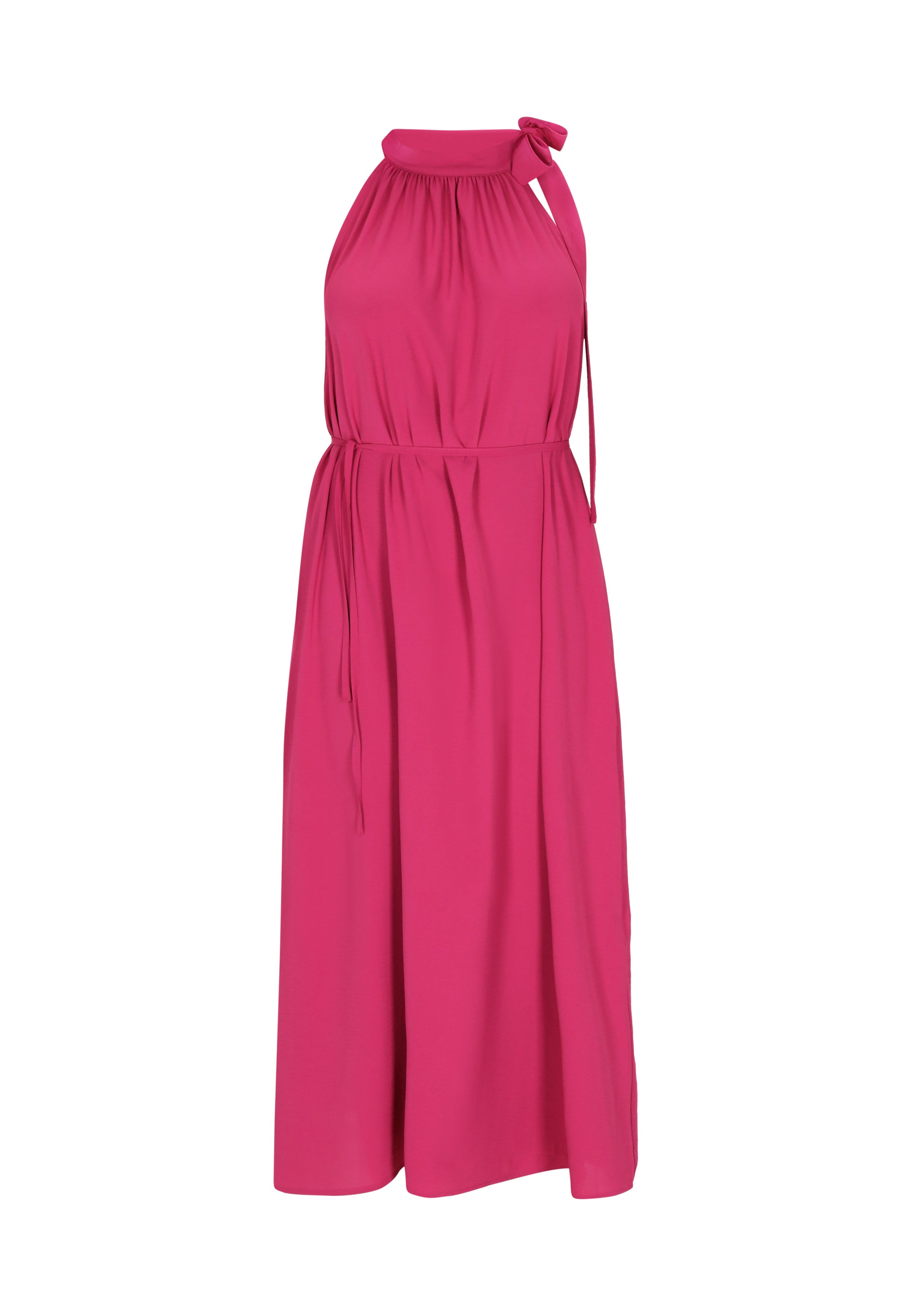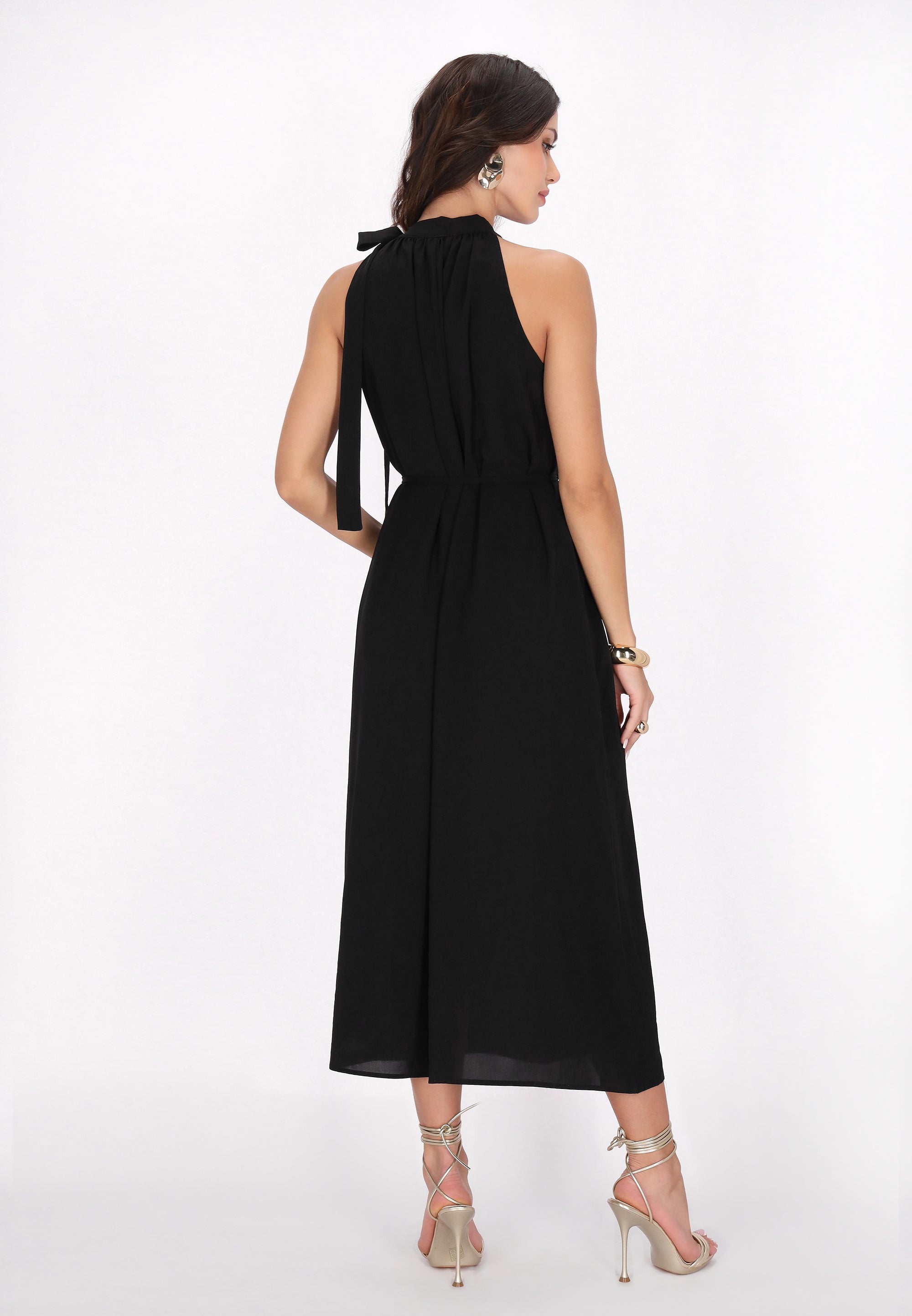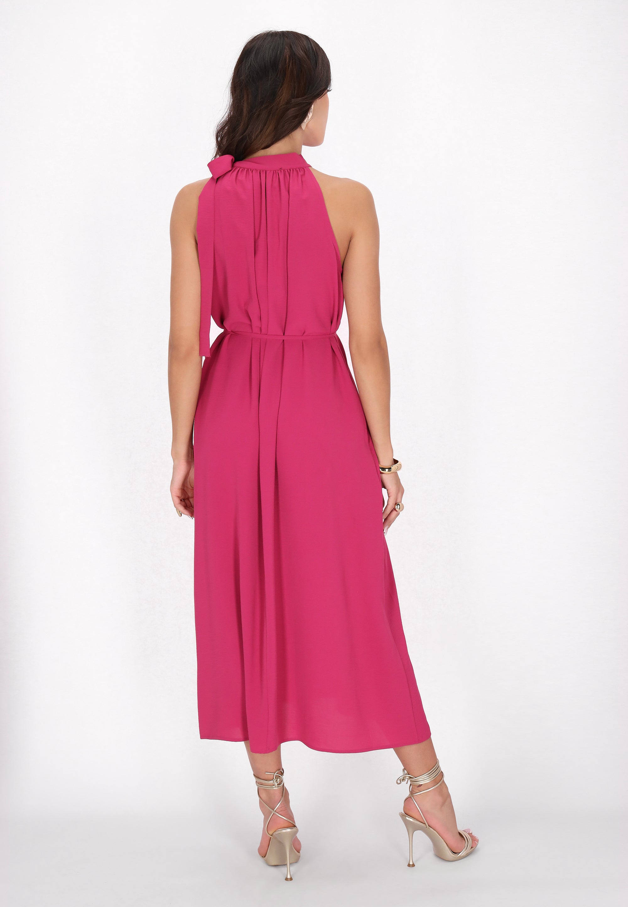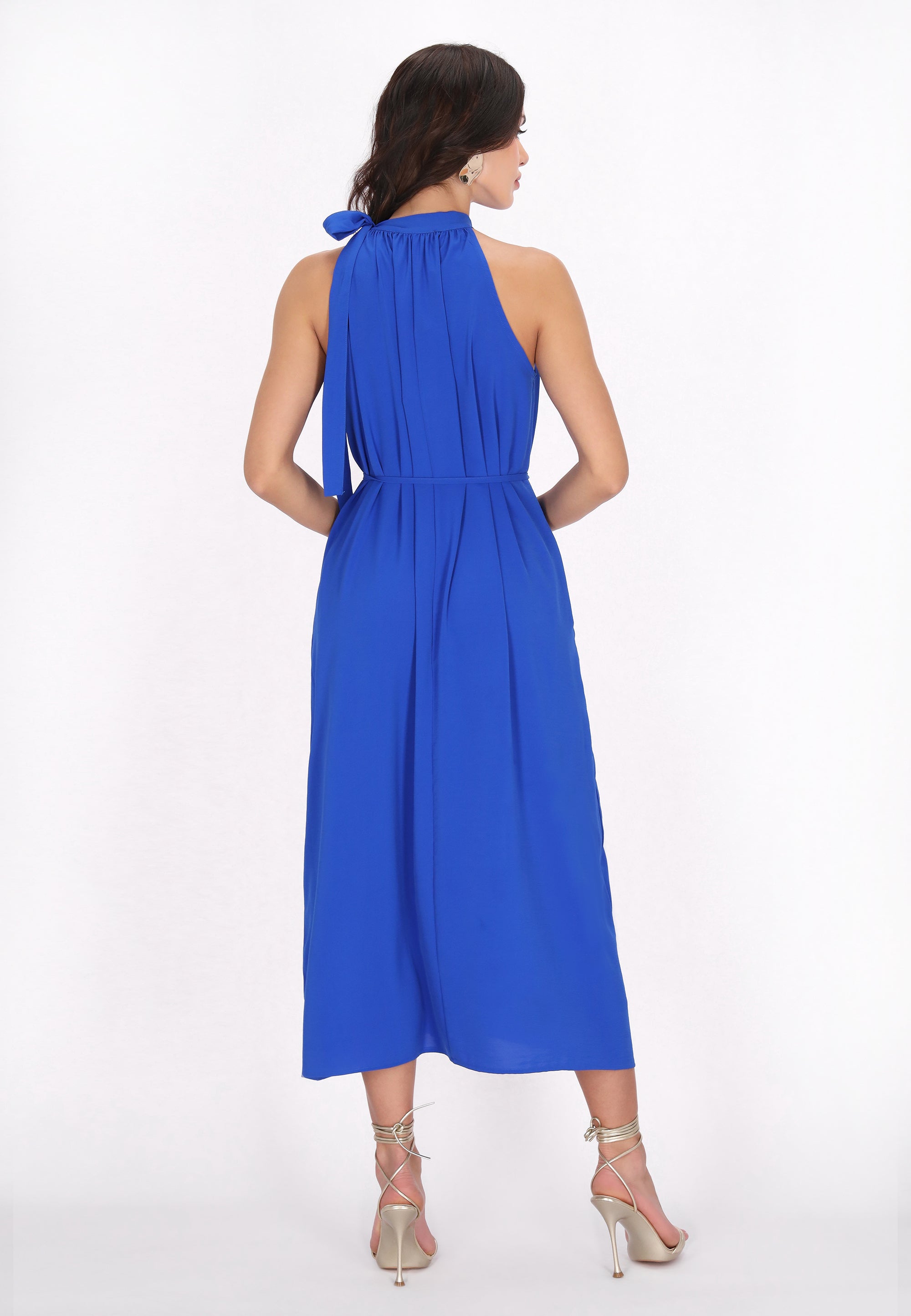 Elevate your style with this elegant halter neck dress, designed in a regular fit. Featuring a gathered neckline that creates a soft drape effect, the sleeveless design flows into a chic midi skirt. A tie rope belt cinches at the waist for an adjustable fit, making it perfect for any event in our stylish Fashion Look Collection.