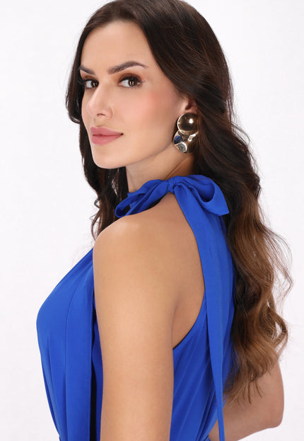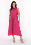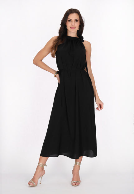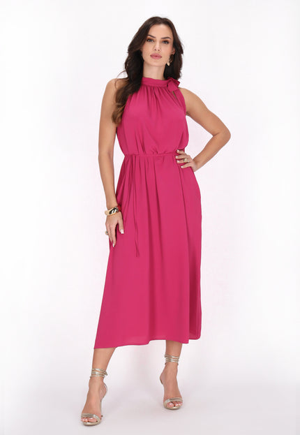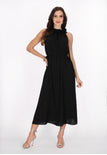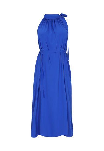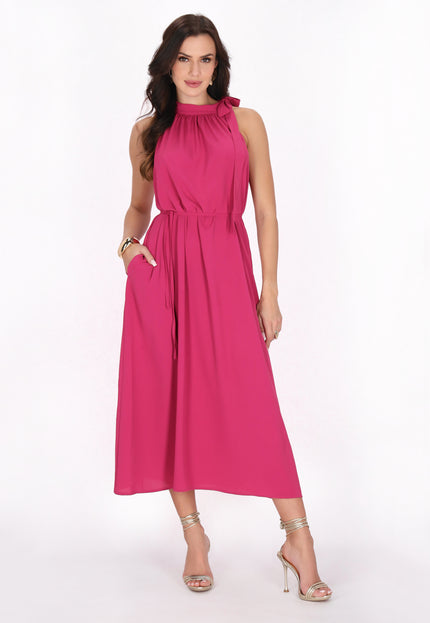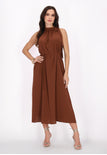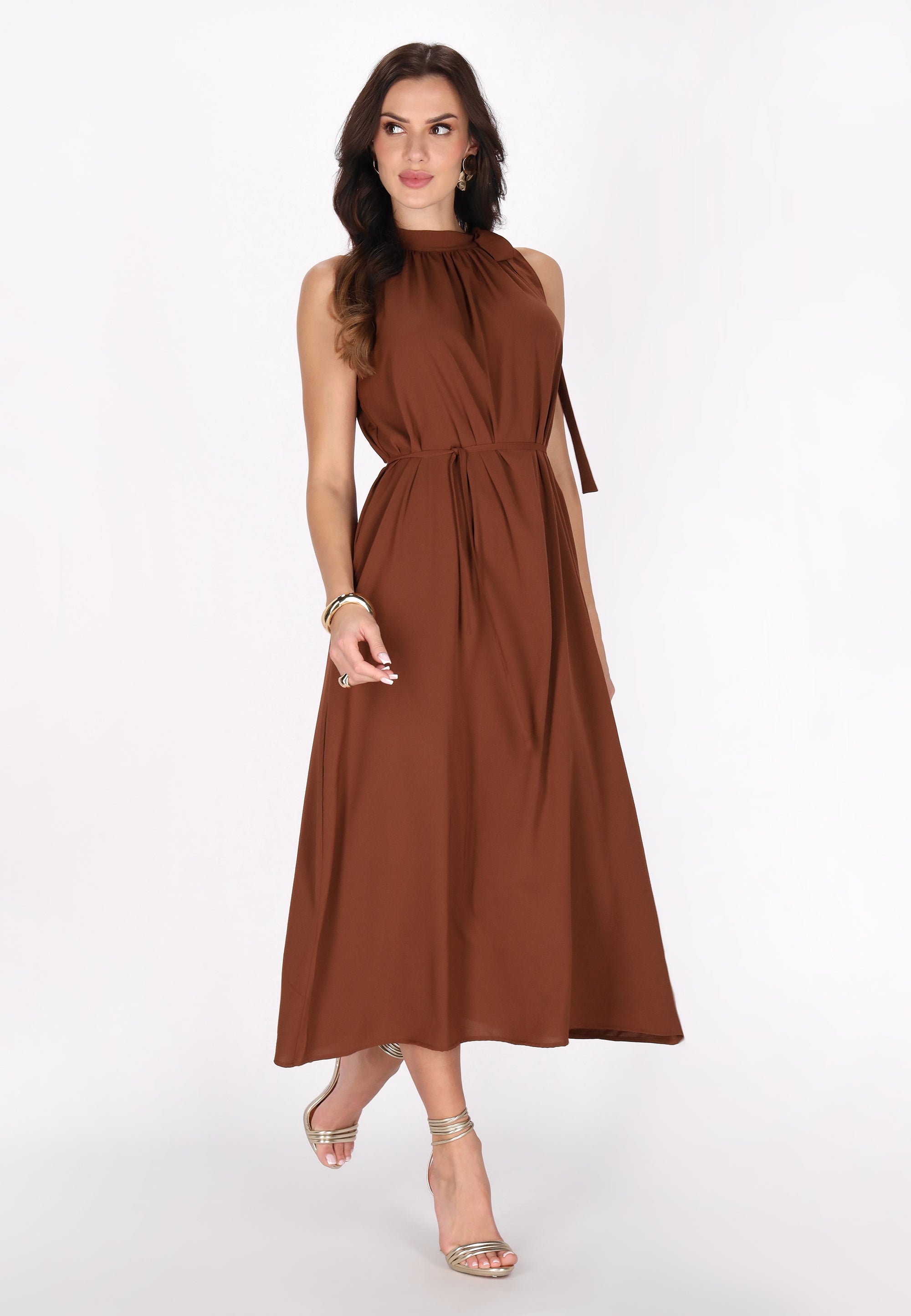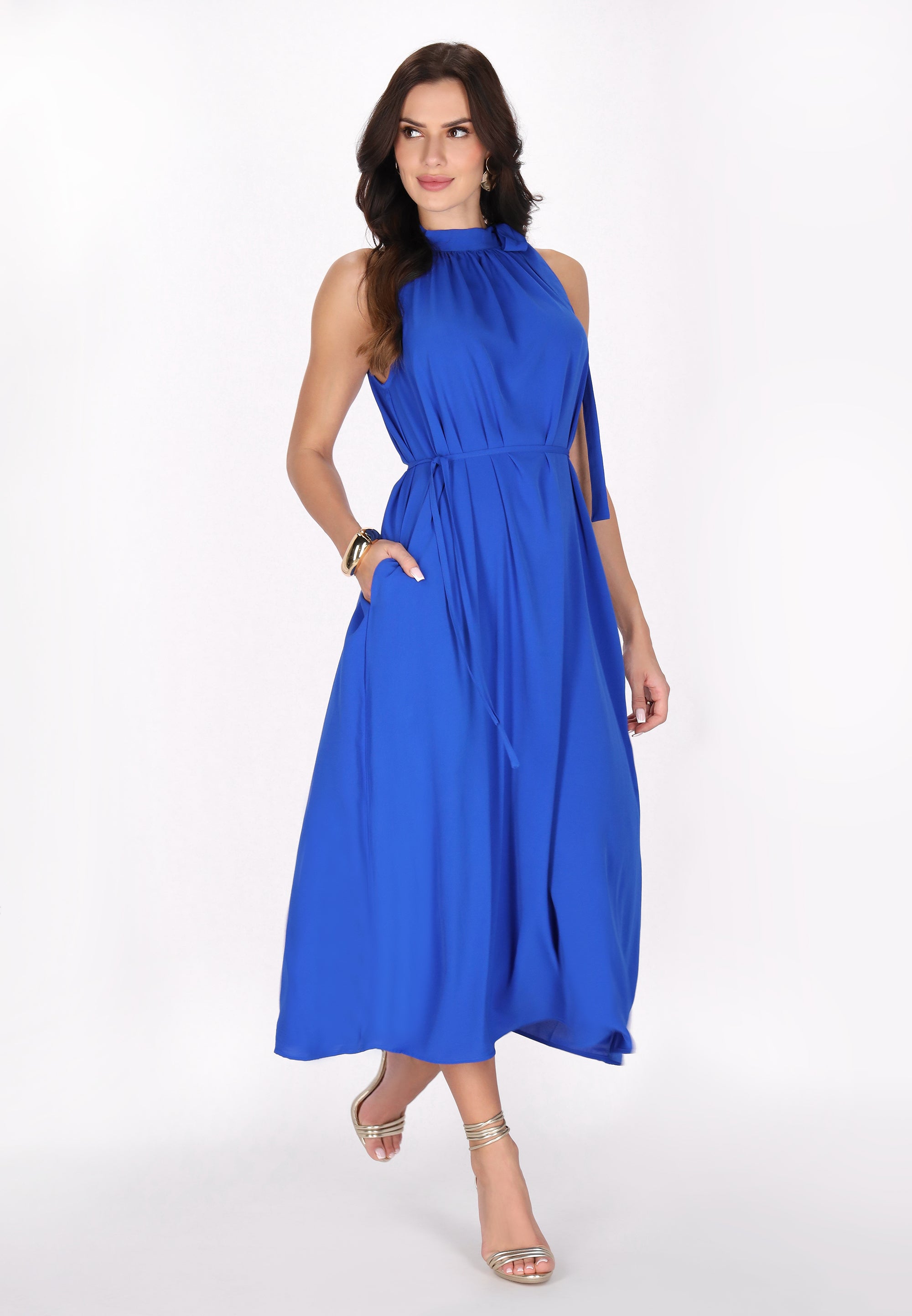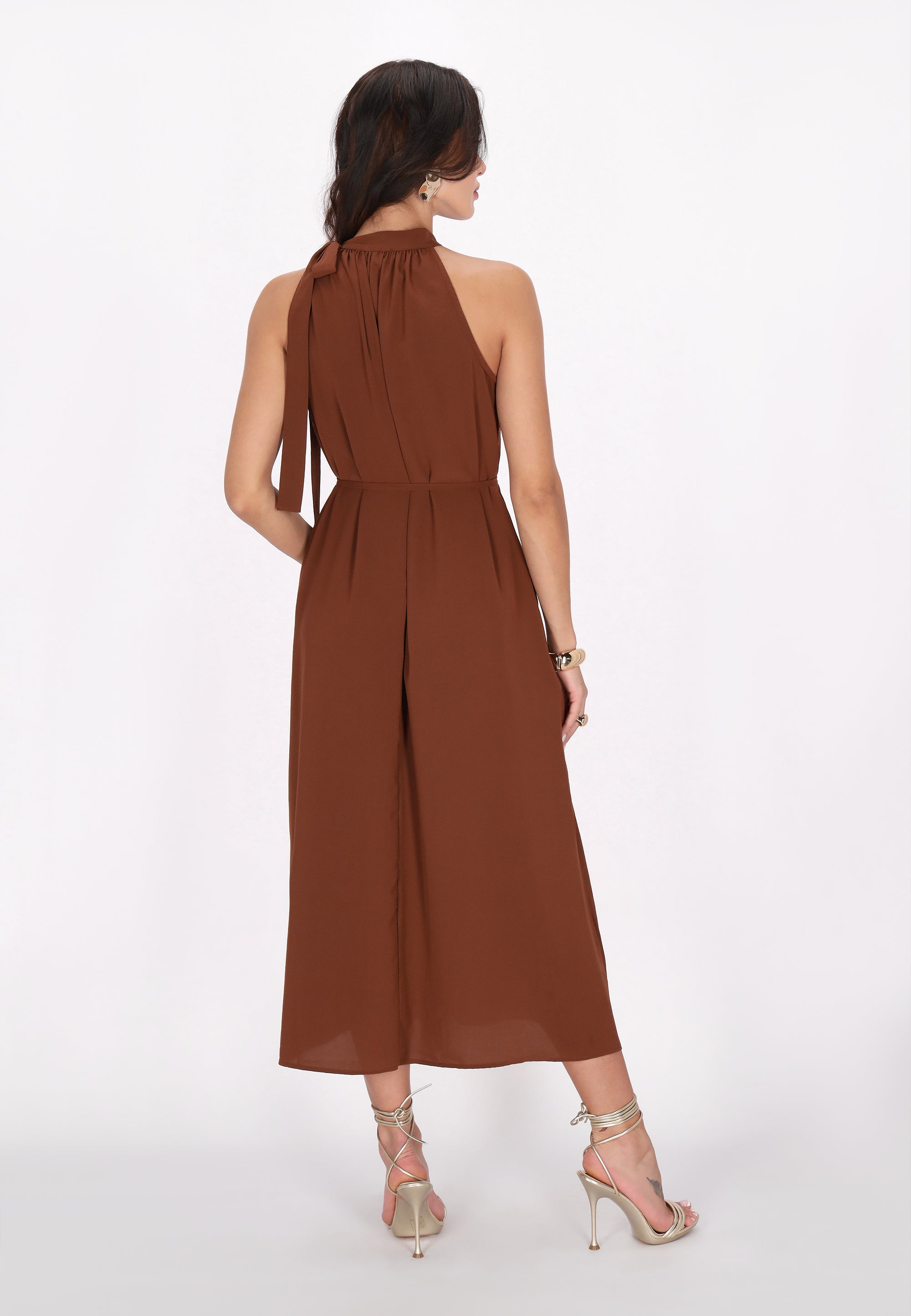 Elevate your style with this elegant halter neck dress, designed in a regular fit. Featuring a gathered neckline that creates a soft drape effect, the sleeveless design flows into a chic midi skirt. A tie rope belt cinches at the waist for an adjustable fit, making it perfect for any event in our stylish Fashion Look Collection.