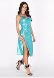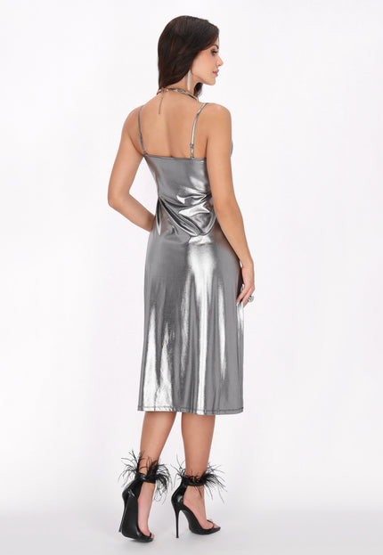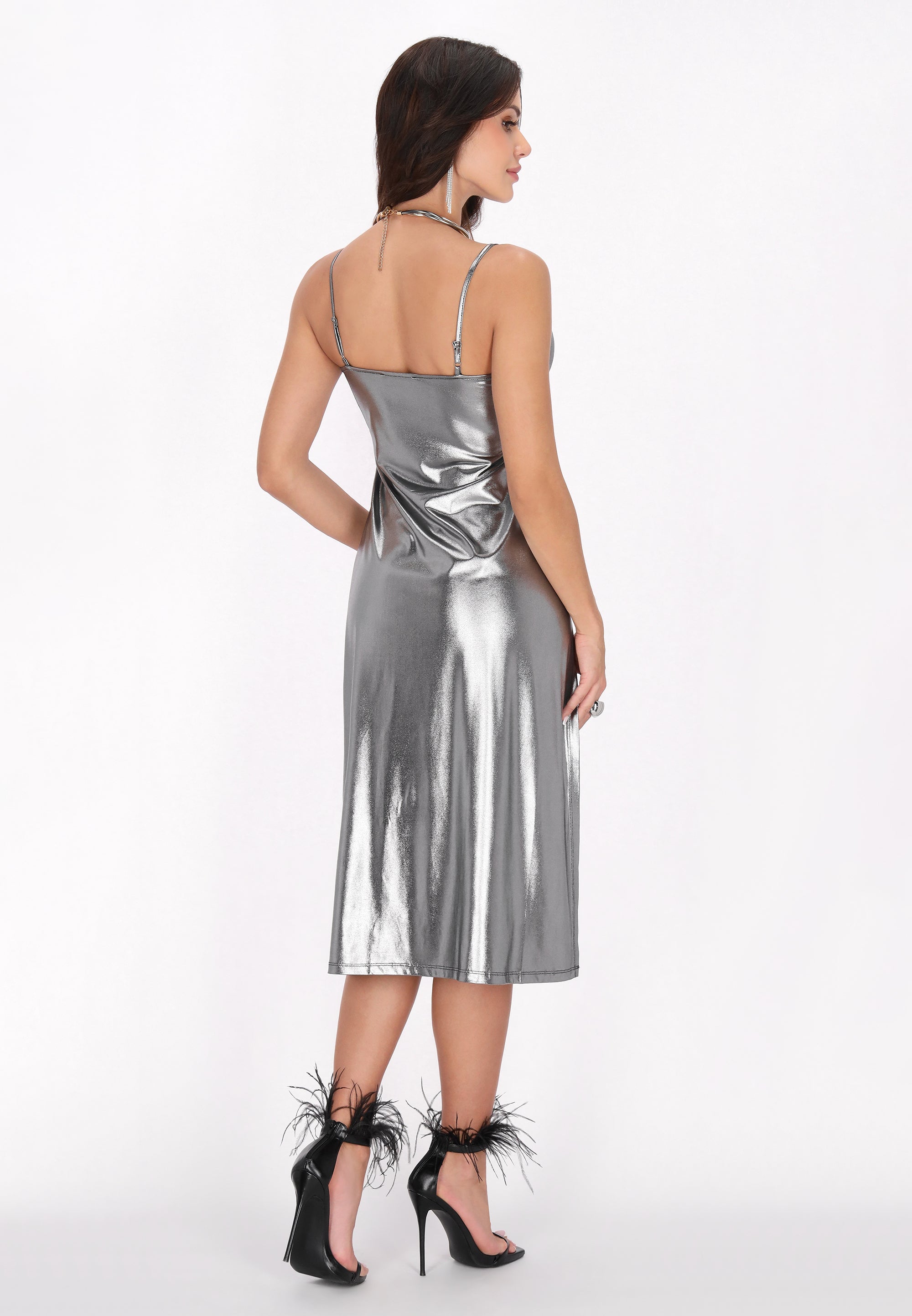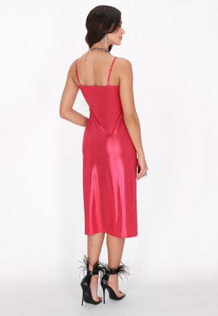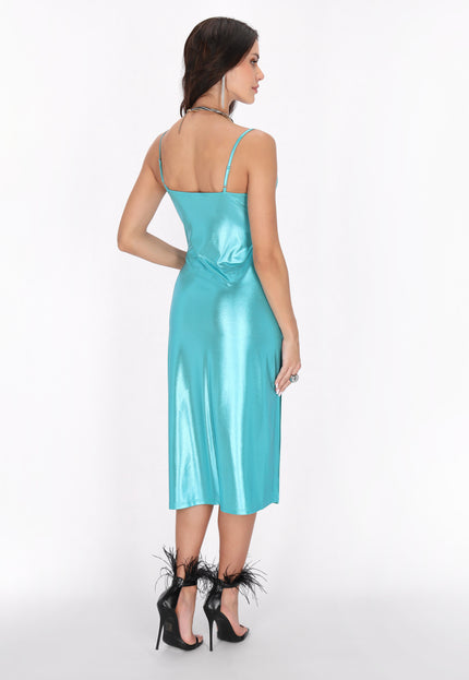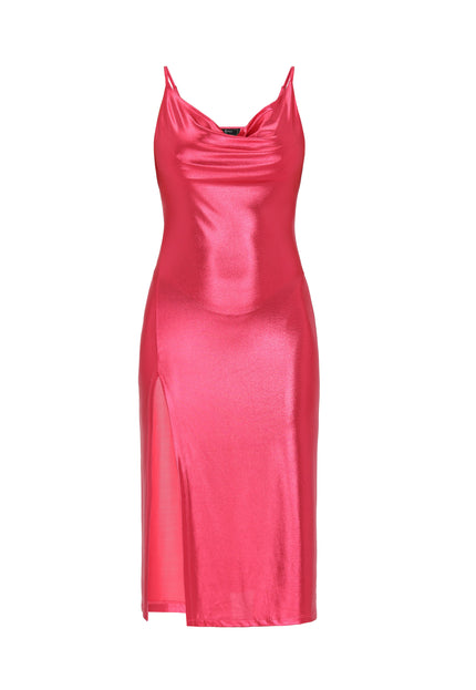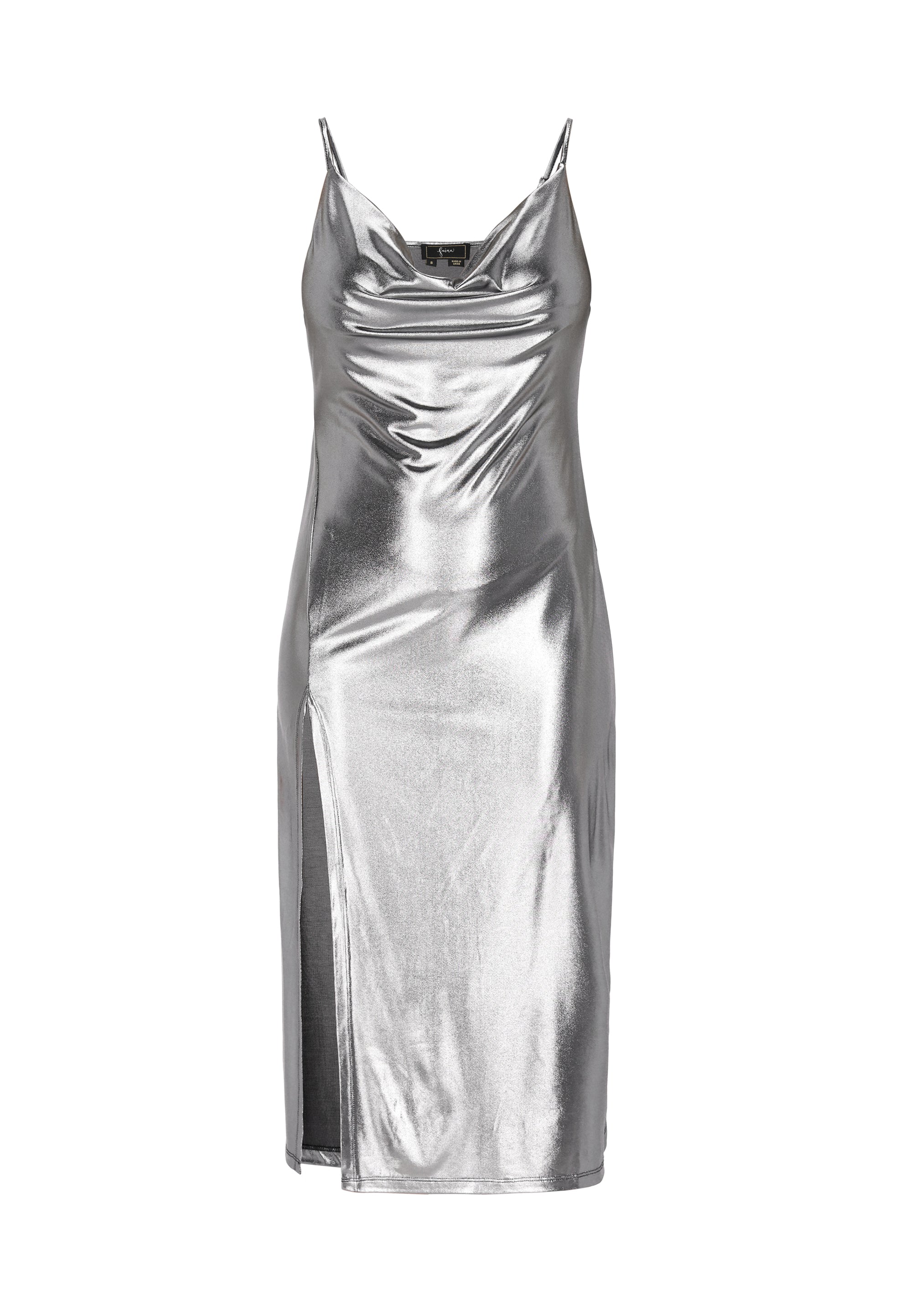 Elevate your evening wardrobe with this stylish midi dress featuring a chic cowl neck and adjustable straps for a perfect fit. The high slit enhances movement and allure, while the shiny knitted fabric adds a touch of glamour. Ideal for parties or special events, this dress is essential in the Fashion Look Collection.