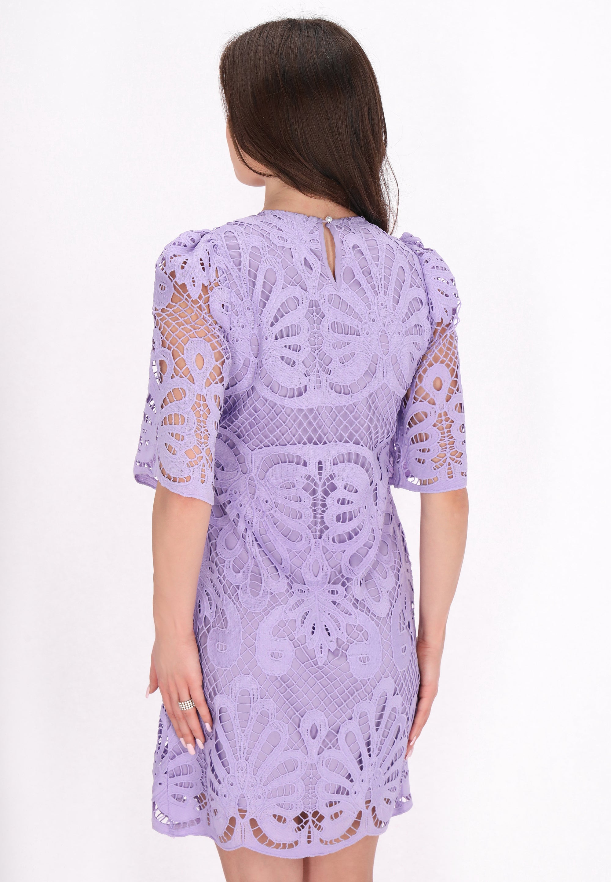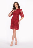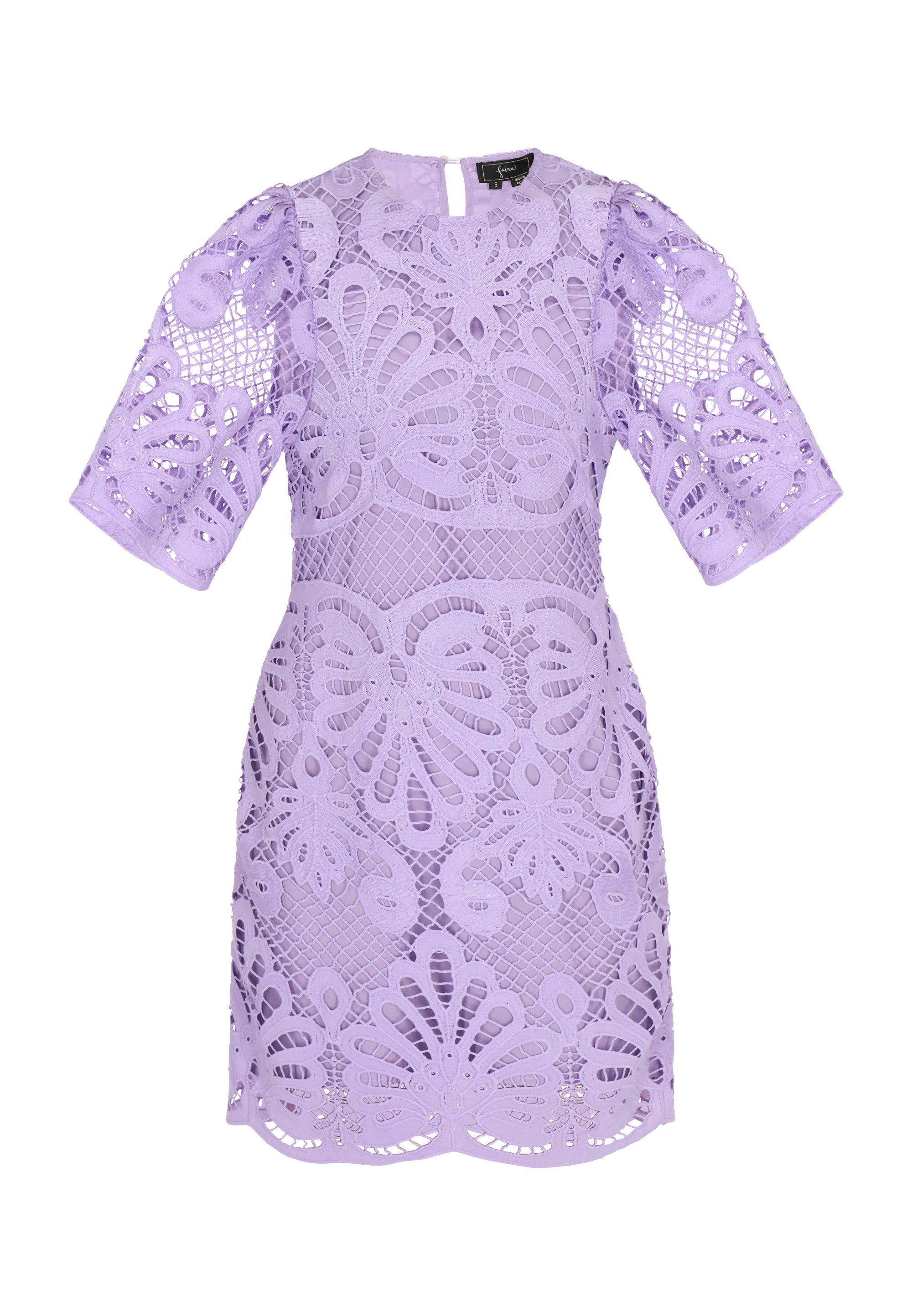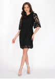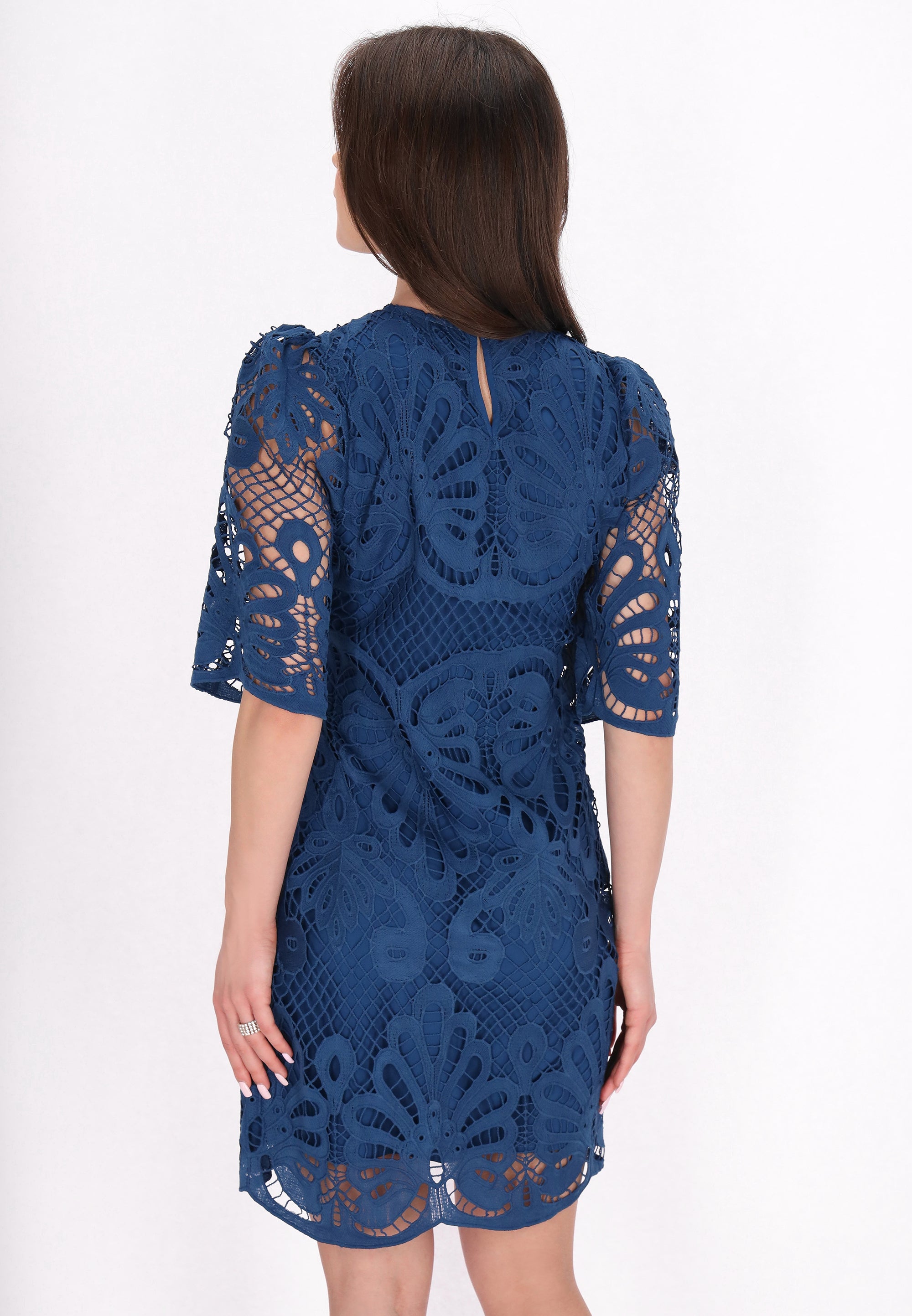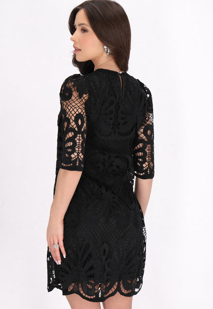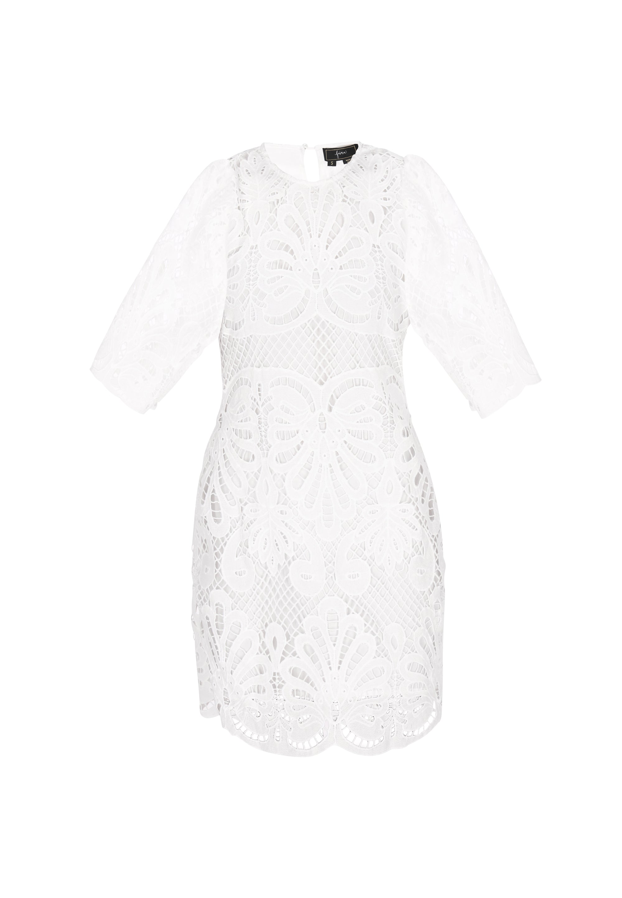 Discover this elegant mini dress from the Fashion Look Collection designed for a stylish look. Featuring a round neck and short flared sleeves, it boasts intricate embroidered patterns on woven fabric. The slim fit shape accentuates the silhouette, while floral motifs enhance its charm. Perfectly lined, this piece is ideal for events.