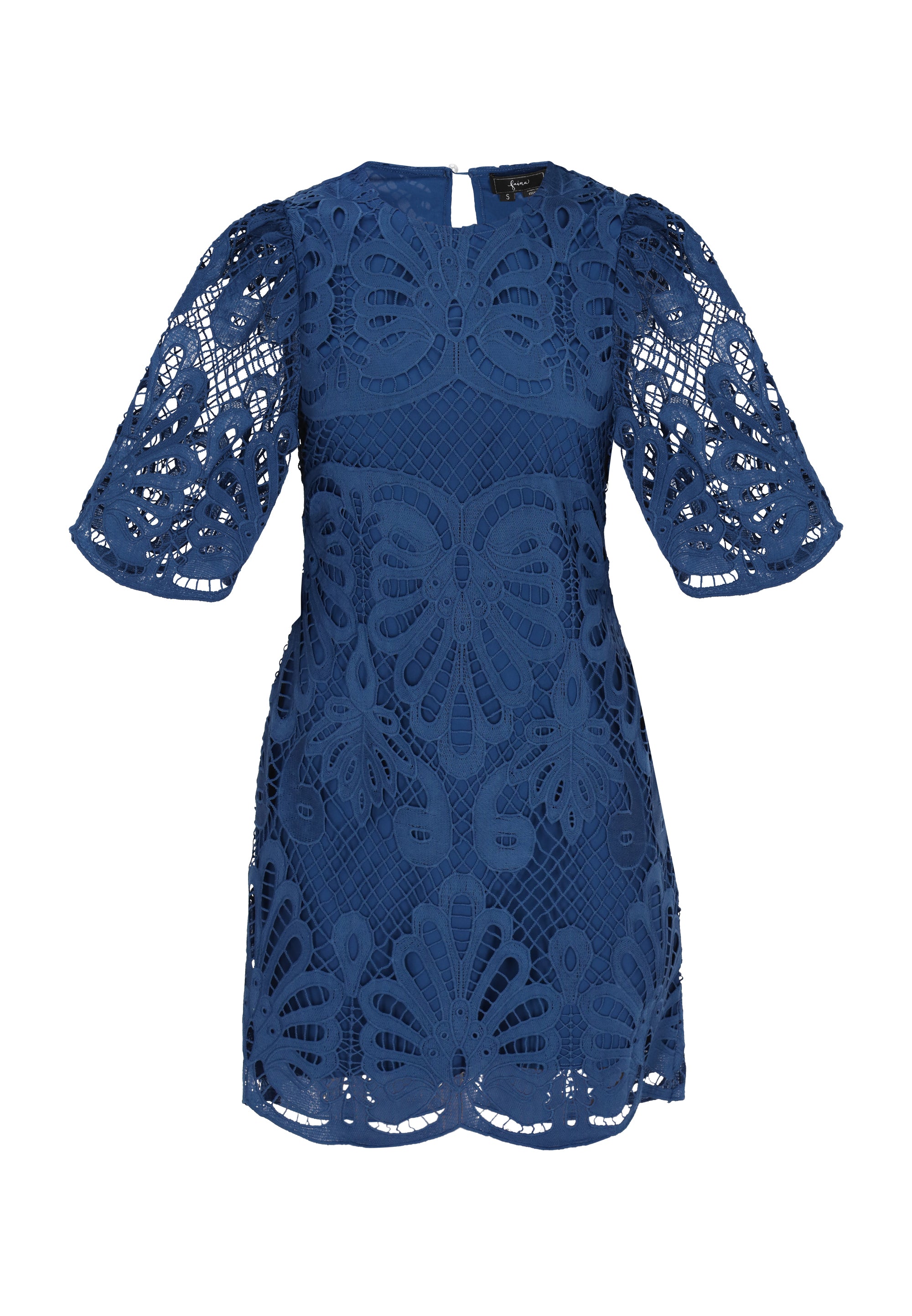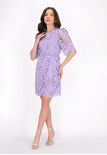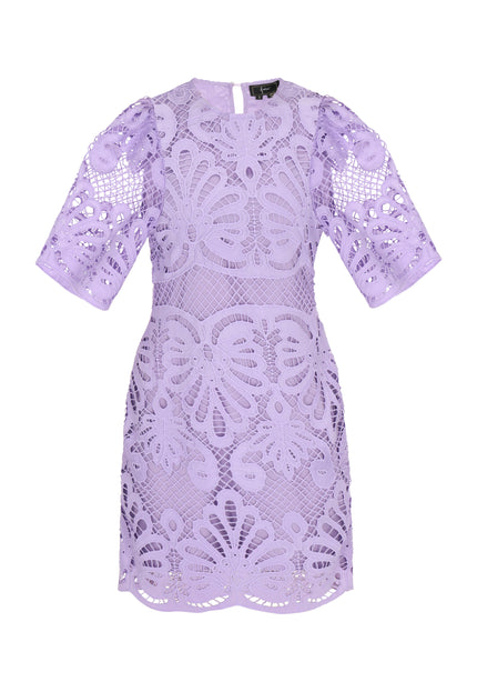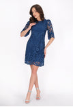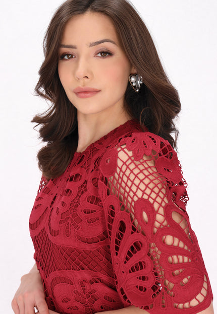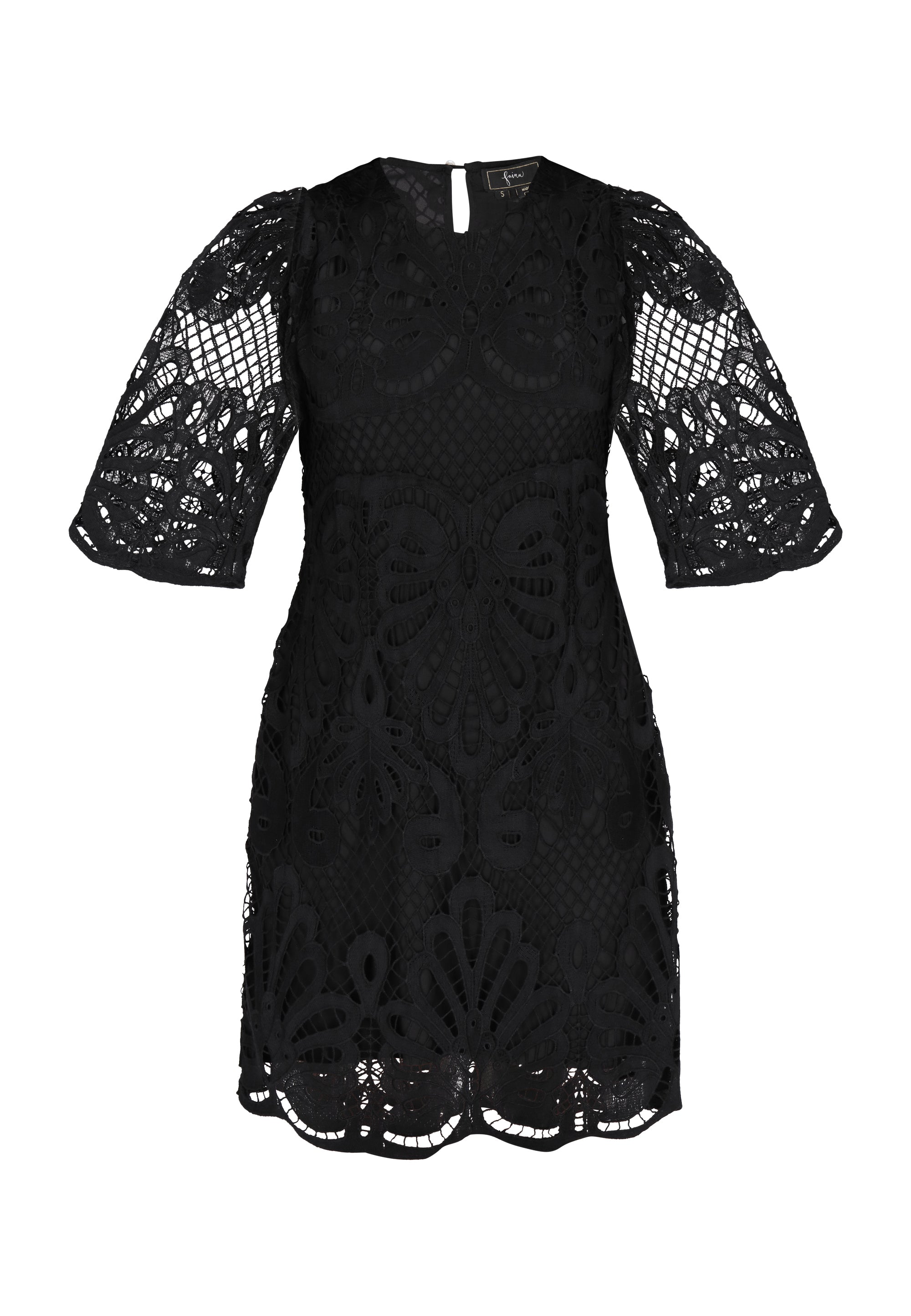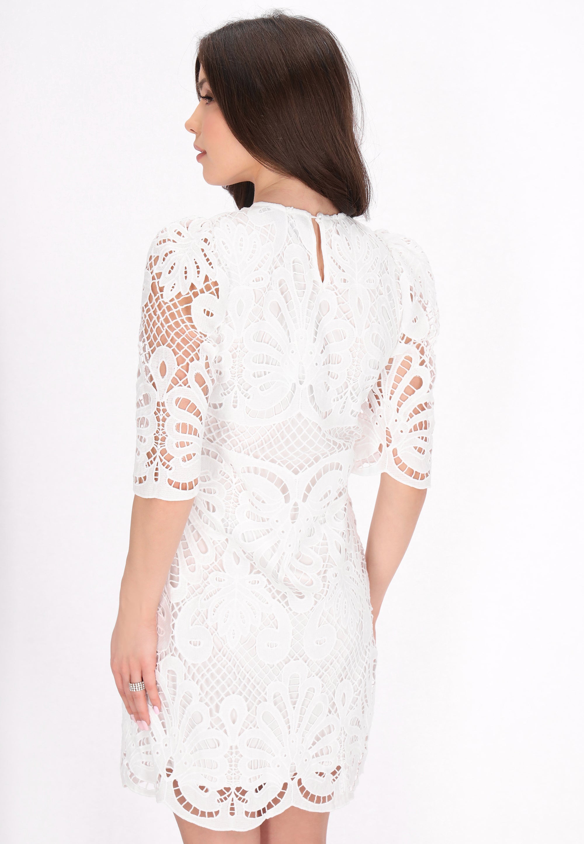 Discover this elegant mini dress from the Fashion Look Collection designed for a stylish look. Featuring a round neck and short flared sleeves, it boasts intricate embroidered patterns on woven fabric. The slim fit shape accentuates the silhouette, while floral motifs enhance its charm. Perfectly lined, this piece is ideal for events.
