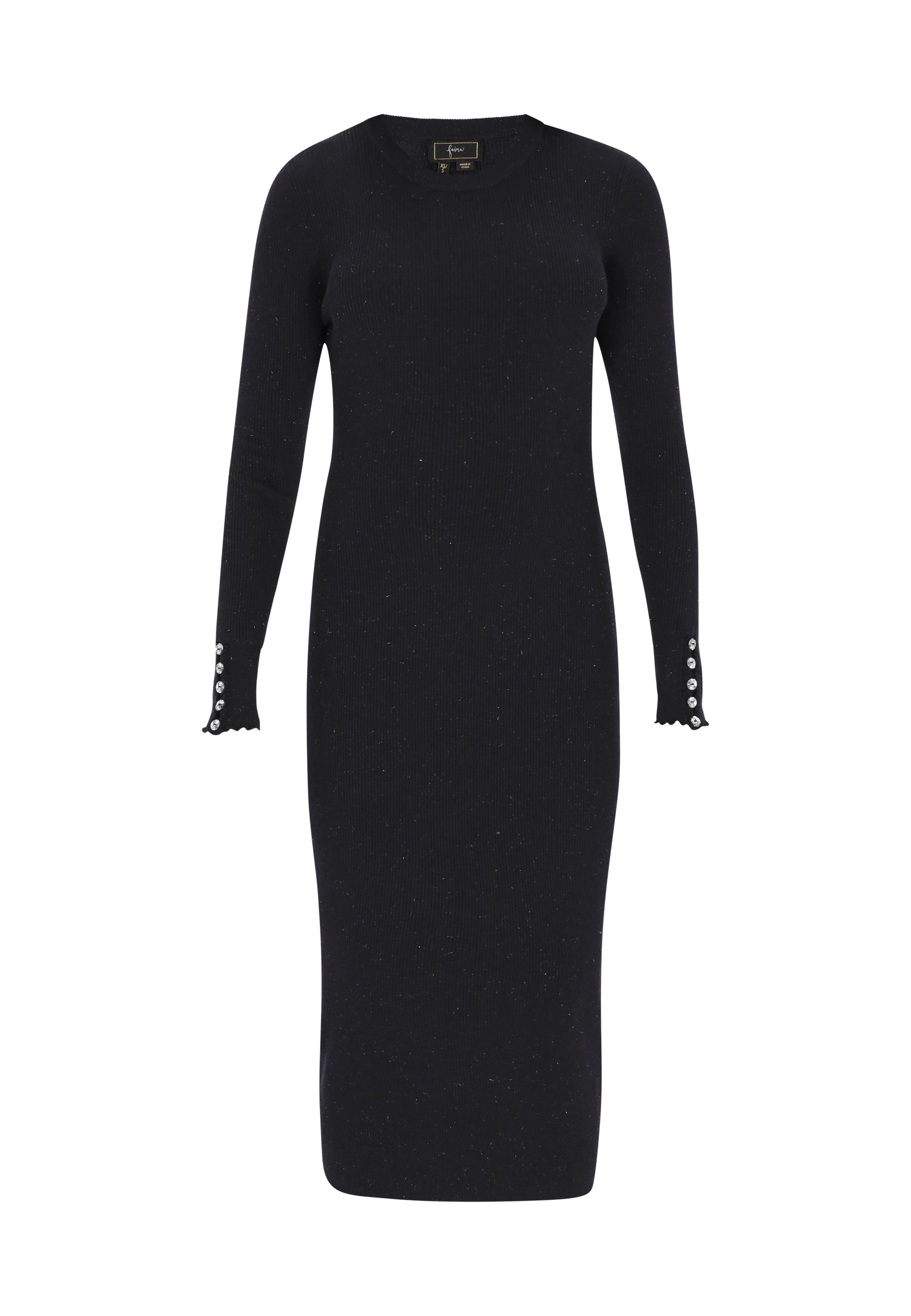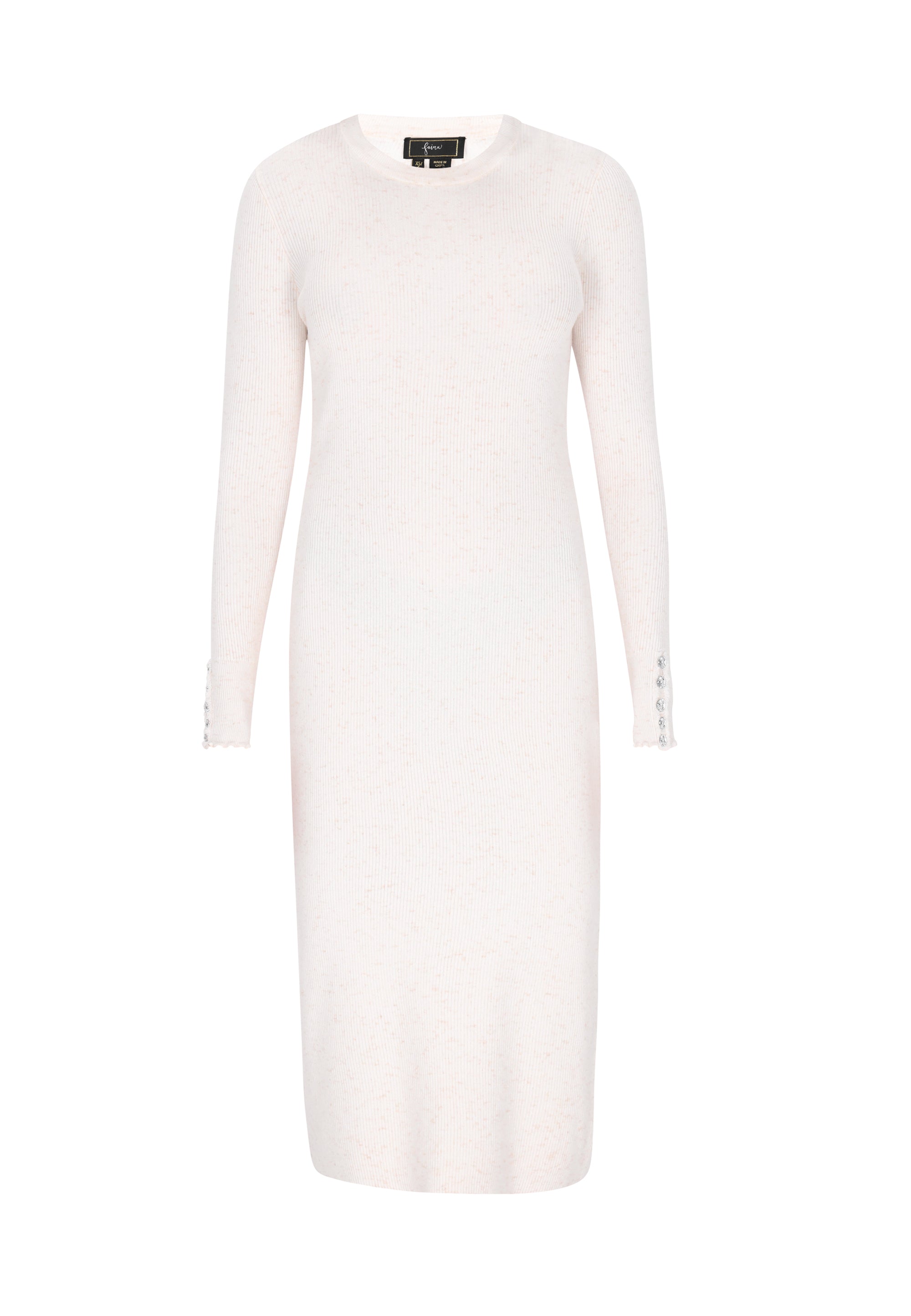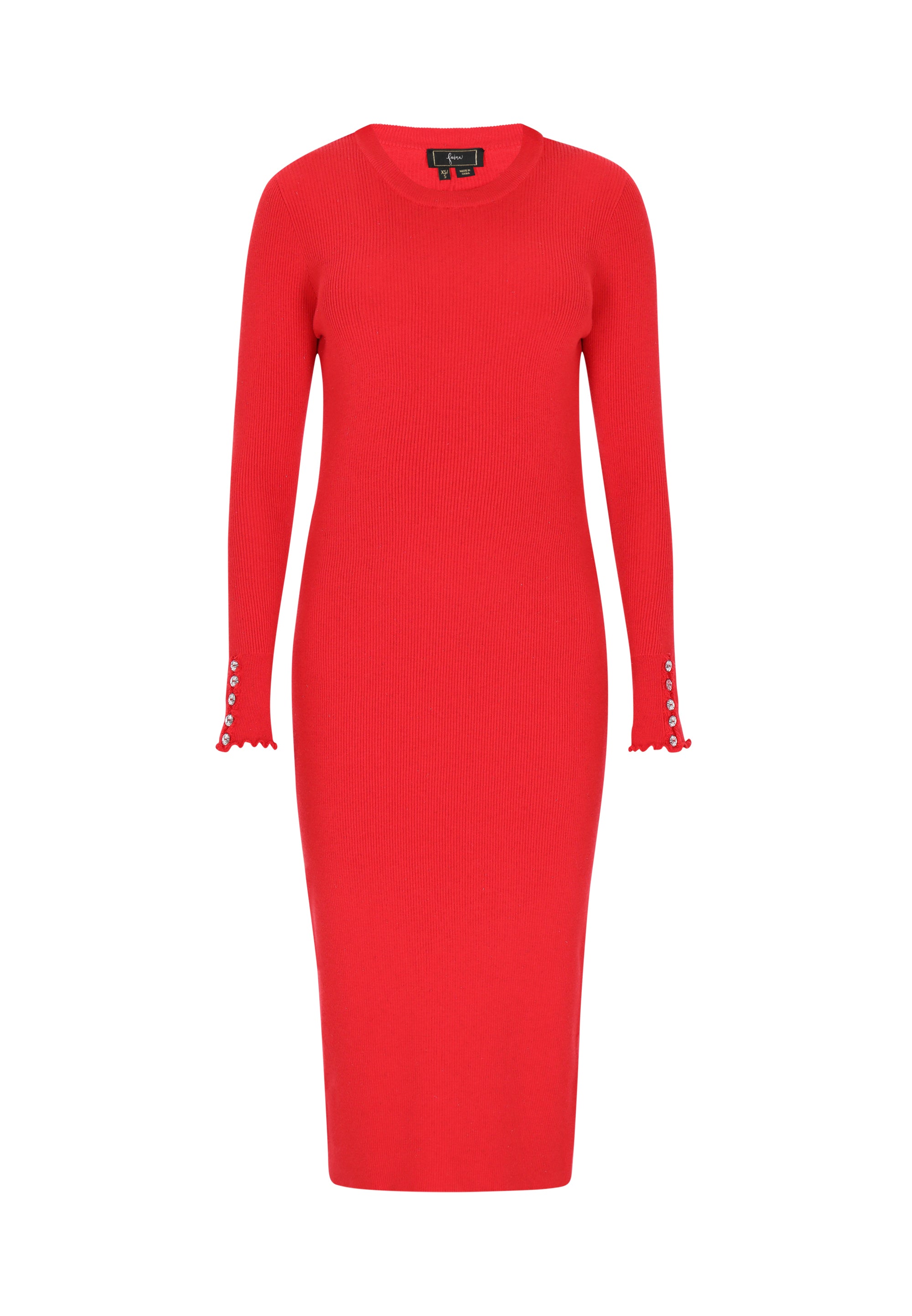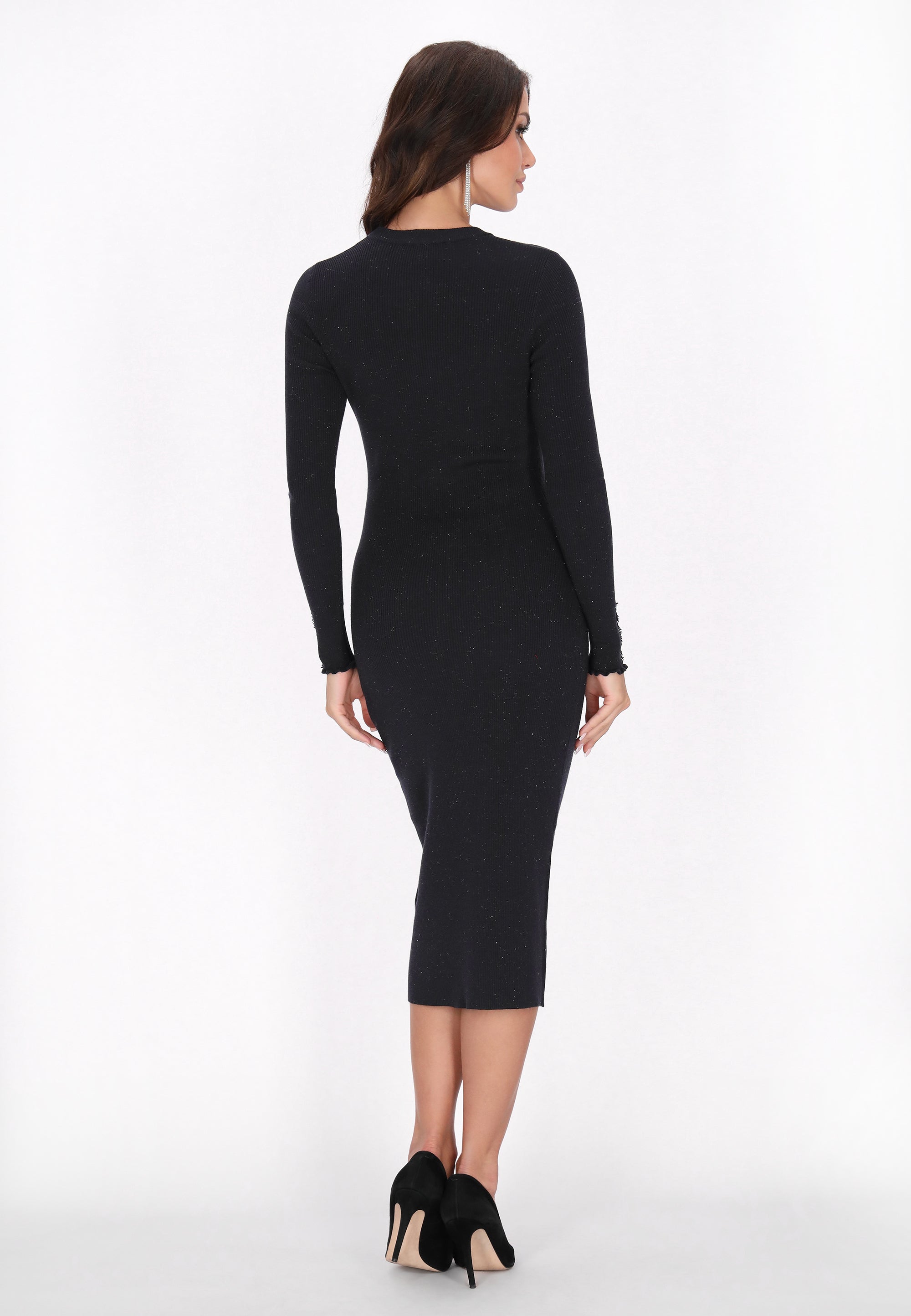 A stunning midi dress with a regular fit and an elegant round neckline. The long sleeves are embellished with a ruffled trim and decorative buttons that accentuate the ribbed texture of the knit fabric. Perfect for both casual outings and formal events, this dress from our Fashion Look Collection combines comfort with a fashionable, chic look.
