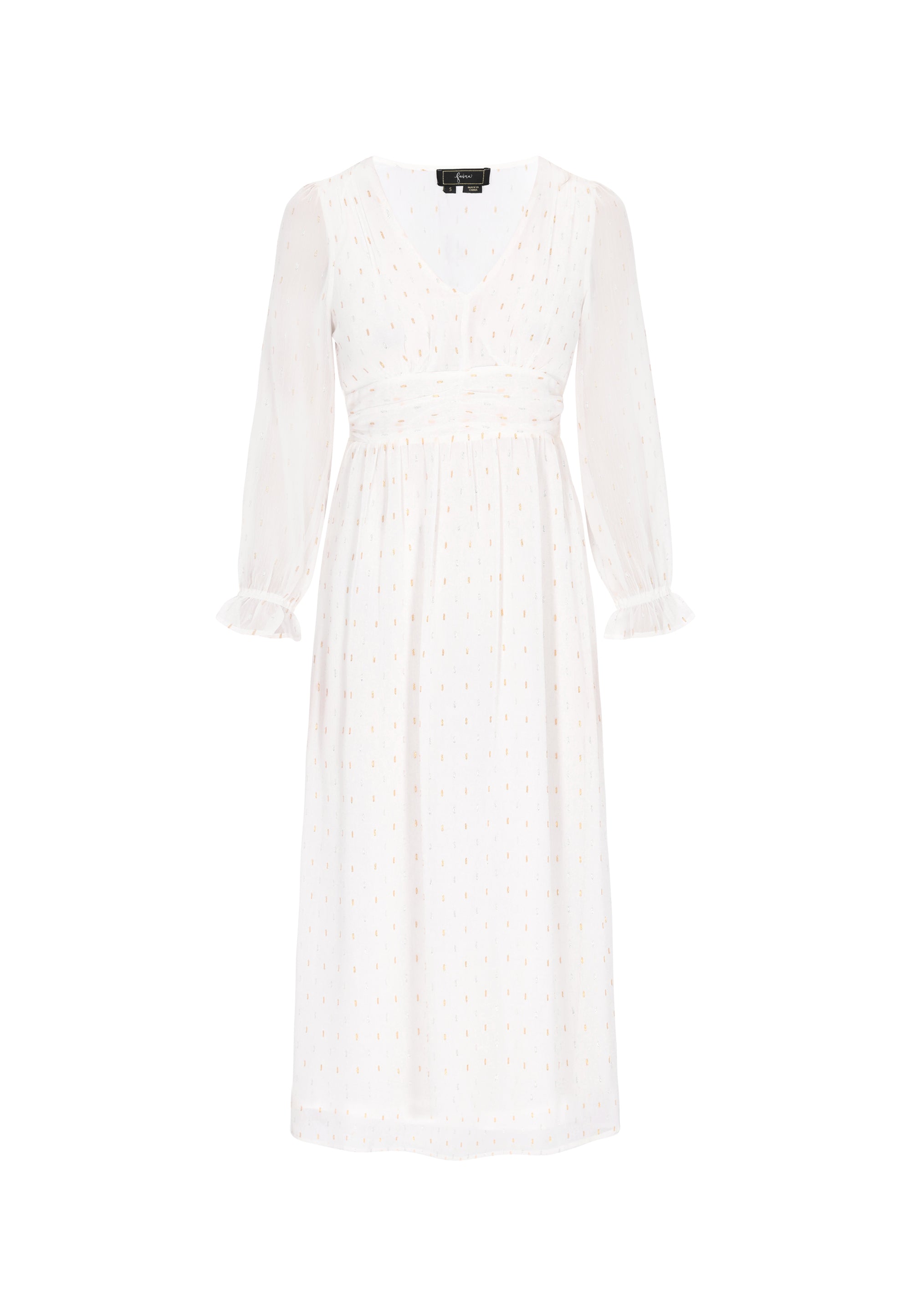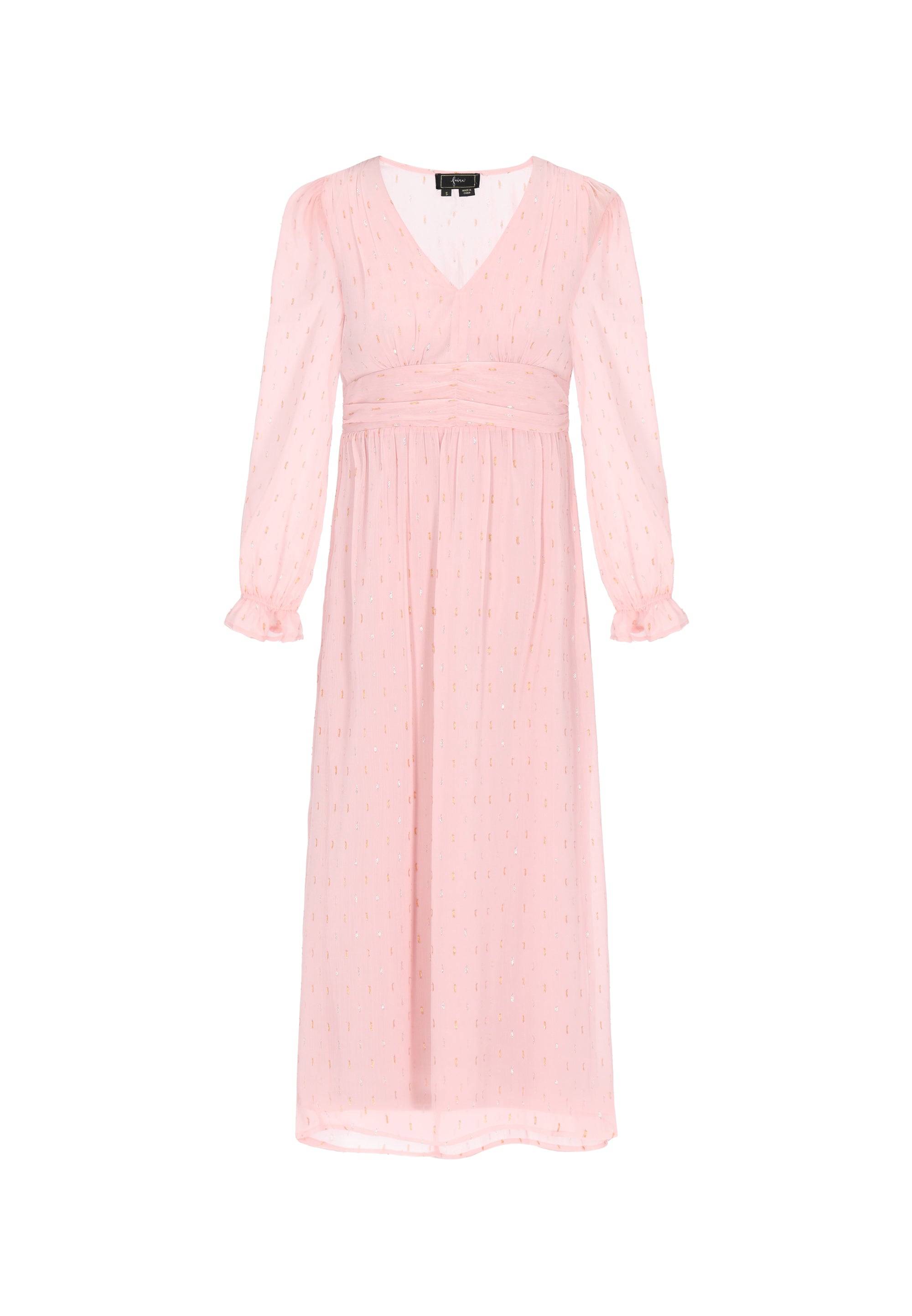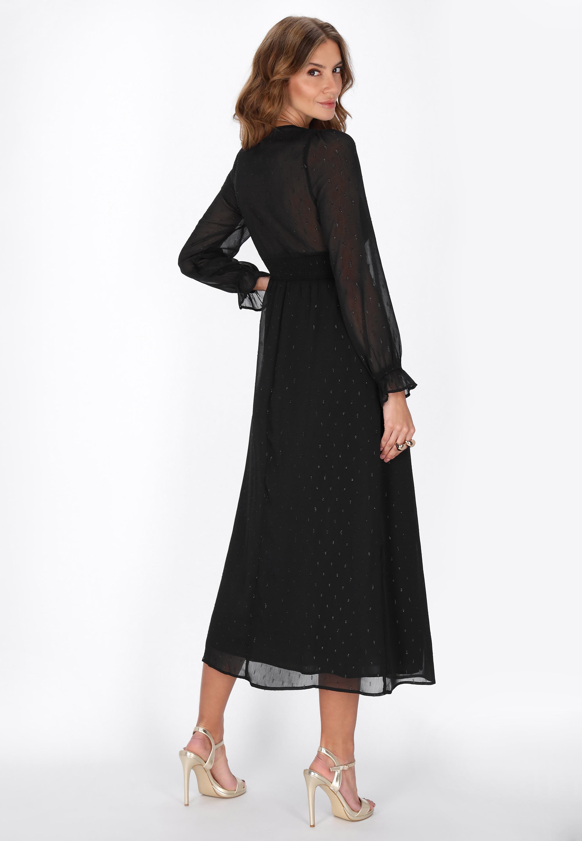 This A-line dress with a regular fit combines femininity with timeless elegance. Crafted from lightweight chiffon embellished with a subtle pattern of tiny dots, it features a V-neck, long puff sleeves with elastic cuffs, and a waist accentuated with an elastic band. The midi length lends it a classy and versatile feel, while the flowing fabric ensures comfort. Perfect for casual yet feminine outfits, this dress is part of the Fashion Look Collection.