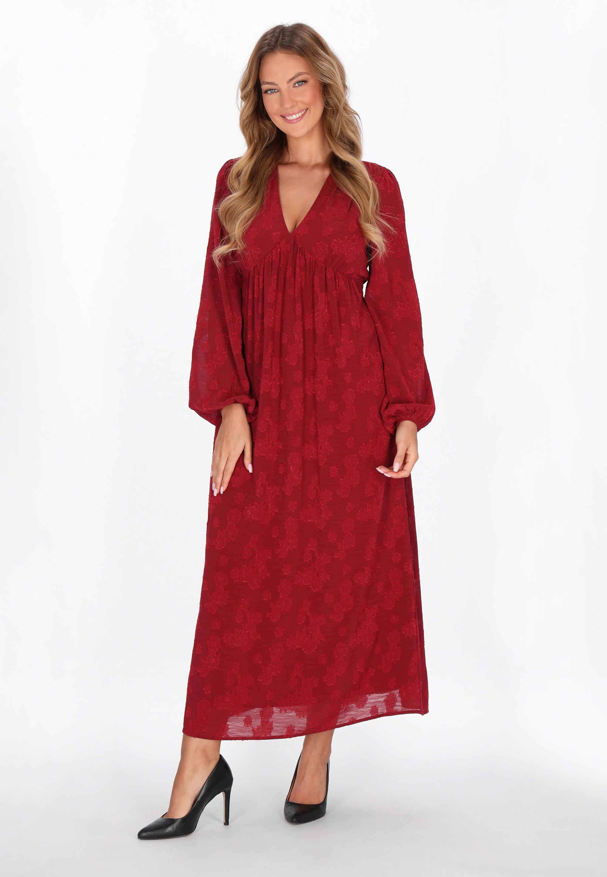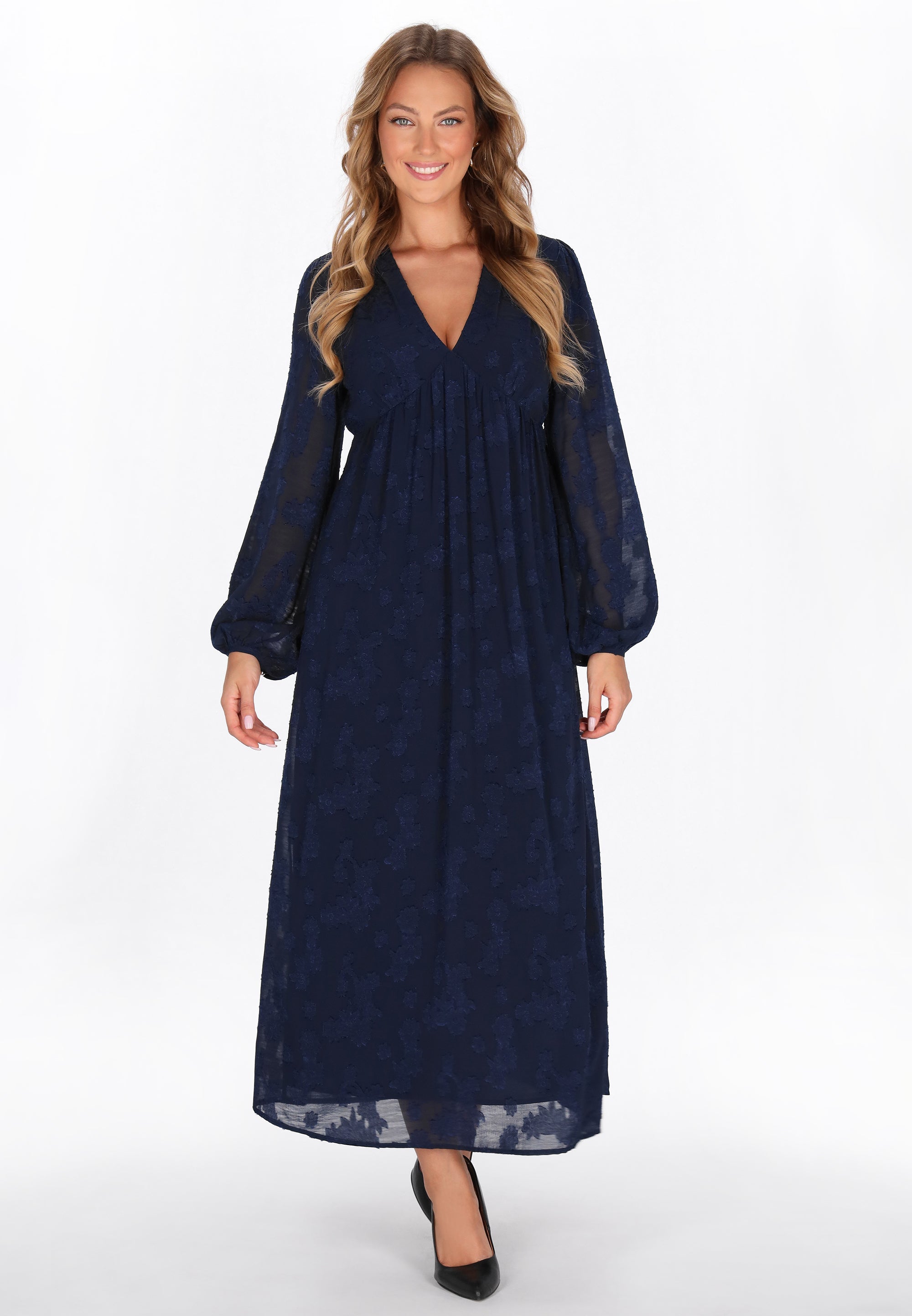 Capture effortless charm in this maxi dress from the Fashion Look Collection. Designed in a regular fit with a flattering V-neck and long puff sleeves, it features a flowing woven fabric adorned with a delicate jacquard floral pattern. The romantic silhouette and soft textures make it perfect for casual outings with a touch of elegance.