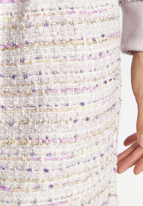 The feminine high-waist pleated shorts from faina are made from an elegant bouclé fabric and woven with gold-colored metallic yarns. Equipped with side pockets, the trousers have a slight A-line, which creates a harmonious outfit when combined with the matching jacket and elegant high heels.