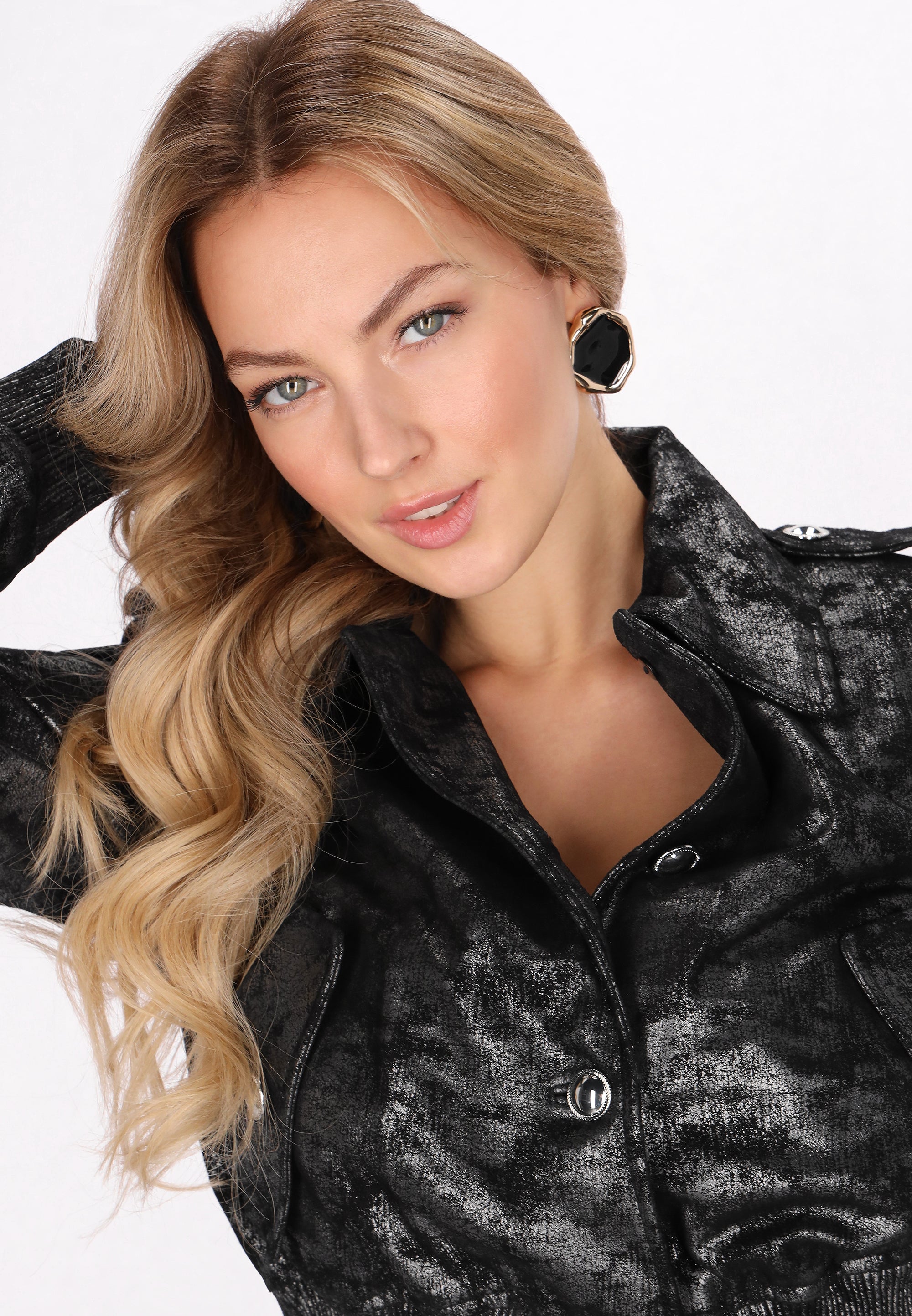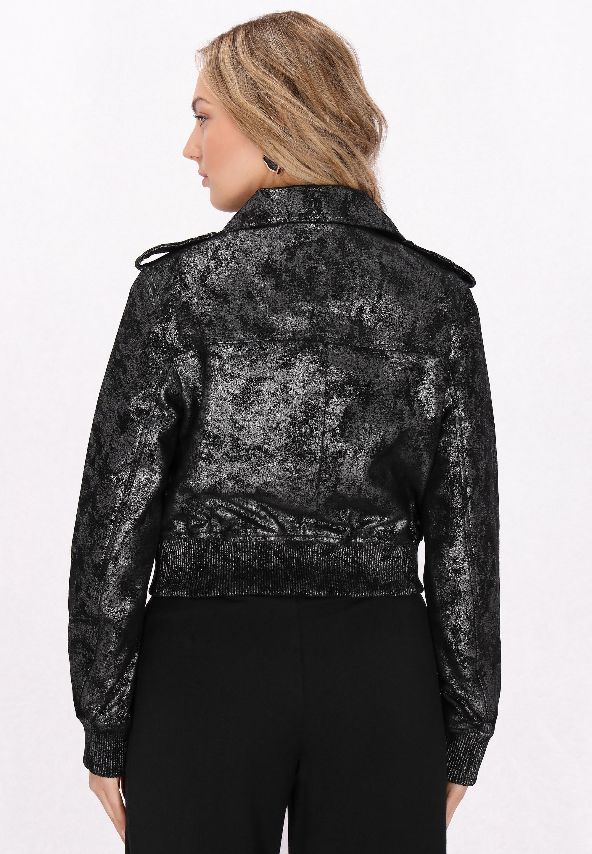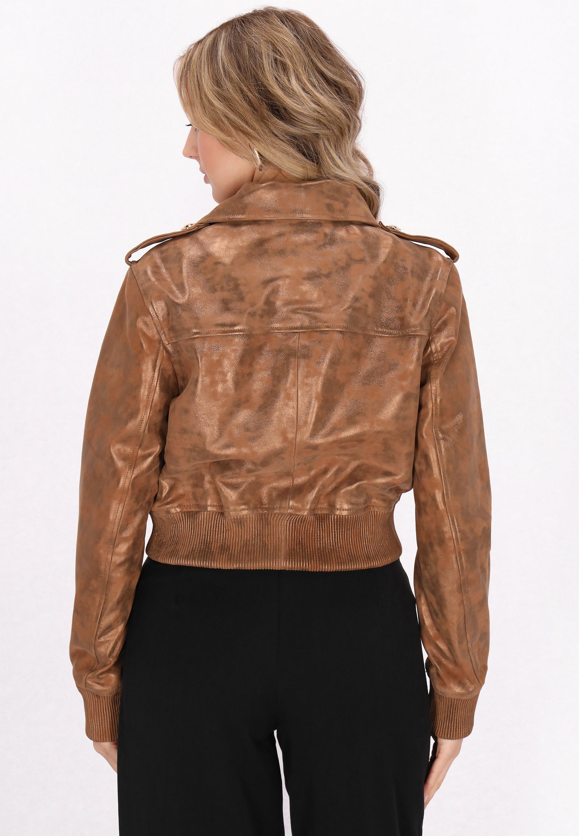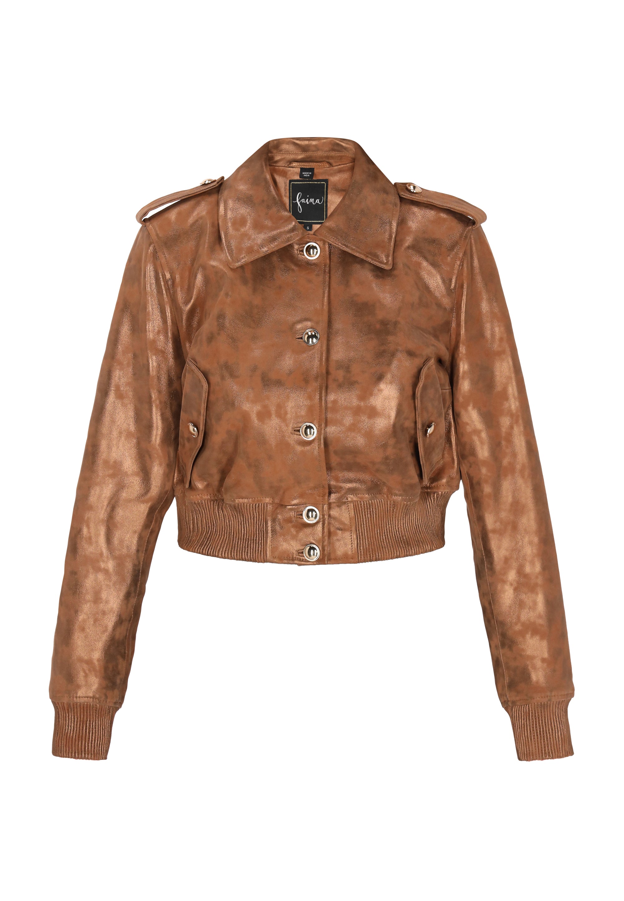 Discover this stylish leather jacket with a classic collar and long sleeves. It features a regular fit, button closure, lapels and epaulettes. The ribbed hem provides comfort, while the shiny goat suede adds a modern touch to everyday fashion. A must-have for lovers of casual chic from our Fashion Look Collection.