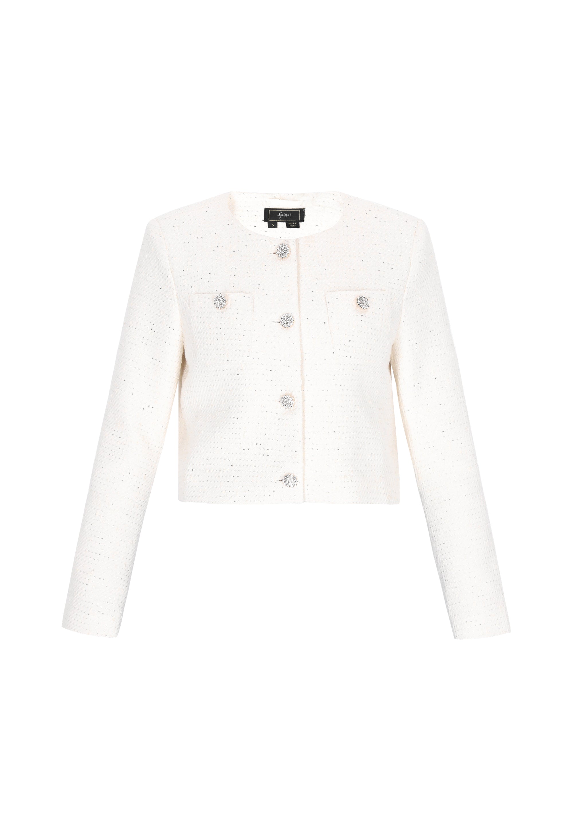 This blazer from the Fashion Look Collection is a combination of elegance and fashion statement - made for women who want to shine at any occasion. Made of tweed material, it is distinguished by its texture and subtle shine of sequins, which add to its chic and originality. Regular cut and shortened length, it beautifully accentuates the waist and adds a modern touch. The round neckline and long sleeves give it an elegant and timeless look, ideal for special events and outings. The button closure and decorative buttons add a touch of glamour and accentuate the refined details. Chest pockets add a slightly retro, yet feminine touch to the overall look. This blazer is the perfect complement to evening and cocktail styling - it combines fashion, elegance and distinctiveness.