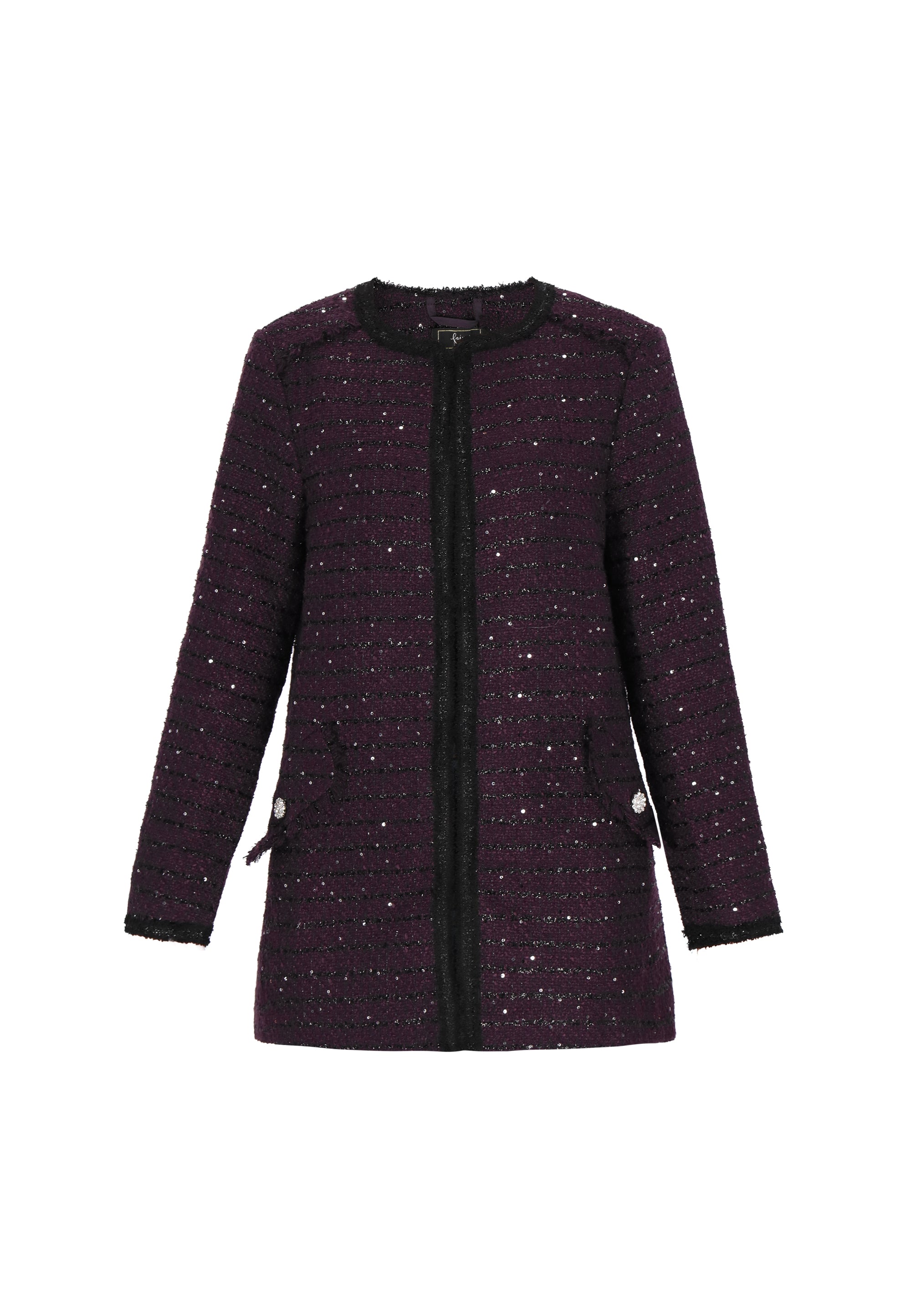 Opt for glamour and elegance with the unique blazer from the Fashion Look Collection, which perfectly combines classics with a fashionable touch of glamour. Made of bouclé fabric with glittering thread and sequins, it impresses with its texture and subtle shine that draws the eye. It presents a regular fit, round neckline and long sleeves. The hook-and-eye closure provides a smooth front line, emphasizing the elegant character of the whole. The blazer is decorated with a decorative ribbon and decorative buttons, which add a chic touch. Flap pockets provide a practical yet stylish finishing touch. Perfect for events, parties and evening outings - this blazer is an option for women who want to shine with class.
