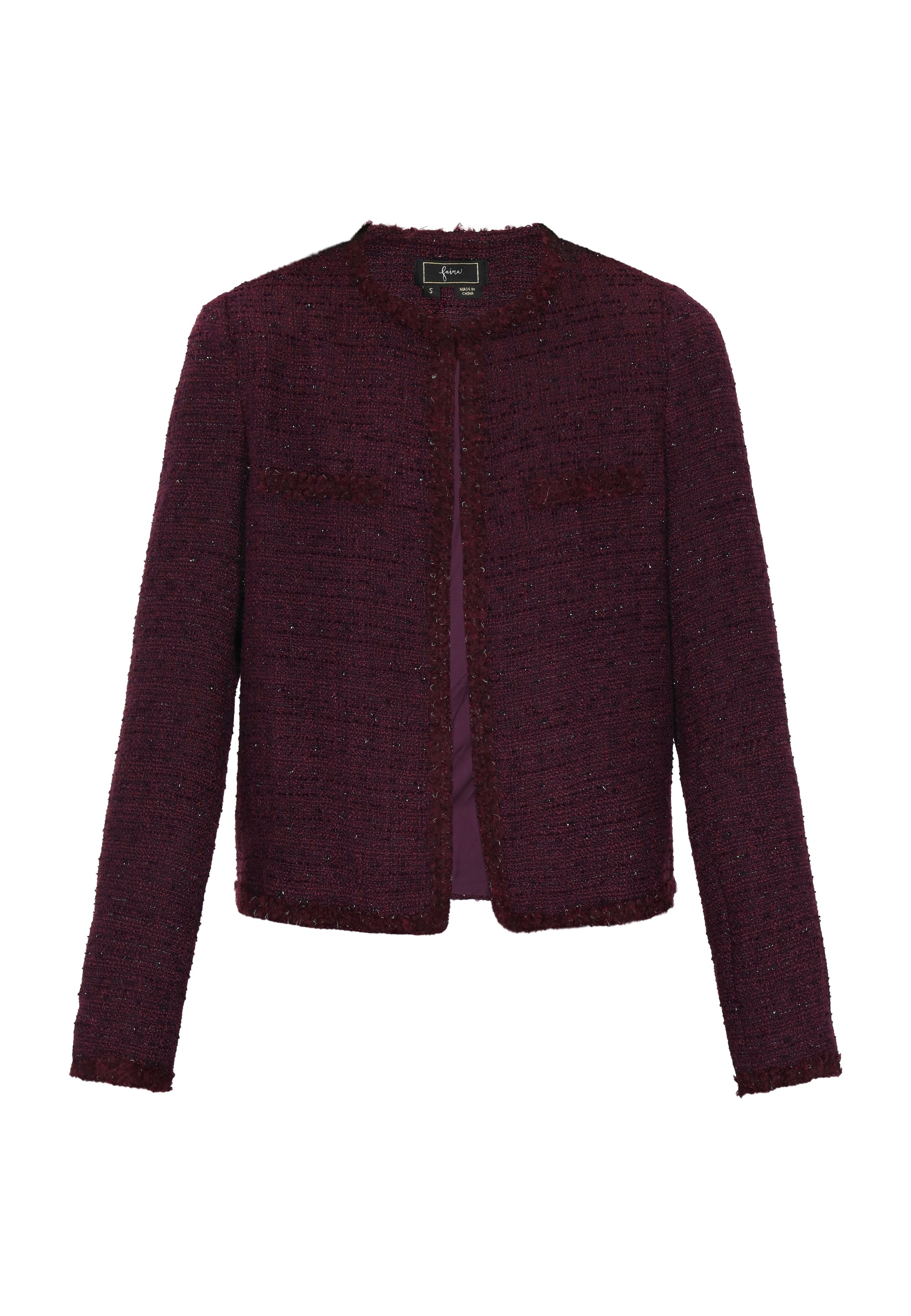 Keyword: bouclé, chic, decorative trim, elegant, fashion look collection, hook closure, jacket, long sleeves, metallic thread, regular fit, round neck, textured pattern, timeless
