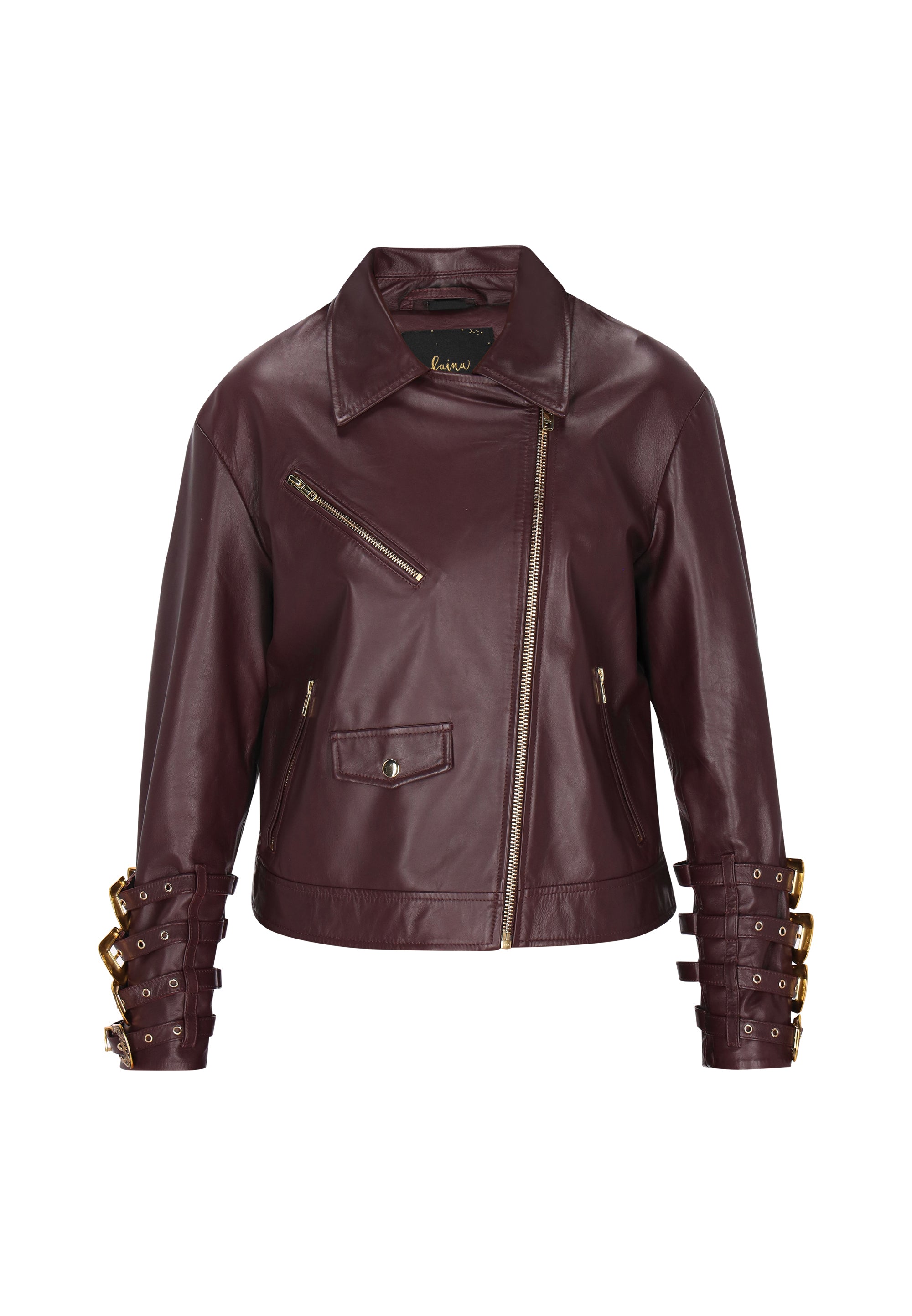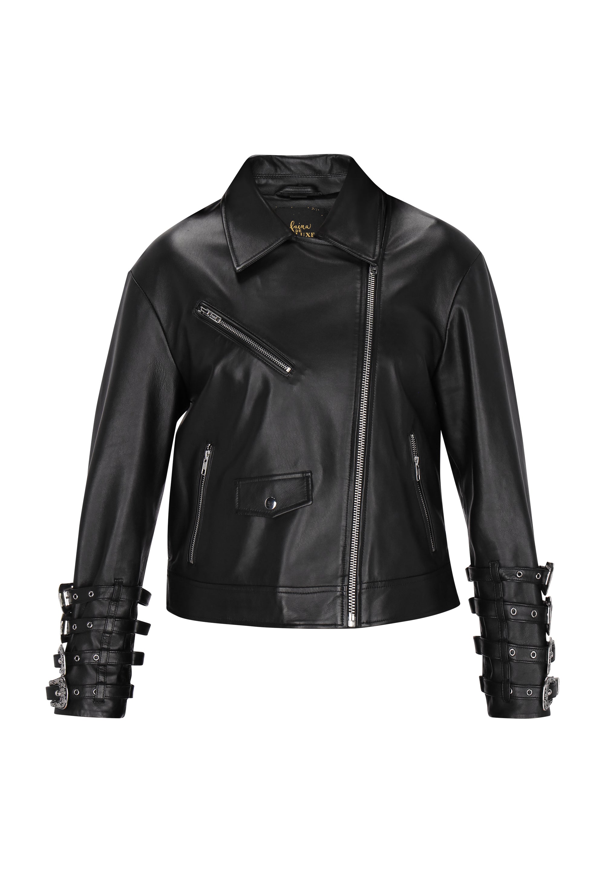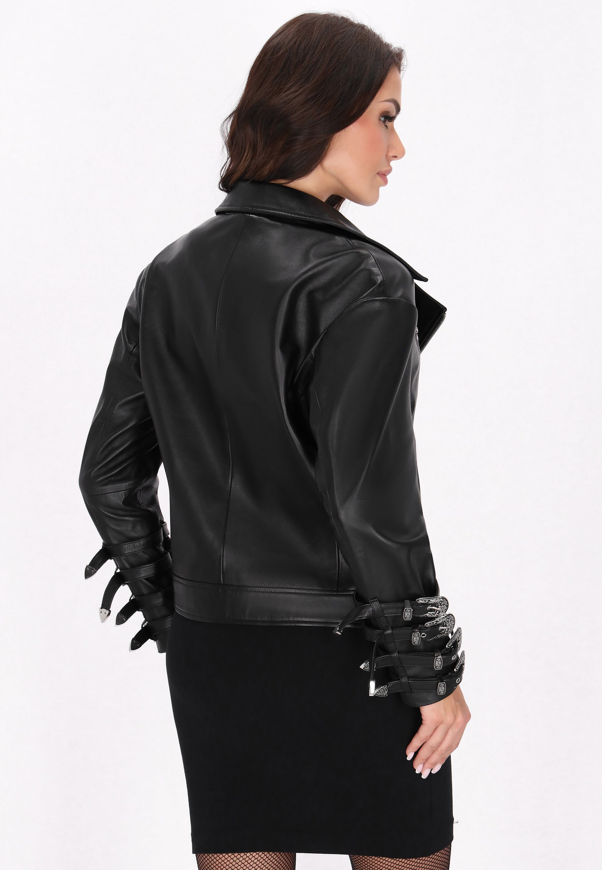 Keyword: biker jacket, buckles, casual, classic, edgy, fashion look collection, lamb leather, lapel collar, long sleeves, plain pattern, relaxed fit, stylish, v neck, zipper, zippered pockets