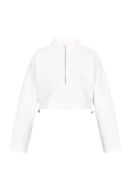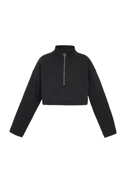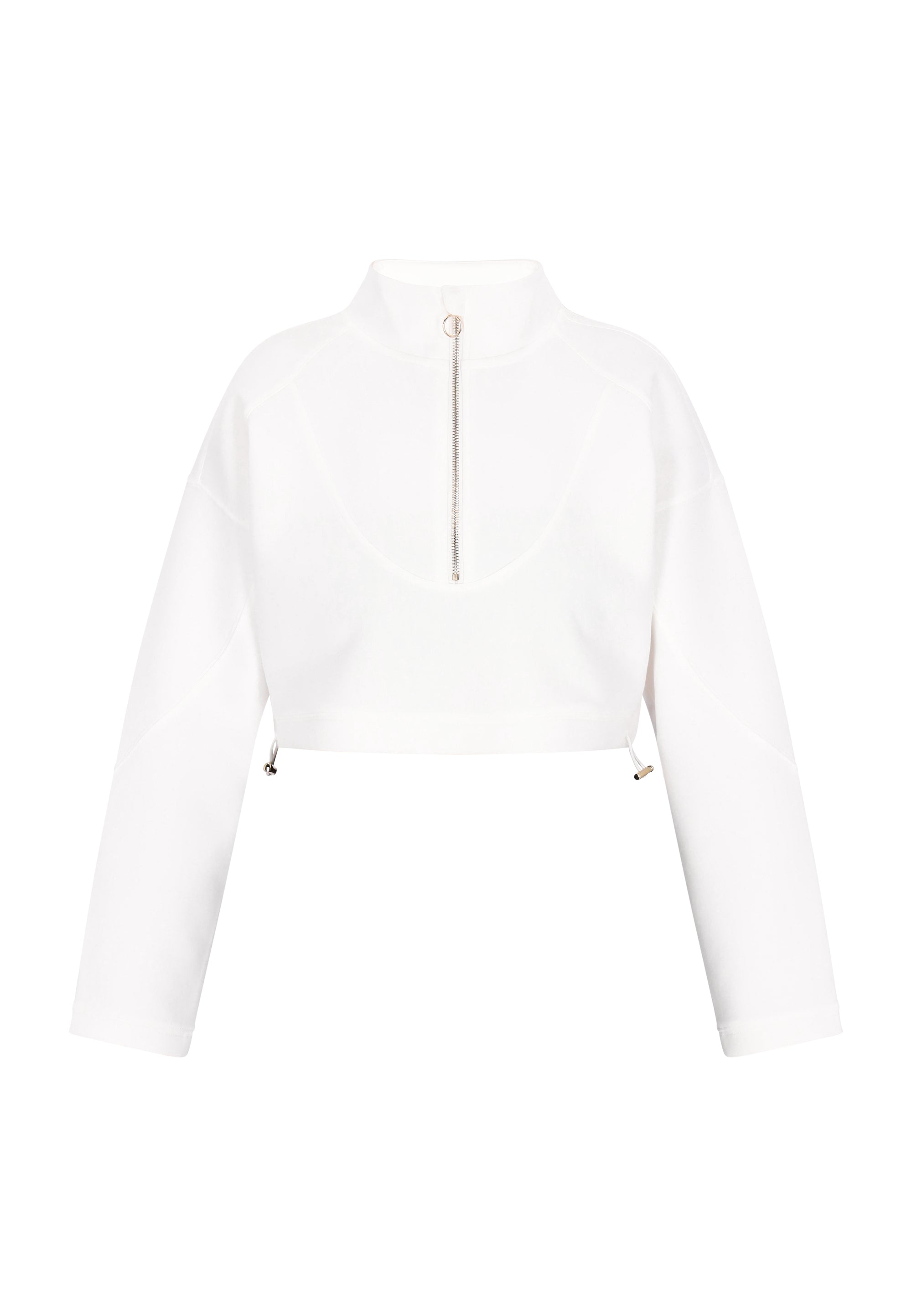 Introducing a stylish cropped sweatshirt with a stand-up collar and zipper closure. The drop shoulder design enhances comfort, while the long sleeves provide a relaxed fit. Unique stitching and chasers at the bottom make this knit sweatshirt ideal for casual wear or light sports. It is part of the Comfortable Collection.