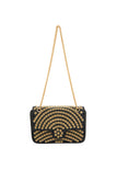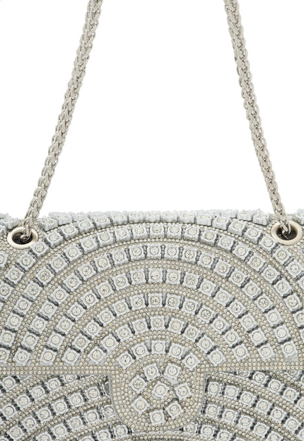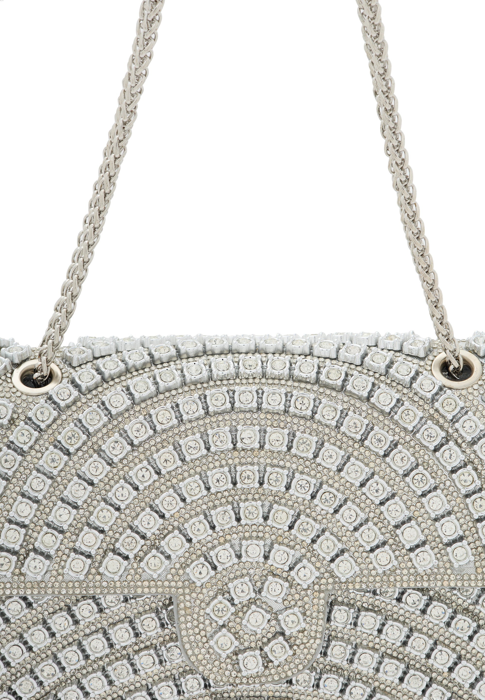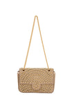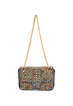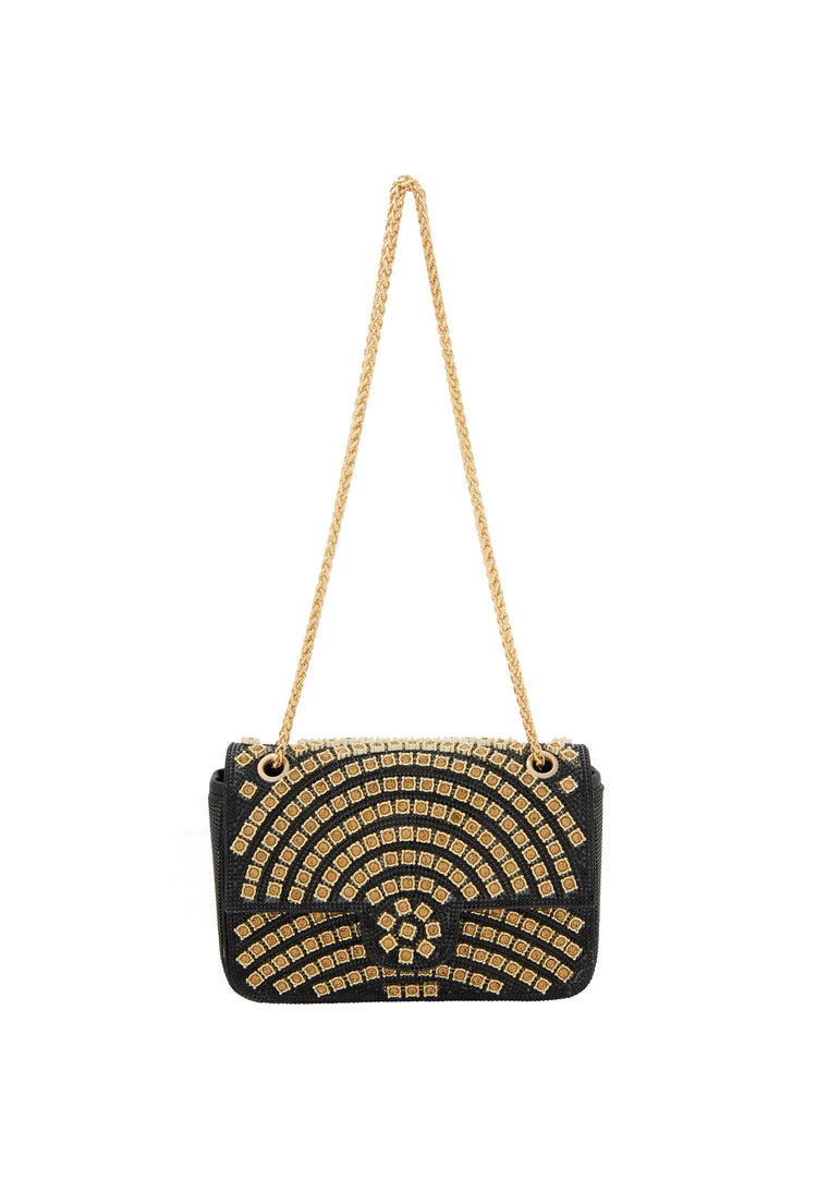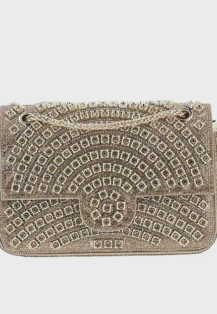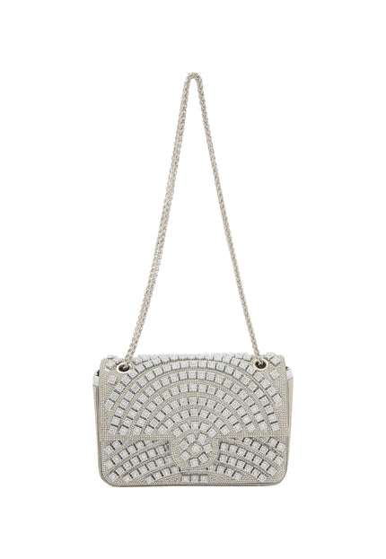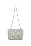 Enhance your style with this structured rectangular flap bag featuring a chic chain strap for versatile wear. Adorned with a stunning diamond pattern of small square embellishments, it radiates elegance. The textured surface elevates its appeal, while the inner pocket ensures you can carry essentials effortlessly for any elegant occasion.