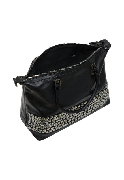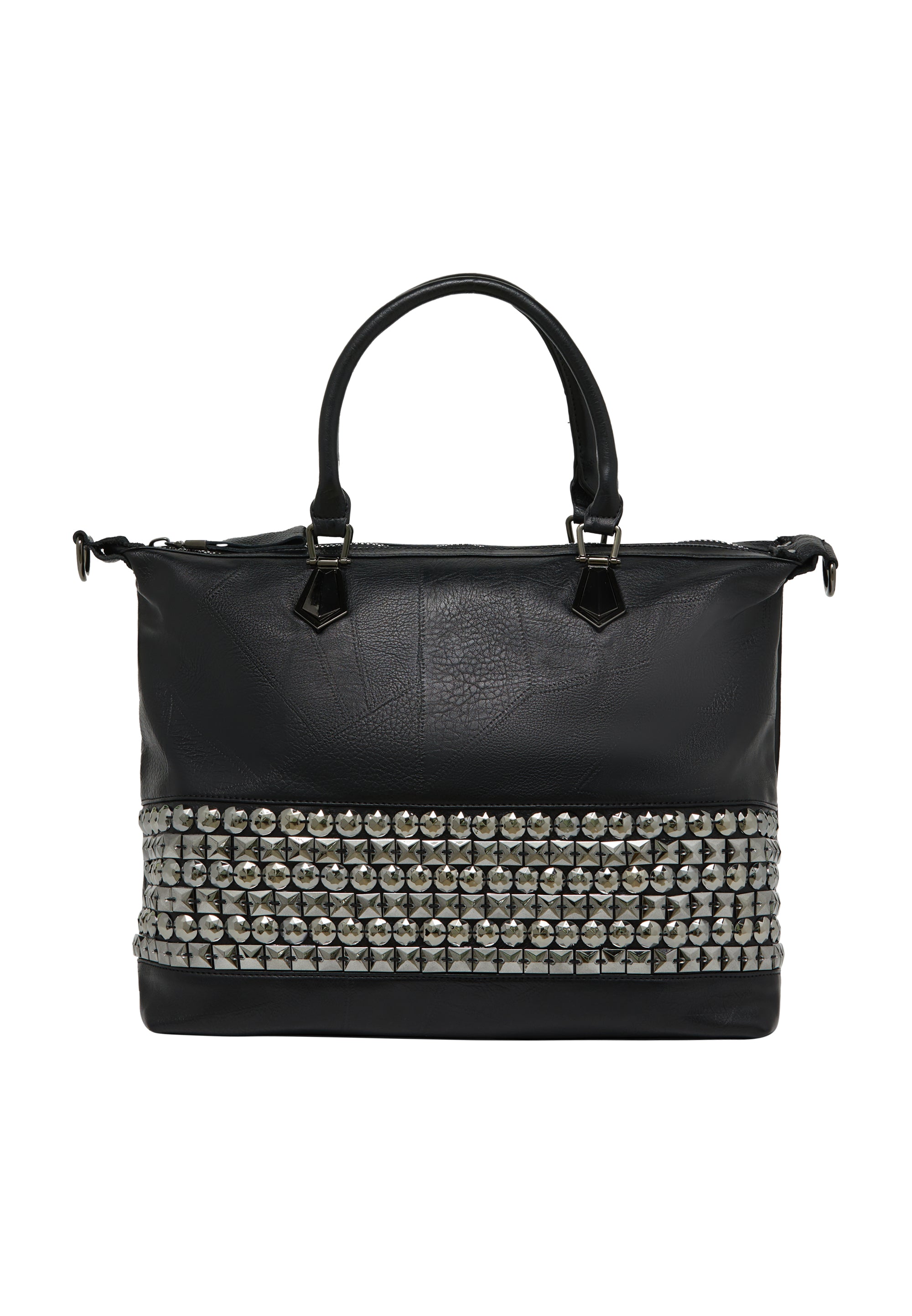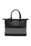 Elevate your style with this structured silhouette handbag featuring a top handle for versatile carrying options. The plain color pattern is complemented by a textured exterior and horizontal band of studs, creating a bold statement. With three compartments and a secure zipper closure, its perfect for any casual occasion while ensuring functionality.