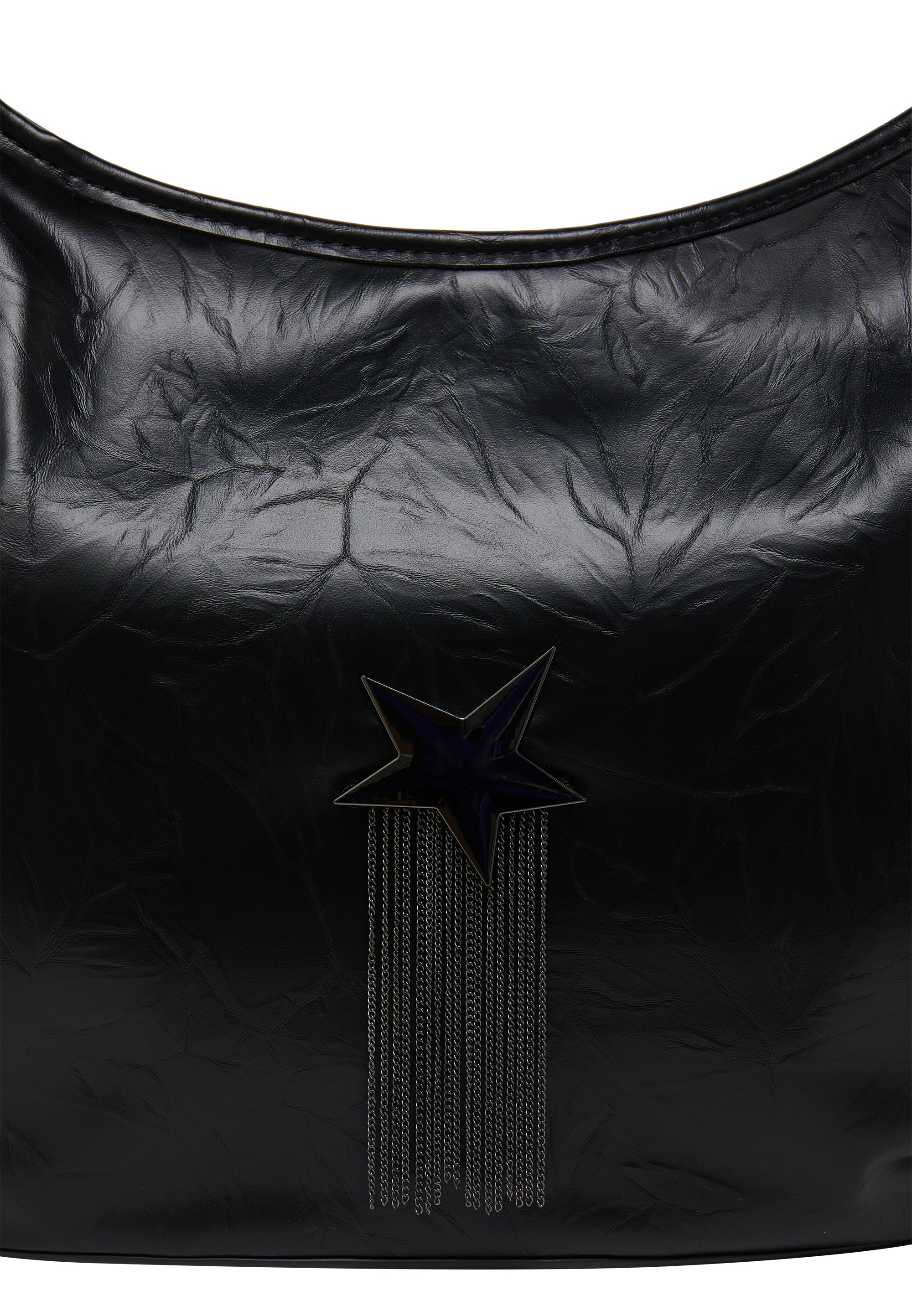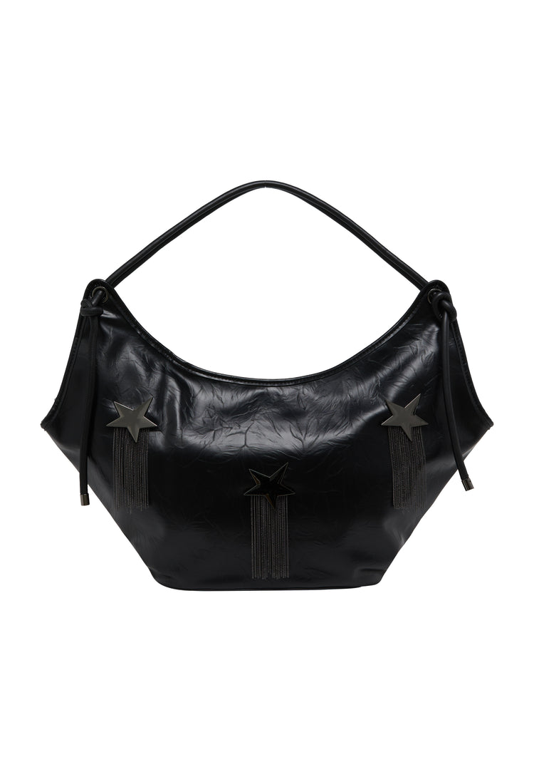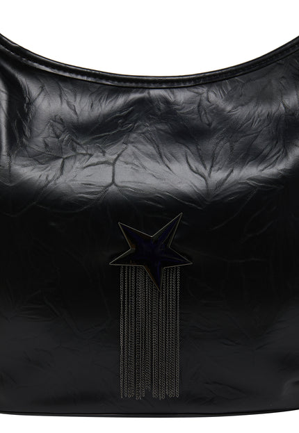 Unveil a hobo bag with a soft, rounded silhouette and a single shoulder strap for easy carrying. Featuring star-shaped decorative elements on the front with cascading strands, this plain color patterned handbag boasts an inner pocket and zipper closure for casual occasions. Functional yet stylish, it seamlessly blends practicality with a chic aesthetic.