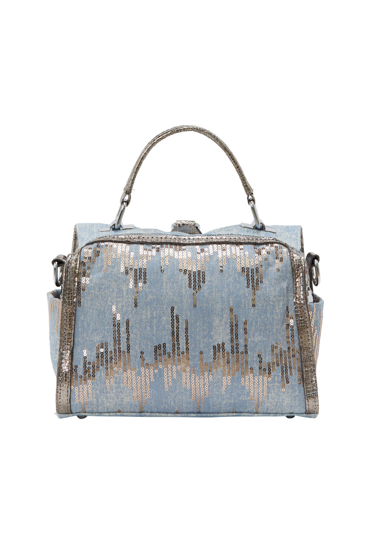 Discover a stylish handbag designed with a top handle for effortless carrying. This piece features a main compartment secured by zipper closure, providing access to a zippered inner pocket for added convenience. With its plain color pattern and shiny discs creating texture, this bag is perfect for casual occasions while ensuring durability and elegance.