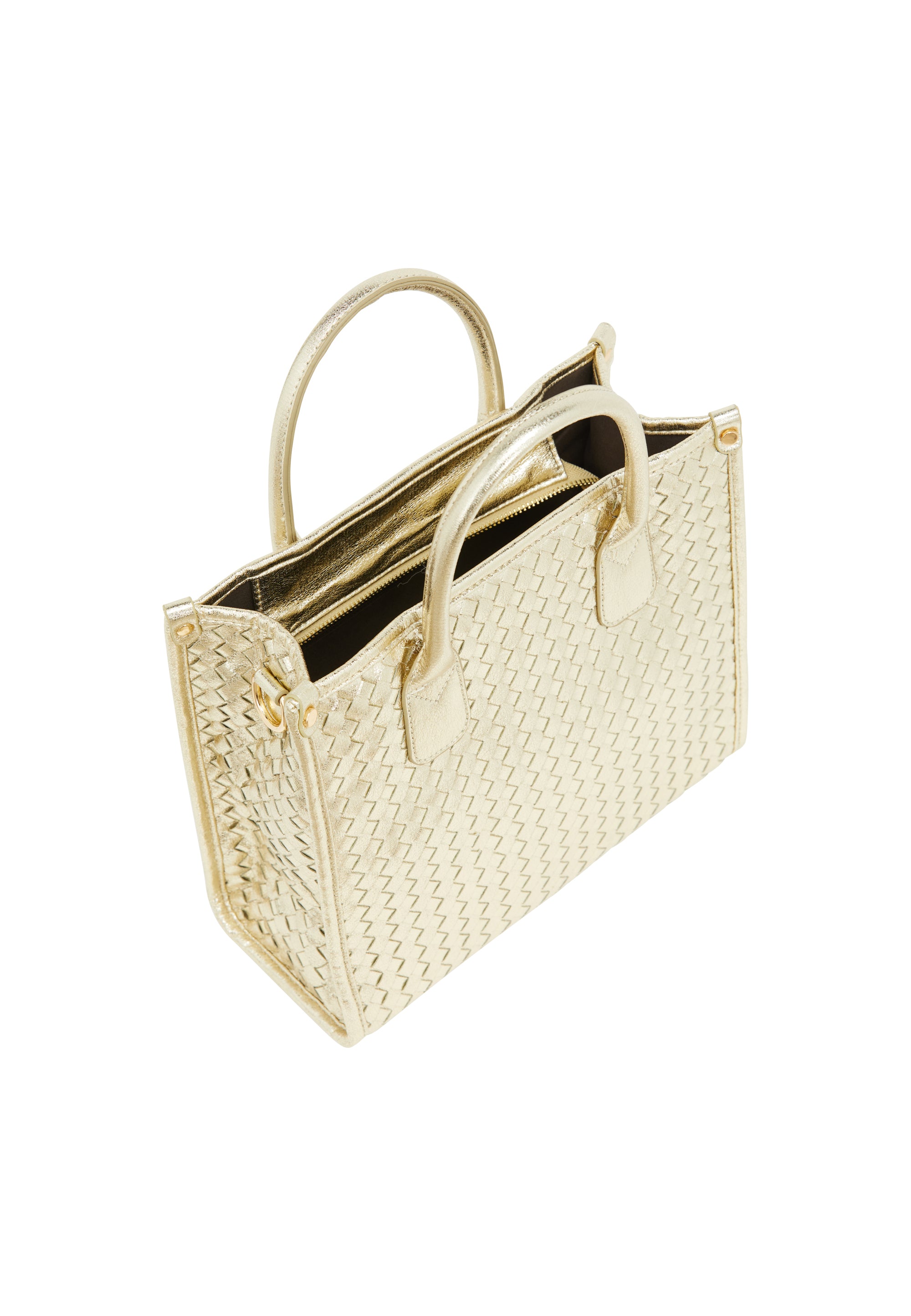 Elevate your style with this structured tote bag, designed with a rectangular shape and flat base for stability. The exterior showcases a chic braided pattern, while the zipper closure ensures security. Inside, find a spacious compartment complete with a zippered inner pocket and an additional strap for versatilityideal for both daytime outings and evening events.