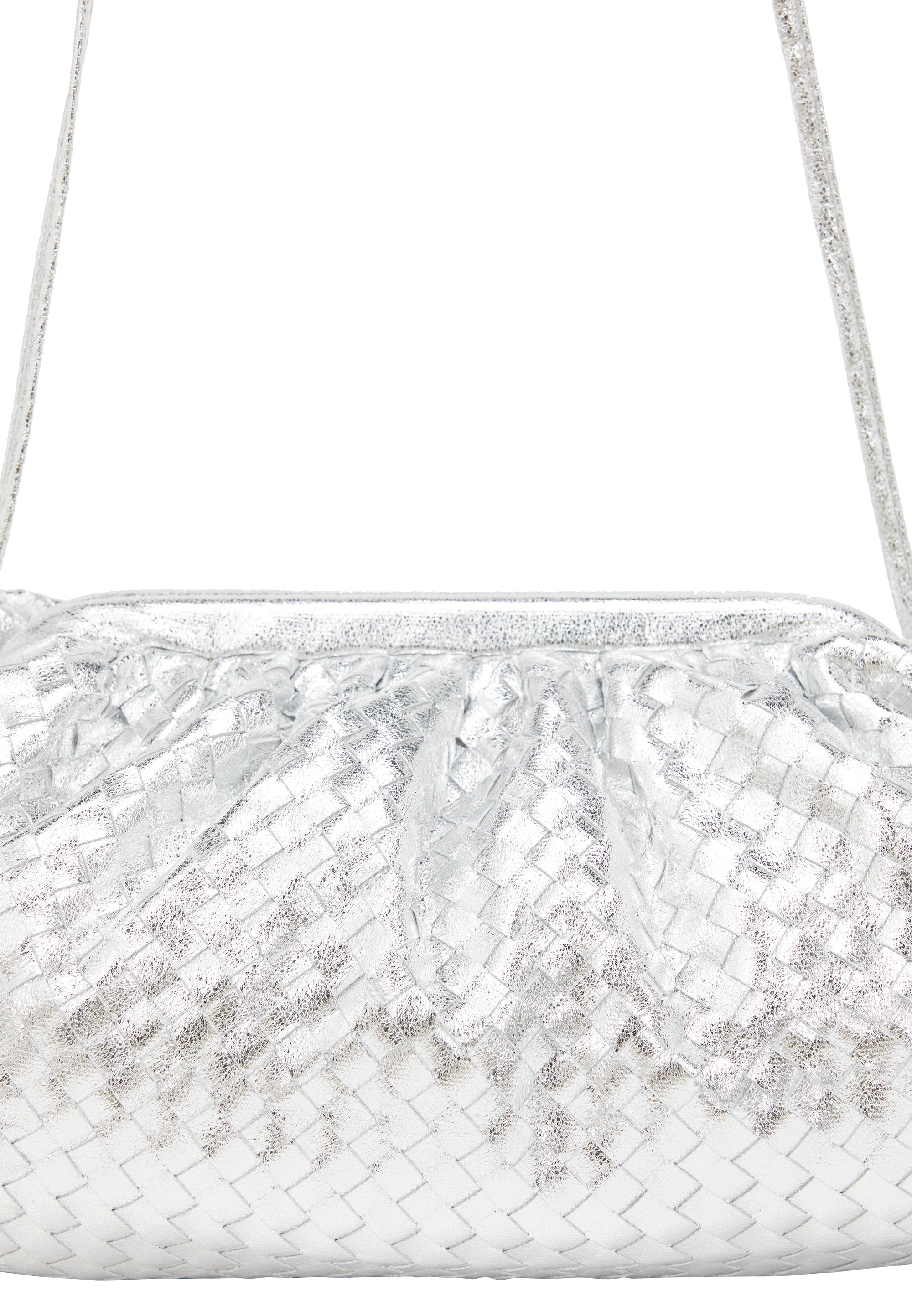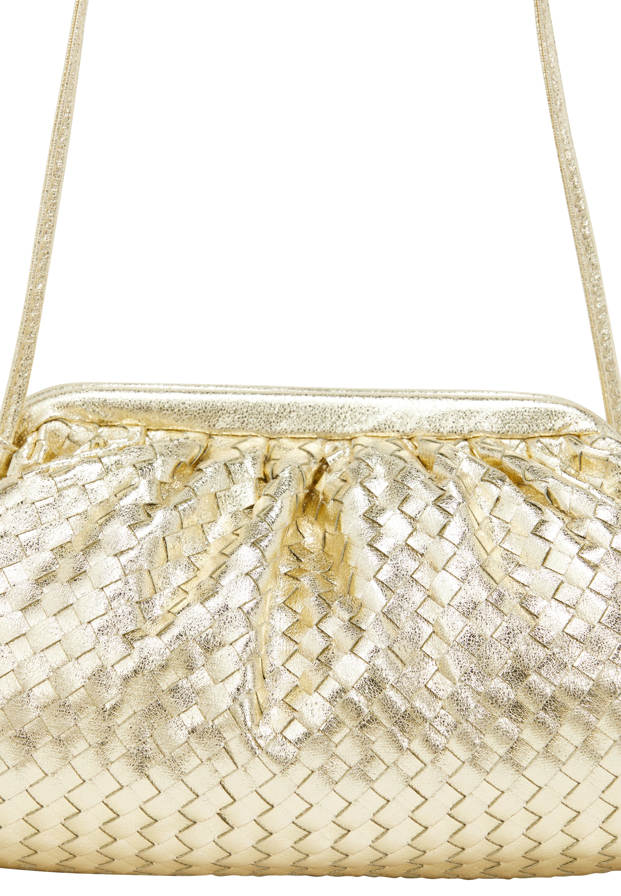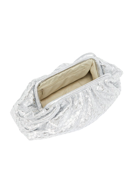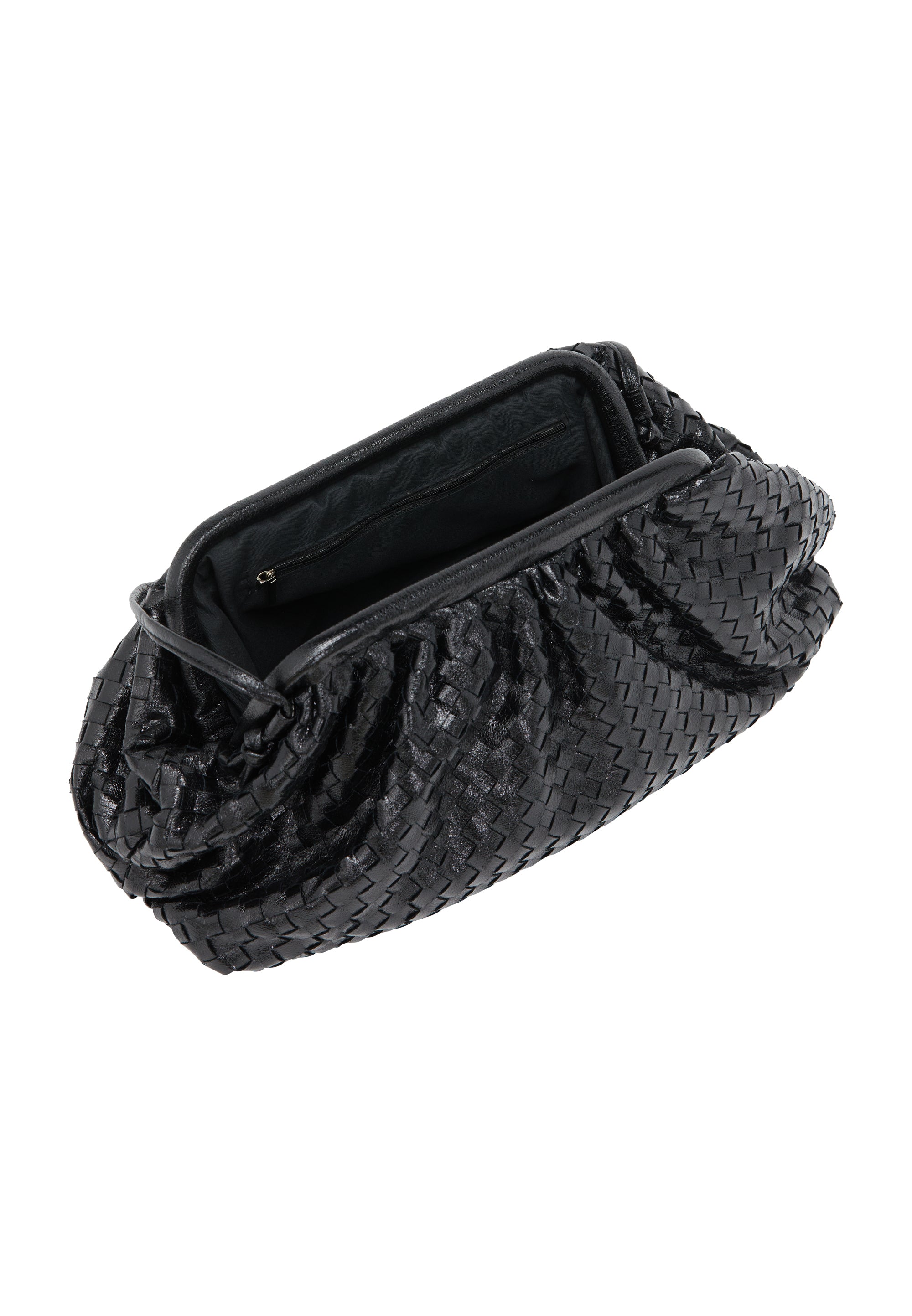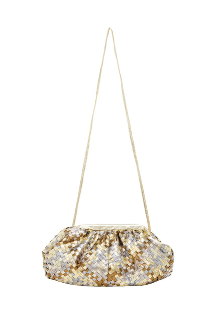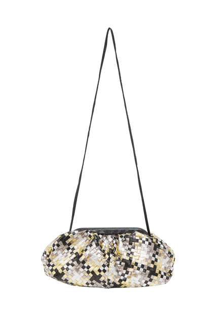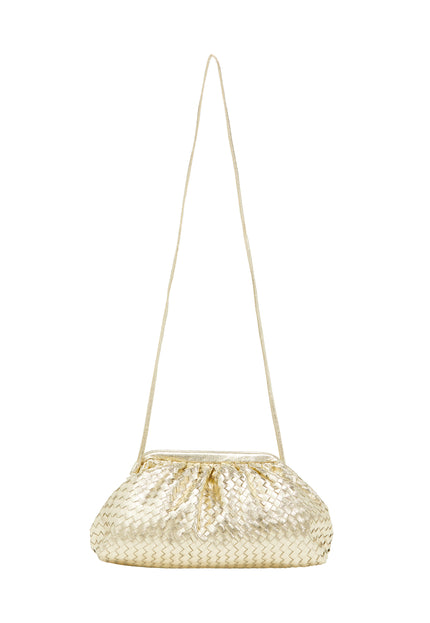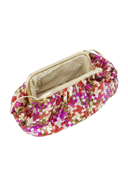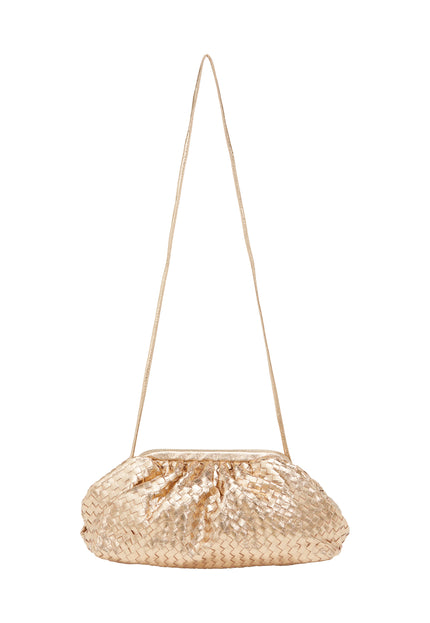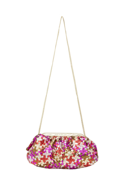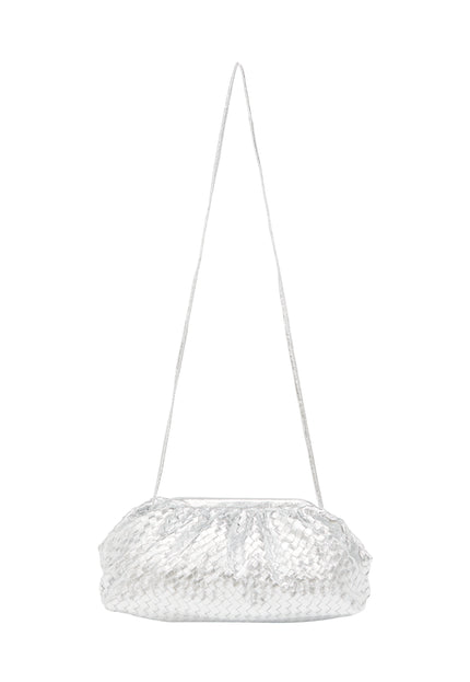 Discover this stylish clutch featuring a unique braided pattern that adds charm to any outfit. With its rounded silhouette and gathered top, it offers a whimsical touch. The decorative closure enhances its appeal, while the detachable strap provides versatility for crossbody or shoulder wear. Inside, a zippered inner pocket ensures secure storage for your essentials, making it perfect for evening events.