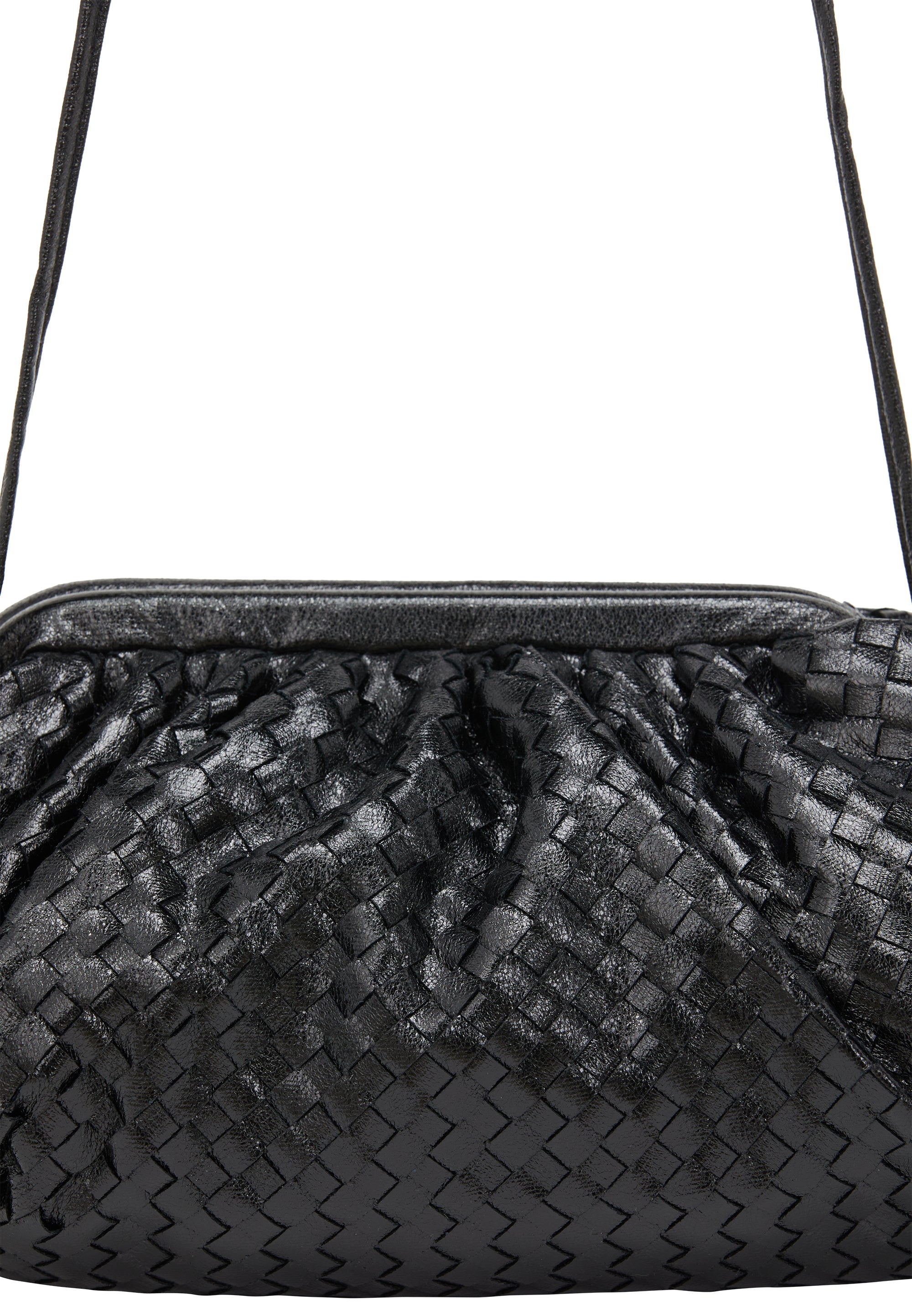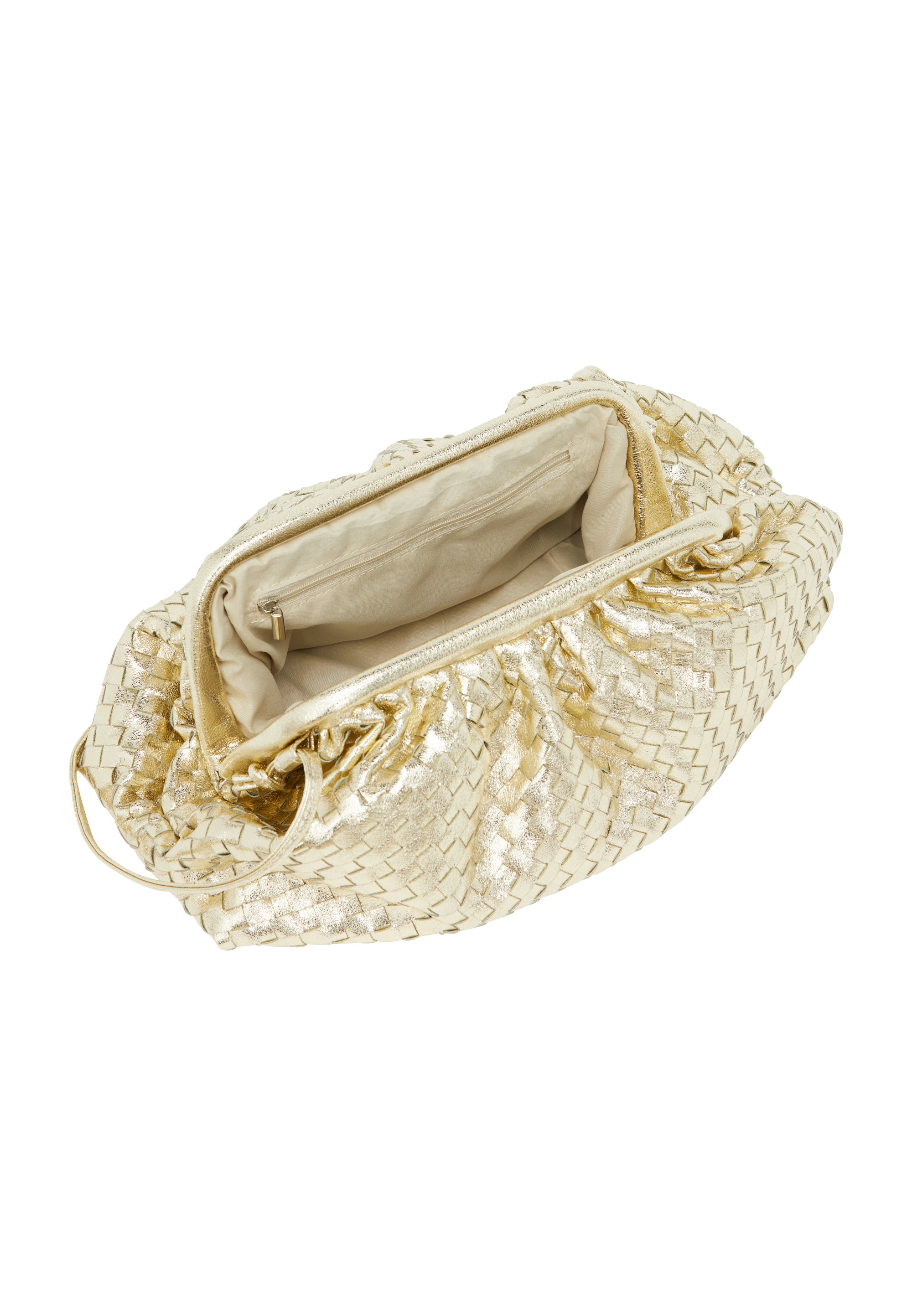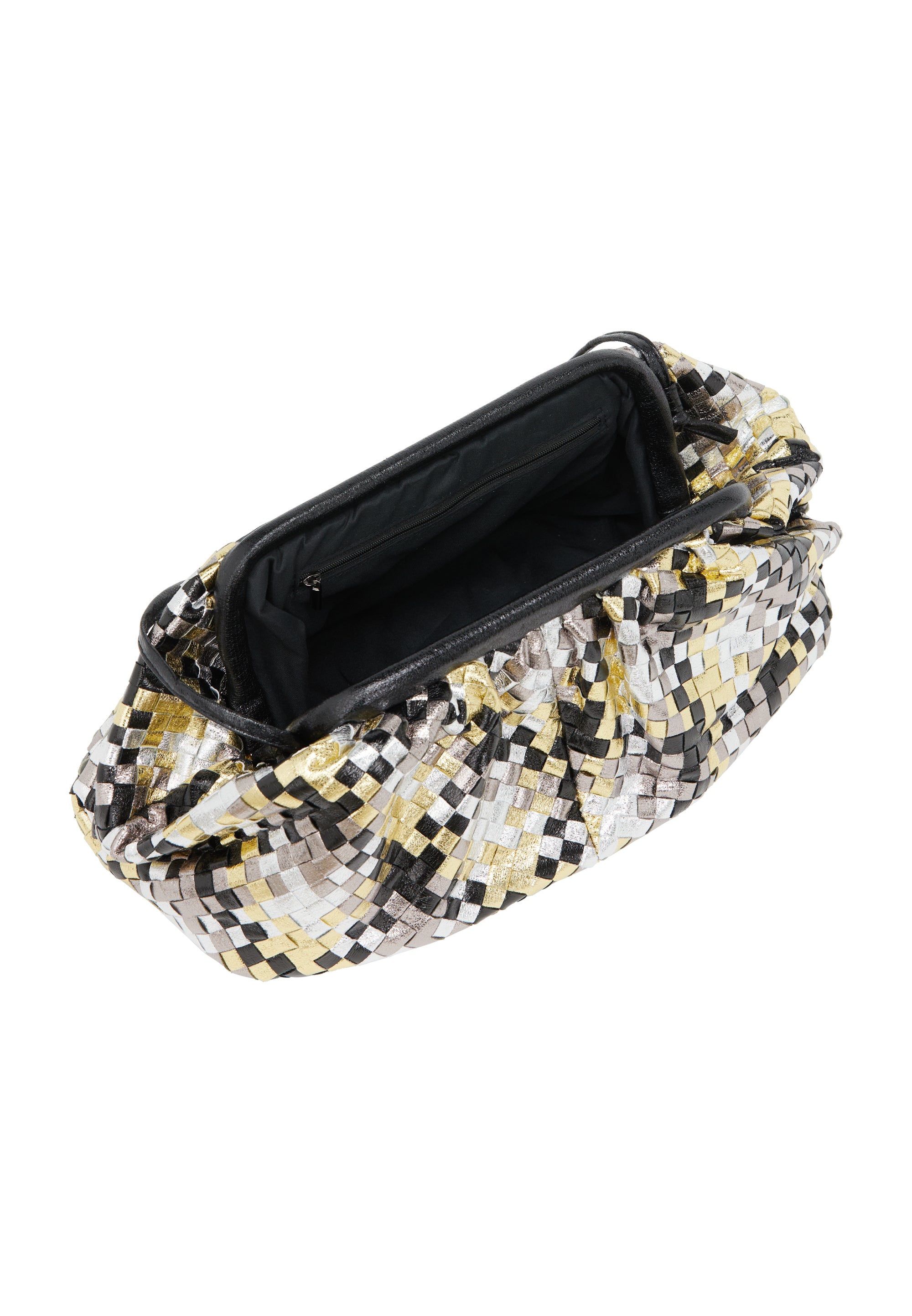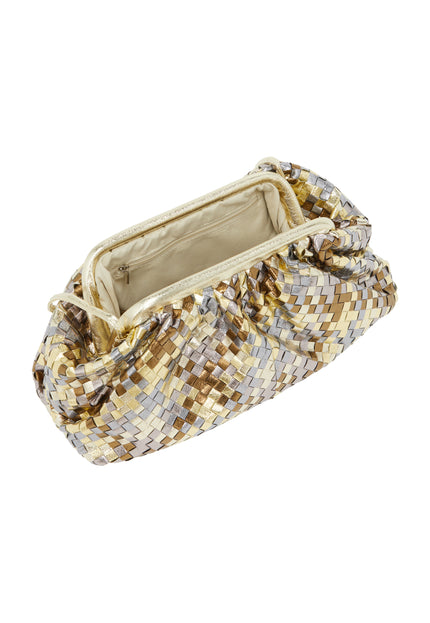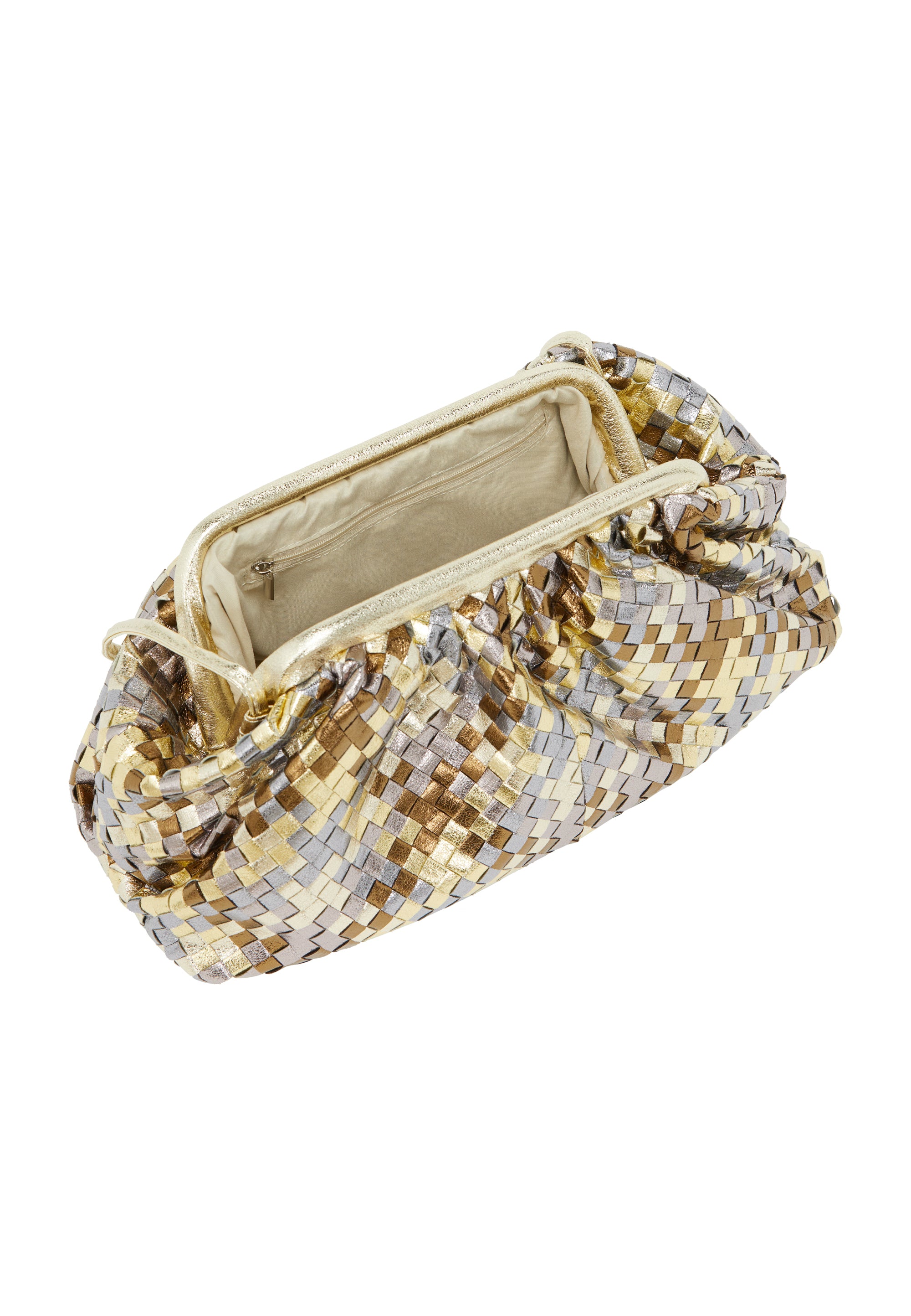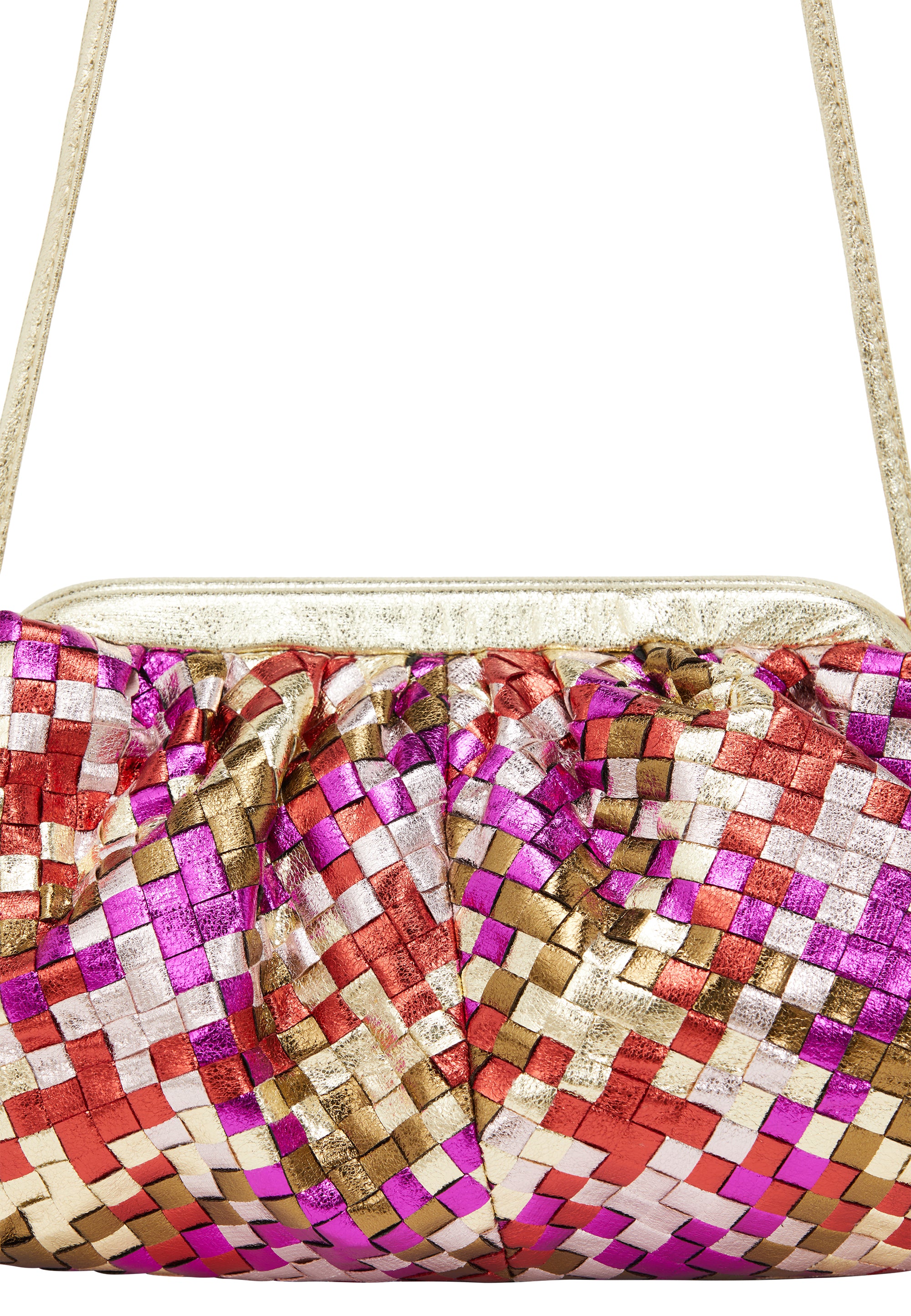 Discover this stylish clutch featuring a unique braided pattern that adds charm to any outfit. With its rounded silhouette and gathered top, it offers a whimsical touch. The decorative closure enhances its appeal, while the detachable strap provides versatility for crossbody or shoulder wear. Inside, a zippered inner pocket ensures secure storage for your essentials, making it perfect for evening events.