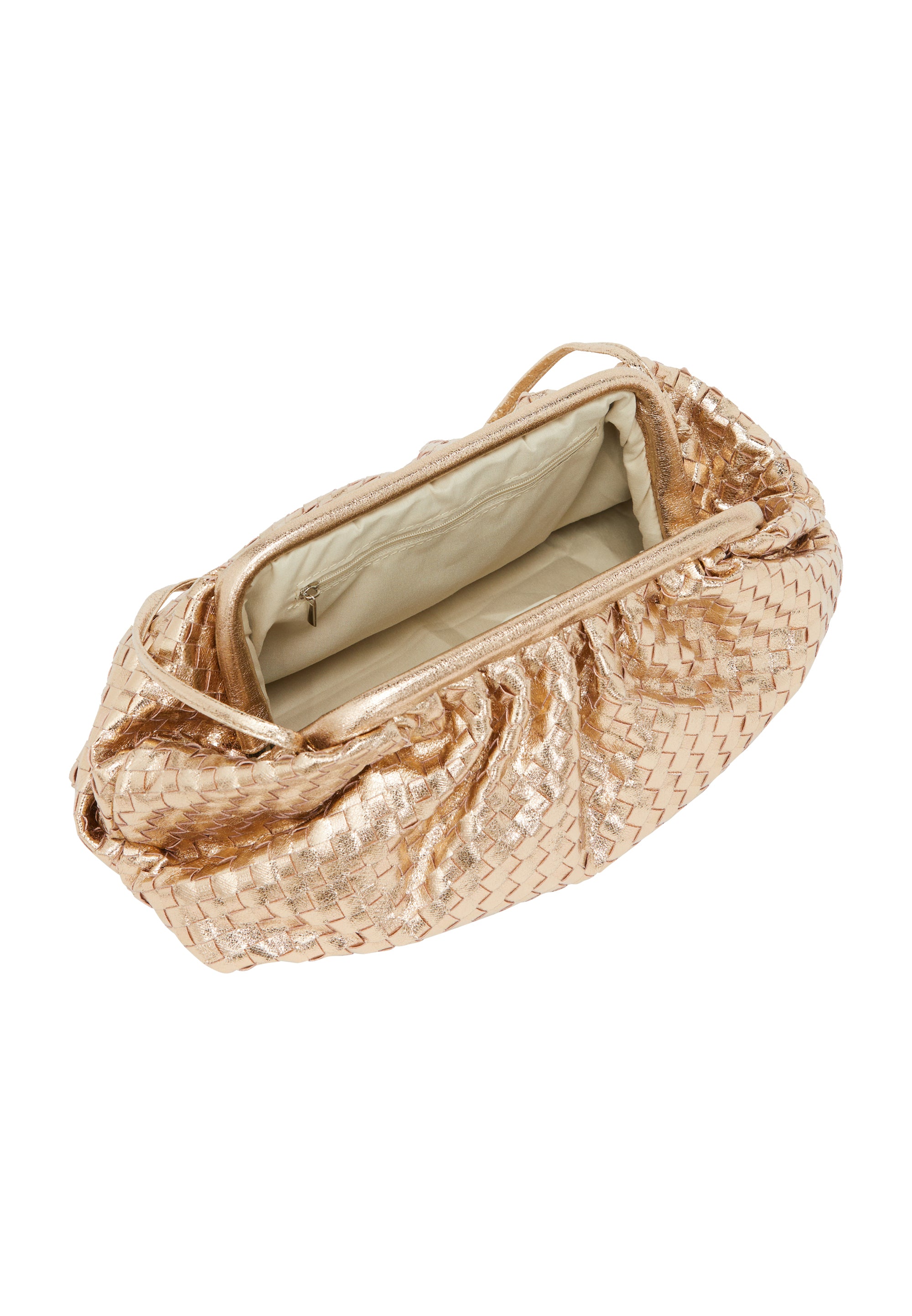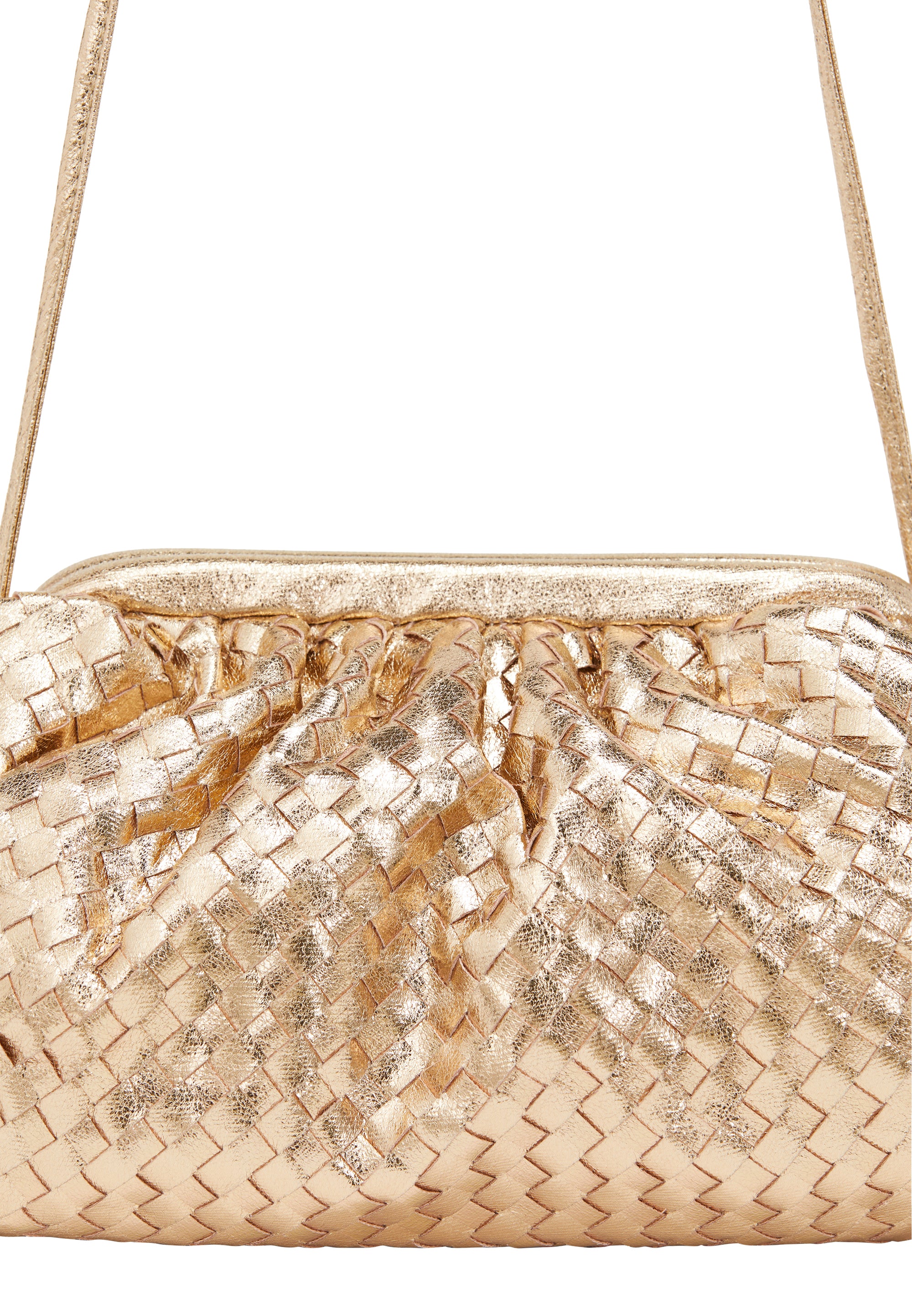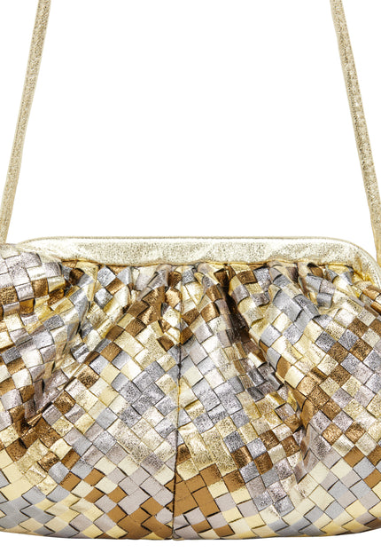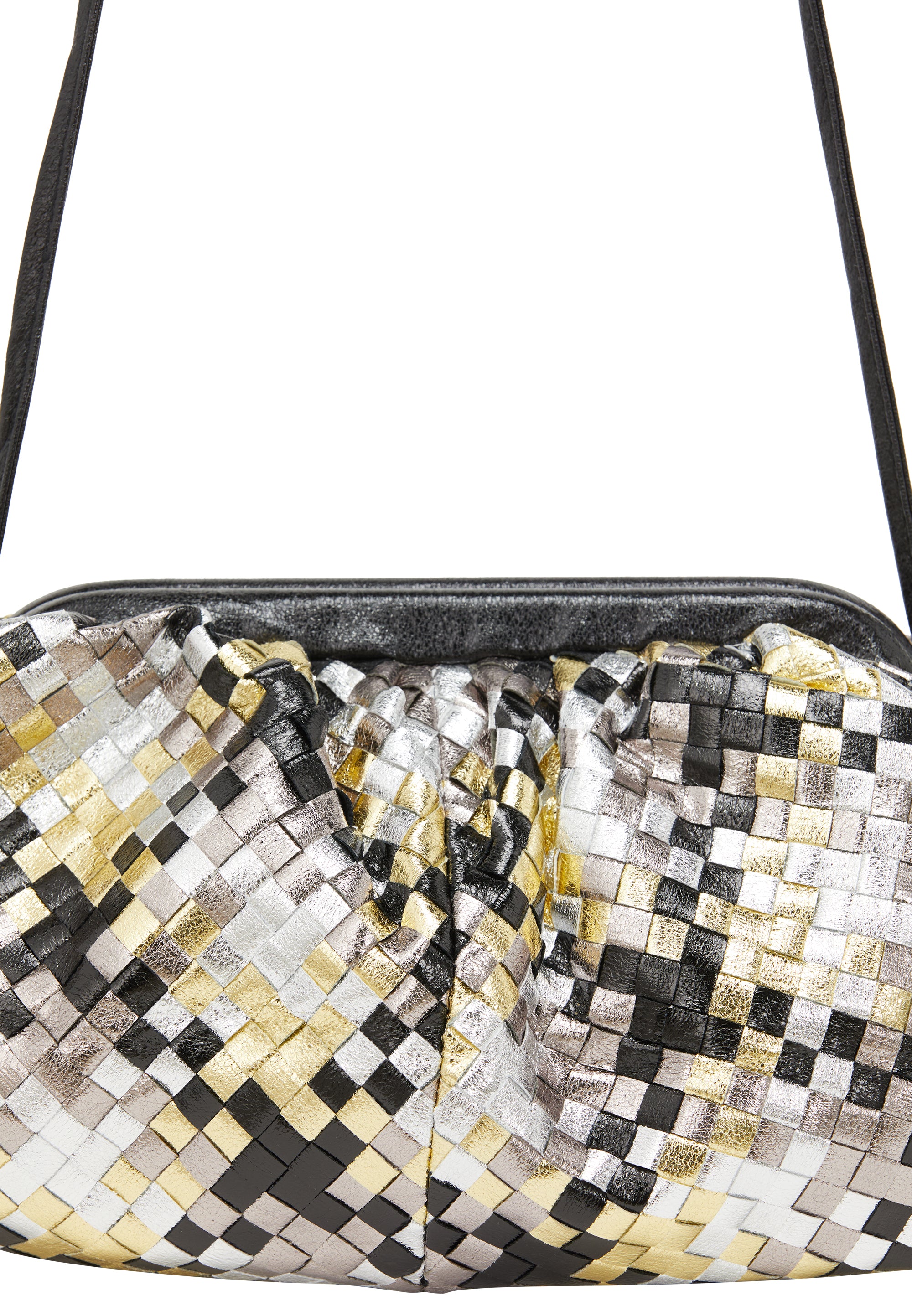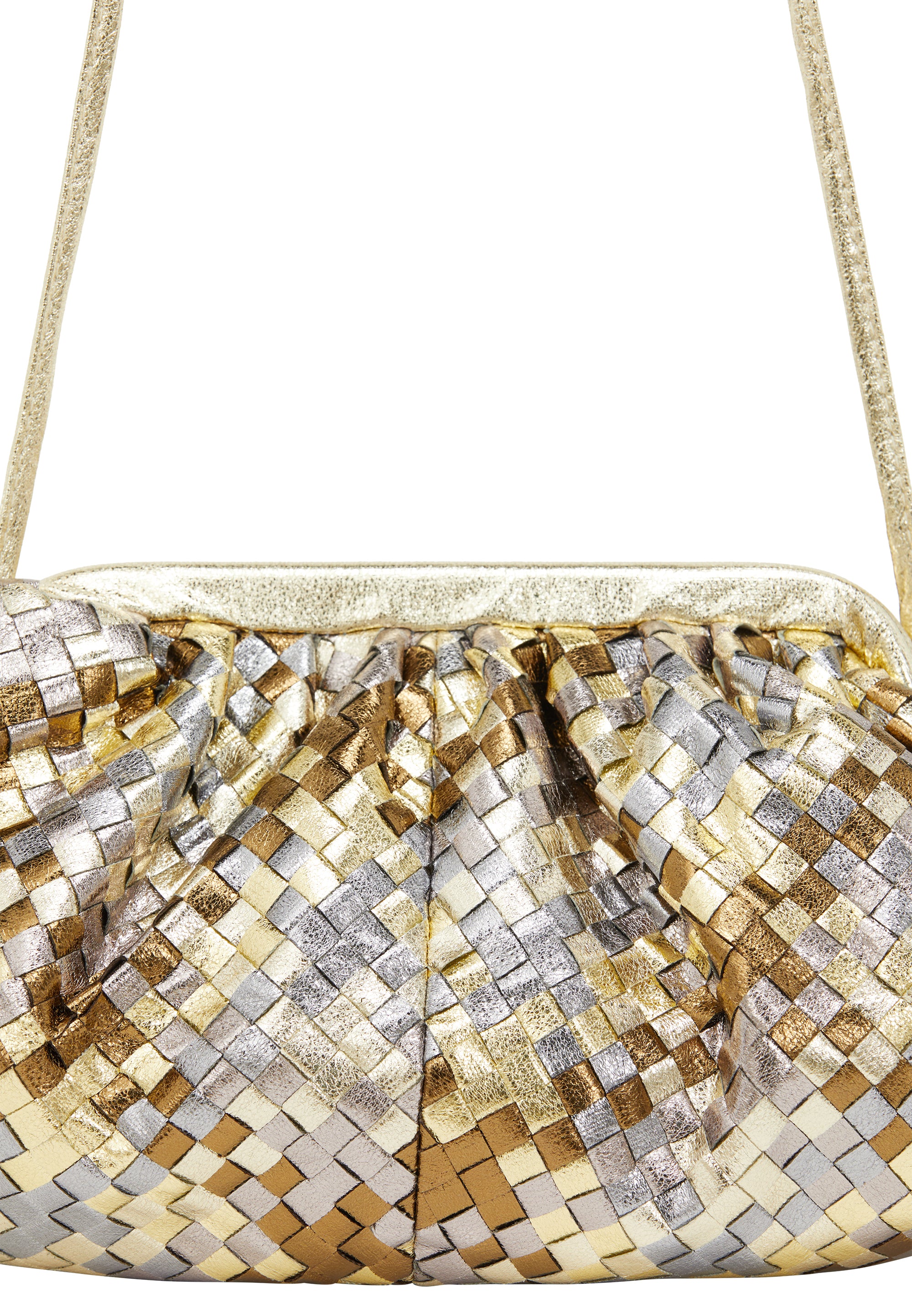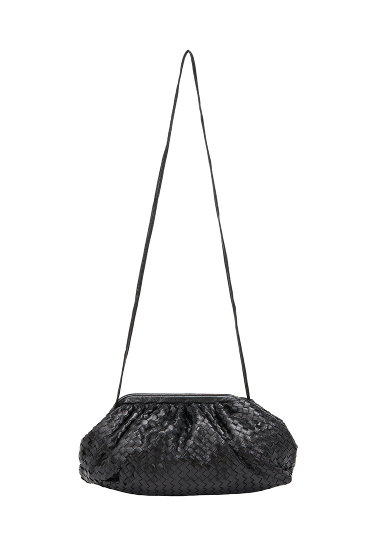 Discover this stylish clutch featuring a unique braided pattern that adds charm to any outfit. With its rounded silhouette and gathered top, it offers a whimsical touch. The decorative closure enhances its appeal, while the detachable strap provides versatility for crossbody or shoulder wear. Inside, a zippered inner pocket ensures secure storage for your essentials, making it perfect for evening events.
