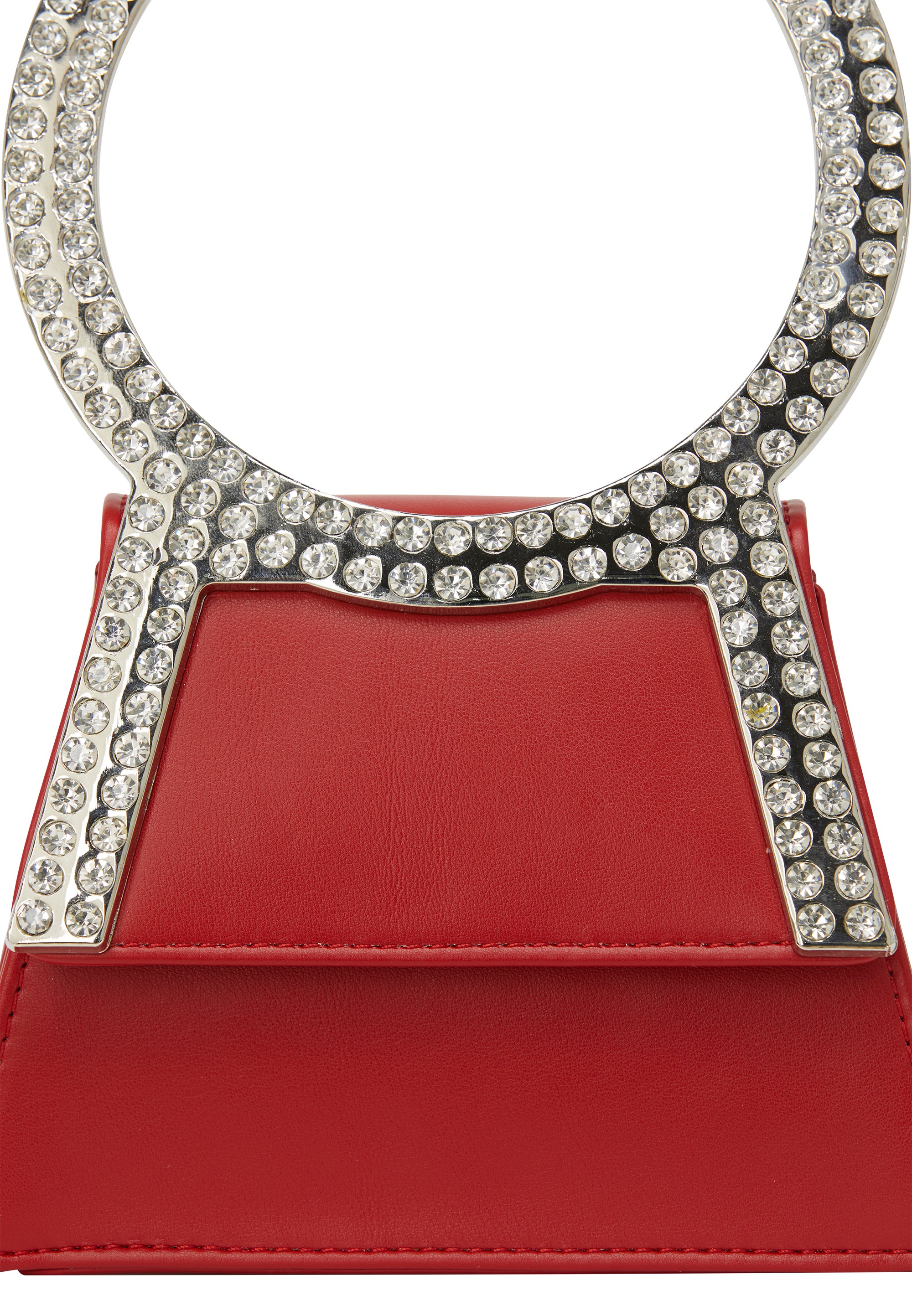 Elevate your style with this stunning handbag featuring a unique circular handle embellished with sparkling details. Its sleek design showcases a modern triangular silhouette, while the smooth front surface adds sophistication. Ideal for any party occasion, it includes an additional chain, inner pocket, and flap for added functionality and flair.