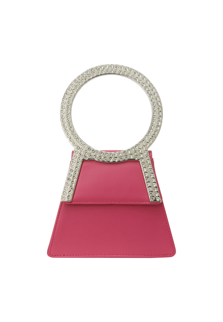 Elevate your style with this unique handbag featuring a chic circular handle embellished with sparkling details. Its structured body tapers to a trendy triangular shape, complete with a front flat pocket for added functionality. With an additional chain, inner pocket, and secure flap closure, this piece is ideal for any party occasion.