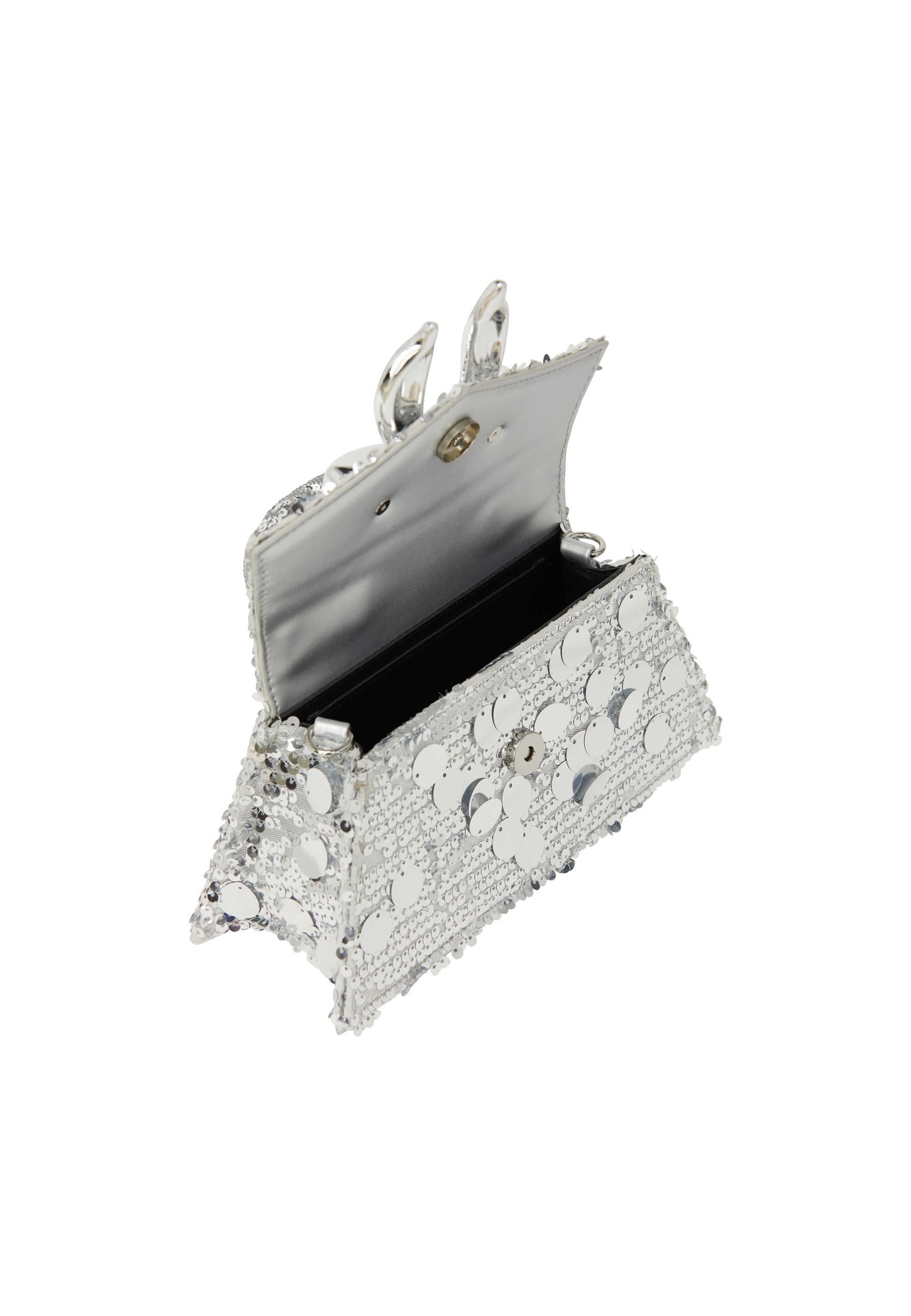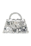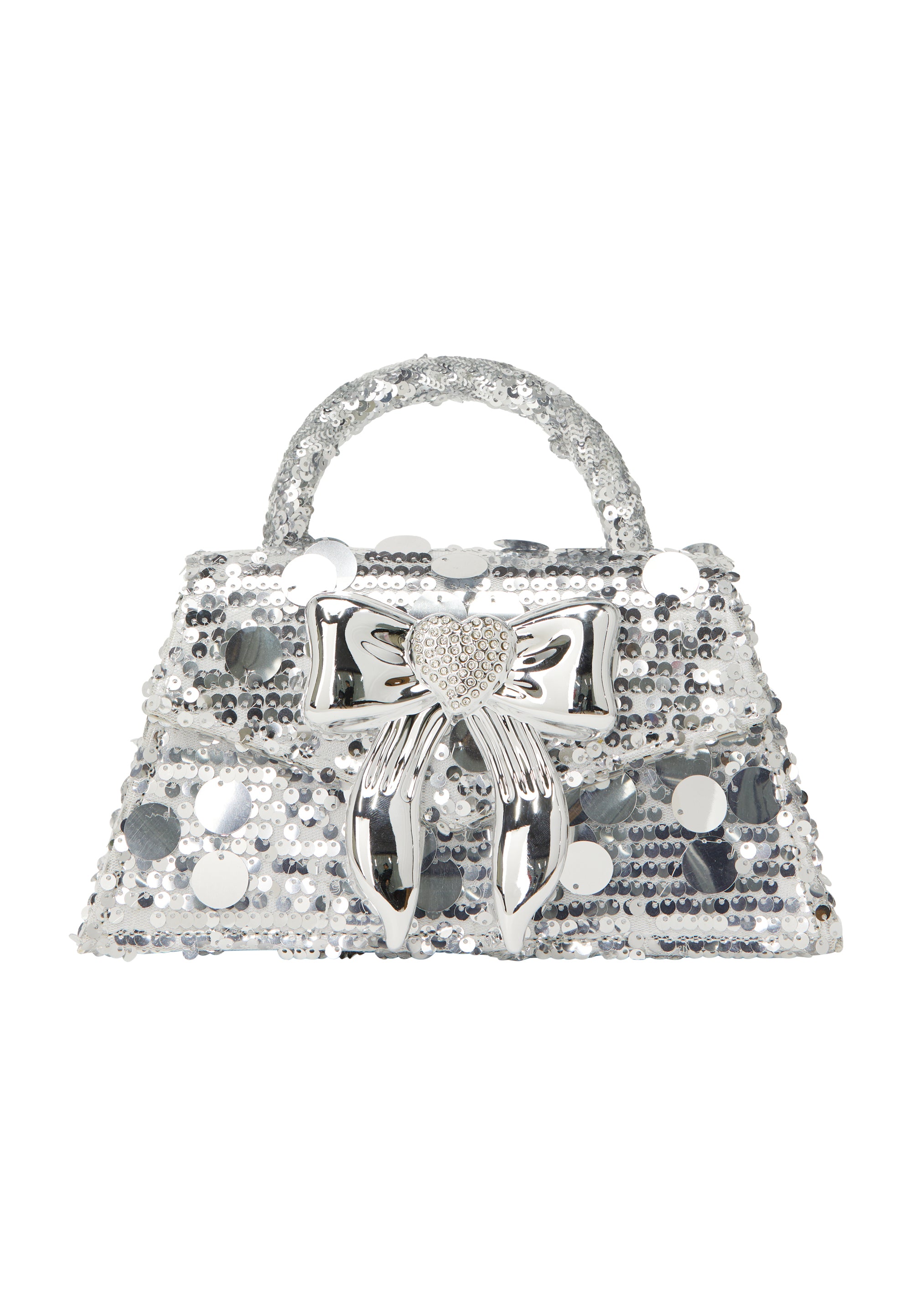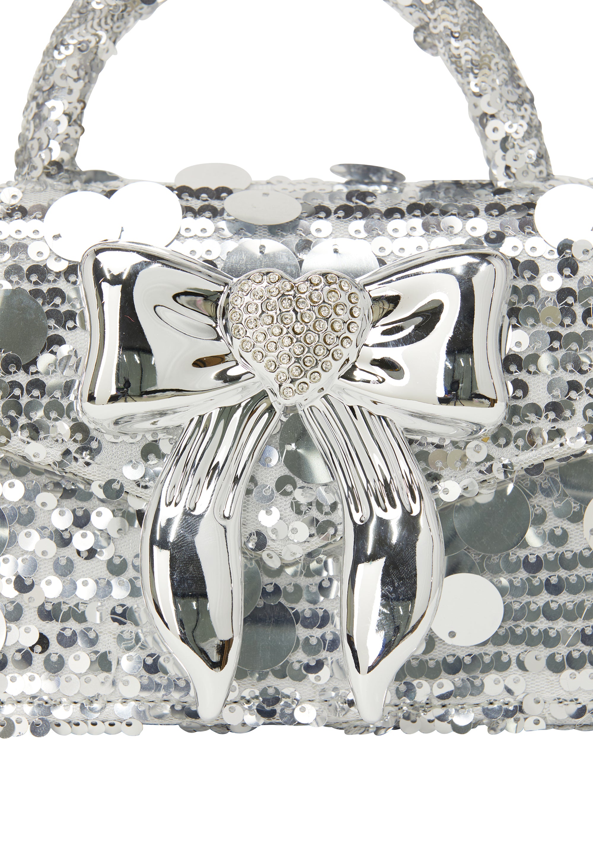 Discover a stylish handbag with a boxy silhouette and top handle, featuring a chic decorative bow with heart-shaped detail. Adorned with sequins and circular accents for added texture, the design is elevated by a textured handle. The elegant flap closure complements its charm, making it perfect for party occasions, complete with an additional chain, diamond pattern, and inner pocket.