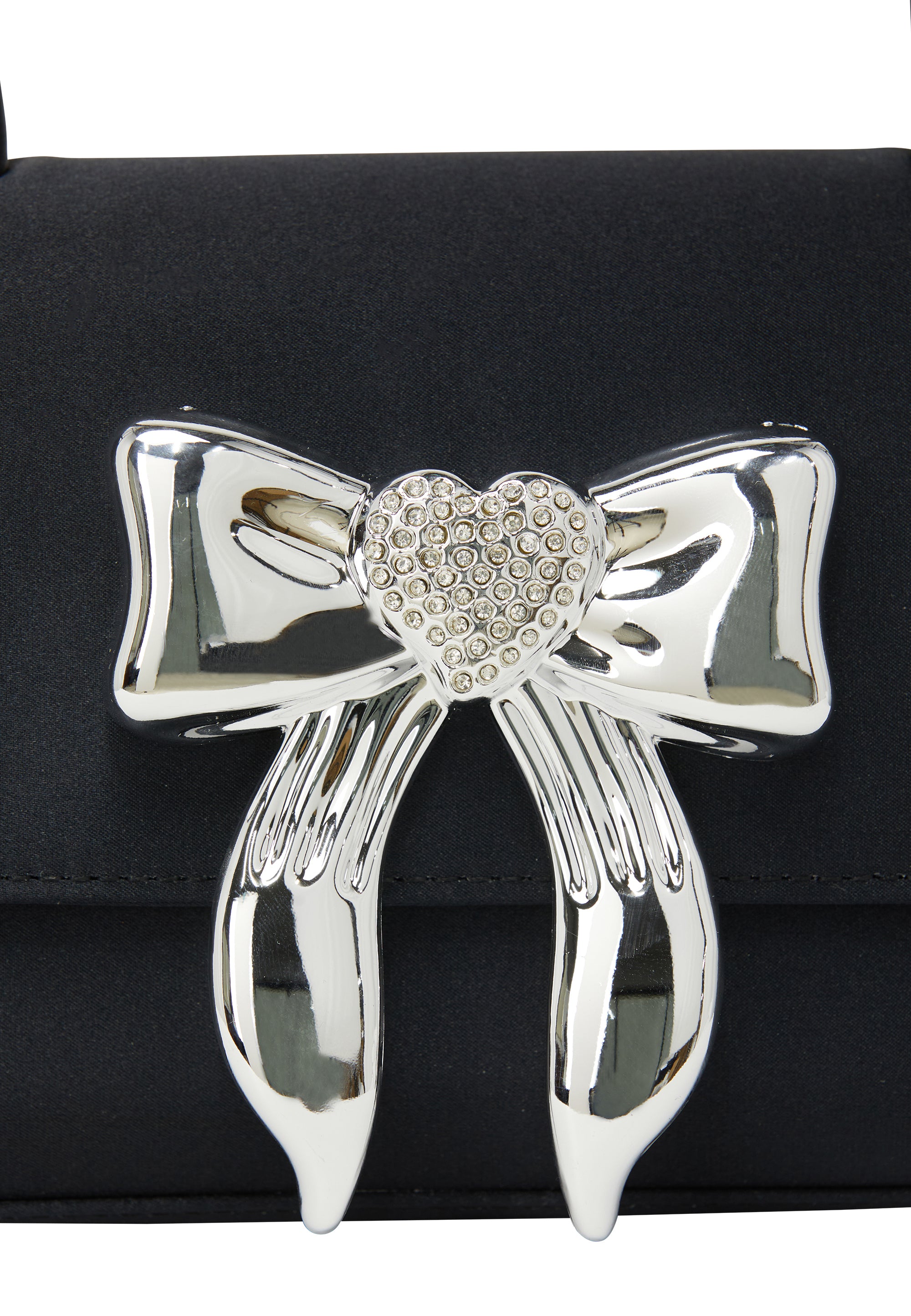 This structured handbag features a top handle for easy carrying and a rectangular shape with a flap closure. The ornate bow design at the front is embellished with a heart-shaped element and sparkling details, adding a playful touch to its elegant aesthetic. Complete with an additional chain, diamond pattern, inner pocket, and suitable for party occasions.