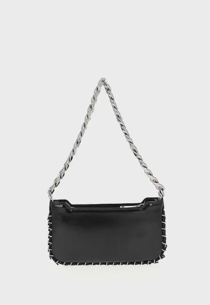 This sleek handbag boasts a structured design with a rectangular shape and zippered closure for secure storage. Adorned with decorative elements on the sides, it features a chain strap for shoulder or crossbody wear, adding a stylish contrast. Ideal for casual occasions, this bag exudes elegance and modernity, complete with inner pocket for added functionality.