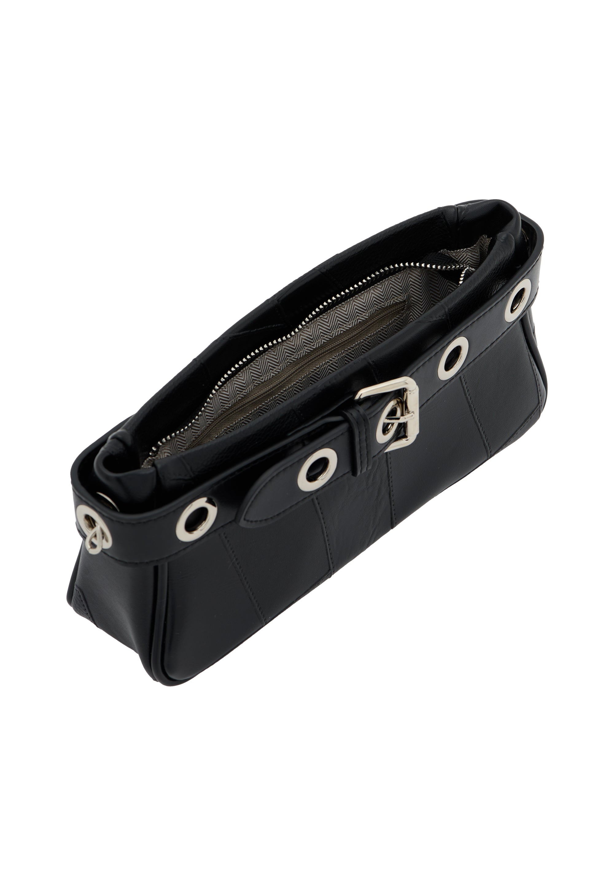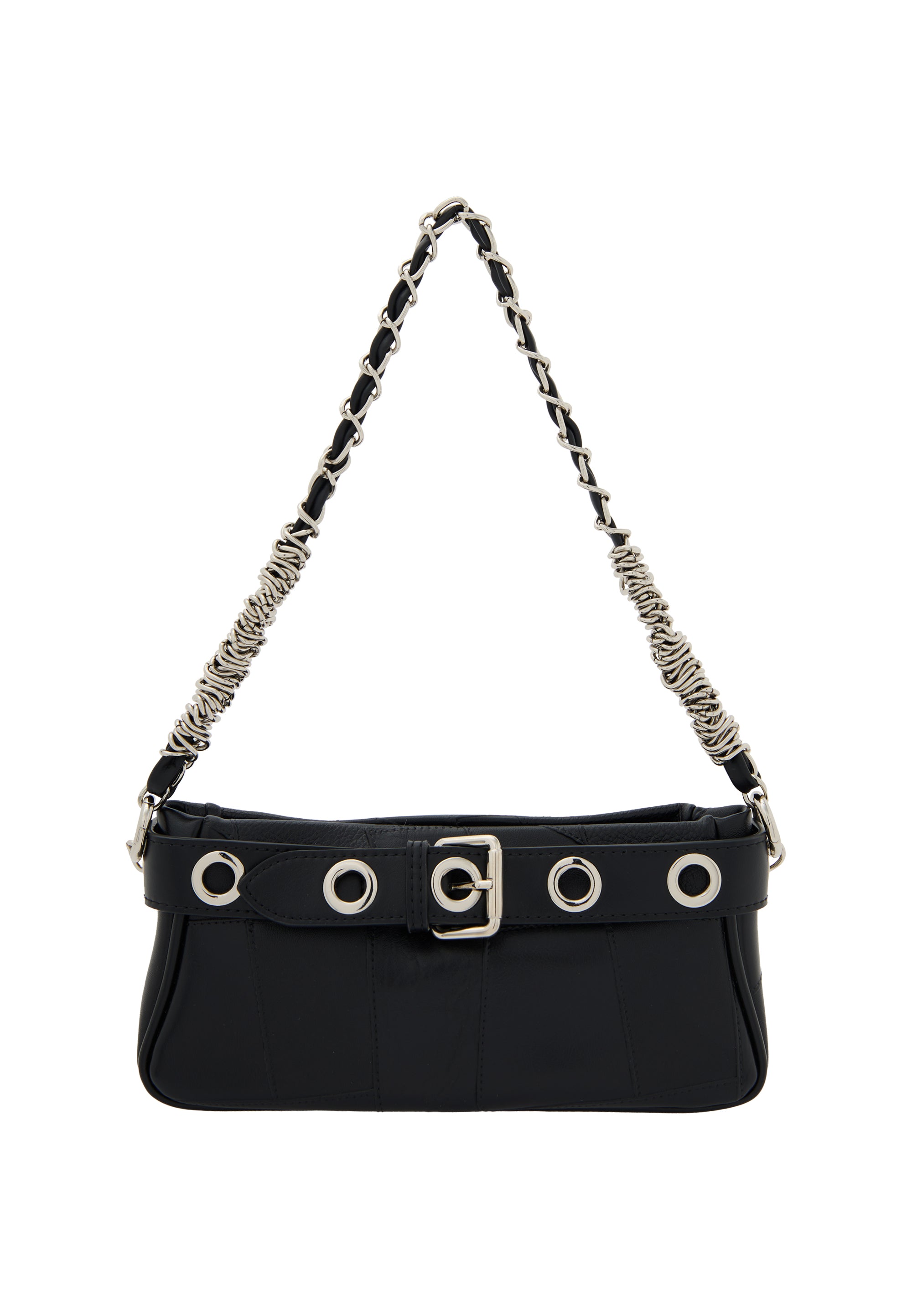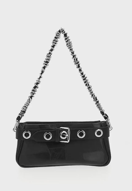Discover this stylish shoulder bag designed with a sleek rectangular shape and structured body. It features elegant stitching, a belt-like strap adorned with metal grommets, and a chic buckle for added flair. The dual-handle design includes a versatile chain strap, perfect for casual occasions. Complete with an inner pocket, zipper closure, and plain color pattern.