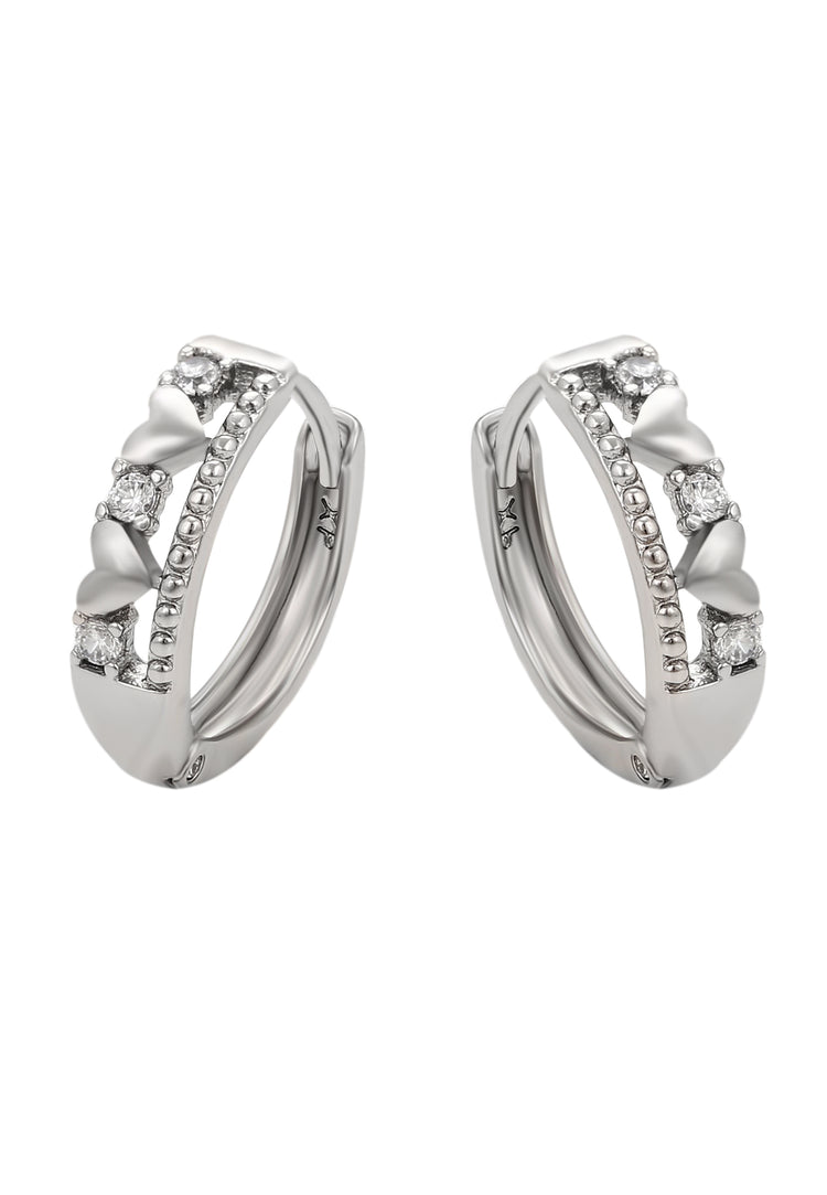 These elegant hoop earrings from the Jewelry Collection showcase a charming heart motif adorned with sparkling rhinestones, creating a shimmering, shiny pattern on polished copper. Featuring a secure hinged closure and a versatile huggie design, they offer both comfort and timeless style. Perfect for adding a radiant touch of elegance and romance to any outfit.