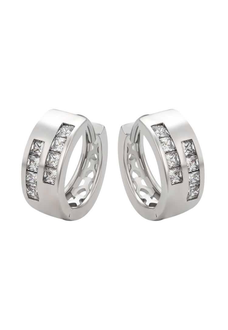 These elegant hoop huggie earrings from the Jewelry Collection are crafted in copper and adorned with sparkling rhinestones for a shimmering effect. Featuring a secure hinged closure, they combine comfort with timeless sophistication. Their plain patterned finish adds refined elegance, making them a versatile accessory to elevate any outfit with effortless style.