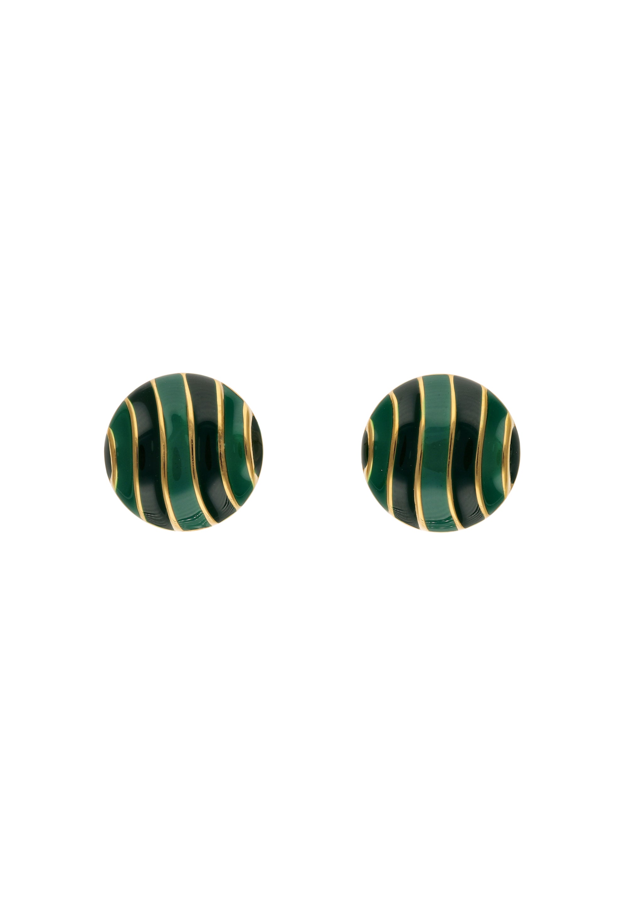 Elegant round stud earrings made of gold-toned copper from the Jewelry Collection. The surface is decorated with a striking green and gold pattern in the form of textured stripes, giving them a unique and timeless character. The clasp ensures comfort and safety when wearing. This jewelry is perfect for both everyday wear and elegant occasions.