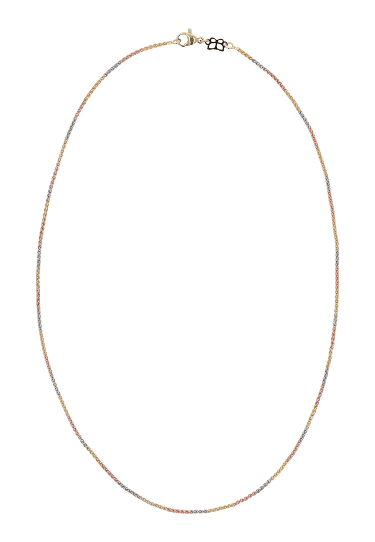 This elegant chain necklace made of copper impresses with its multi-tonal pattern, which subtly combines different shades of metal to create an effect of depth and shine. The lobster clasp ensures comfort and security when worn. Thanks to its timeless and versatile character, the necklace goes perfectly with elegant outfits. It is a unique model combining classic style with modern elegance. It is part of the Jewelry Collection.