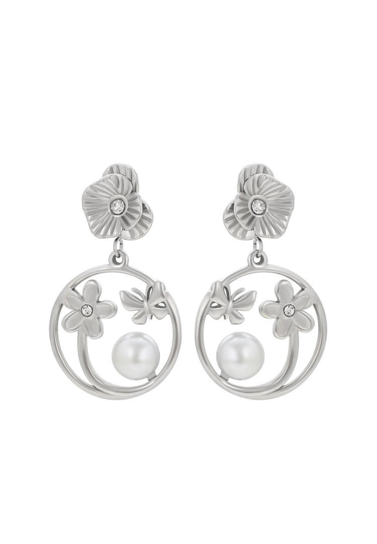 These elegant drop earrings from the Jewelry Collection are crafted in stainless steel and adorned with sparkling rhinestones for a shimmering effect. Featuring a delicate floral motif and a secure butterfly clutch, they combine comfort with timeless charm. Their plain patterned finish highlights refined elegance, making them a versatile accessory to elevate any outfit with effortless sophistication.