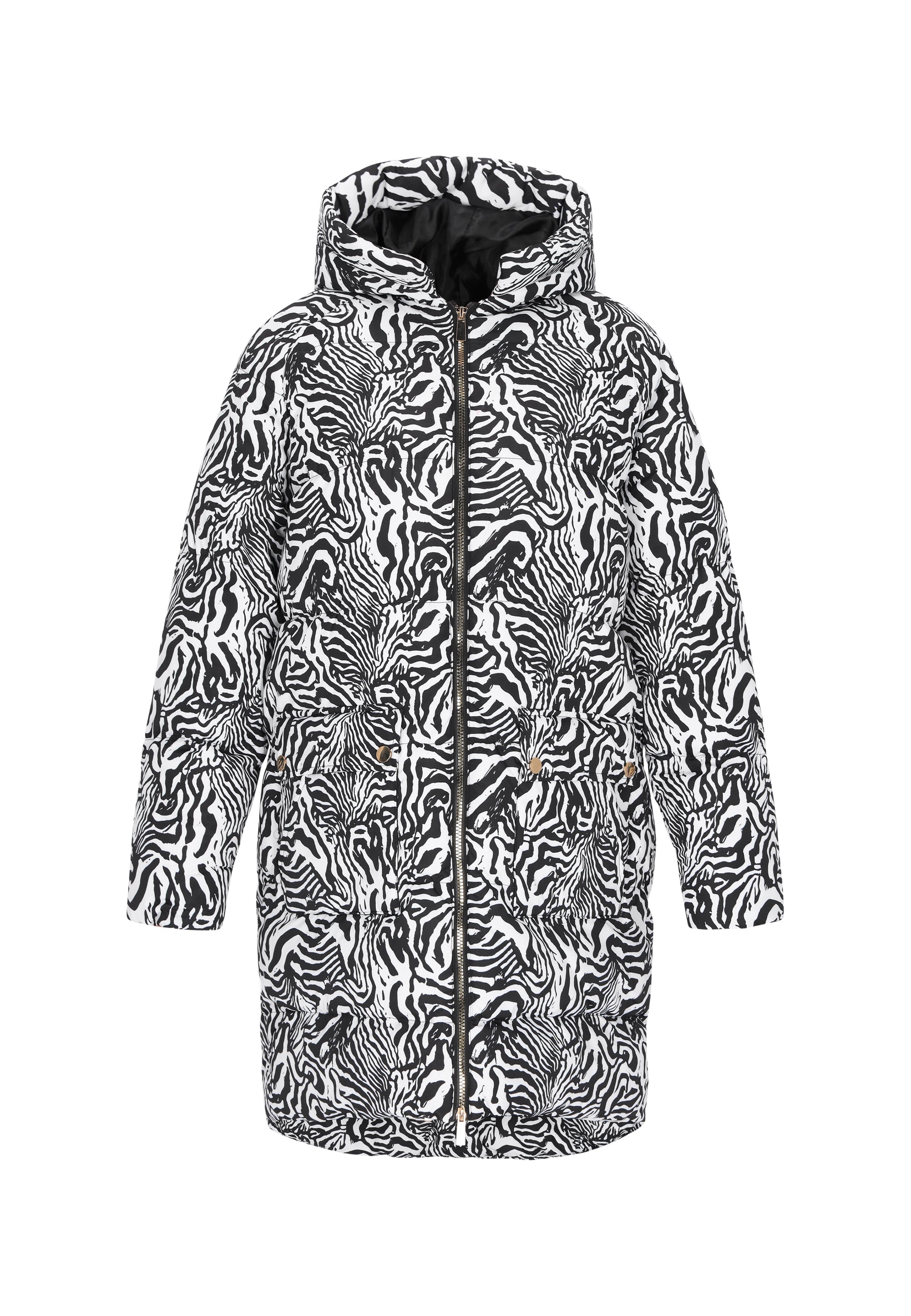 This regular-fit coat is the perfect blend of comfort and fashionable design. Its zebra print adds a distinctive touch. The coat features a practical hood, long sleeves, a zipper closure, and flap pockets for added functionality. Made of durable, woven fabric, it provides warmth and comfort even on cooler days. Perfect for everyday wear, this stylish and reliable coat from the Fashion Look Collection is sure to impress.