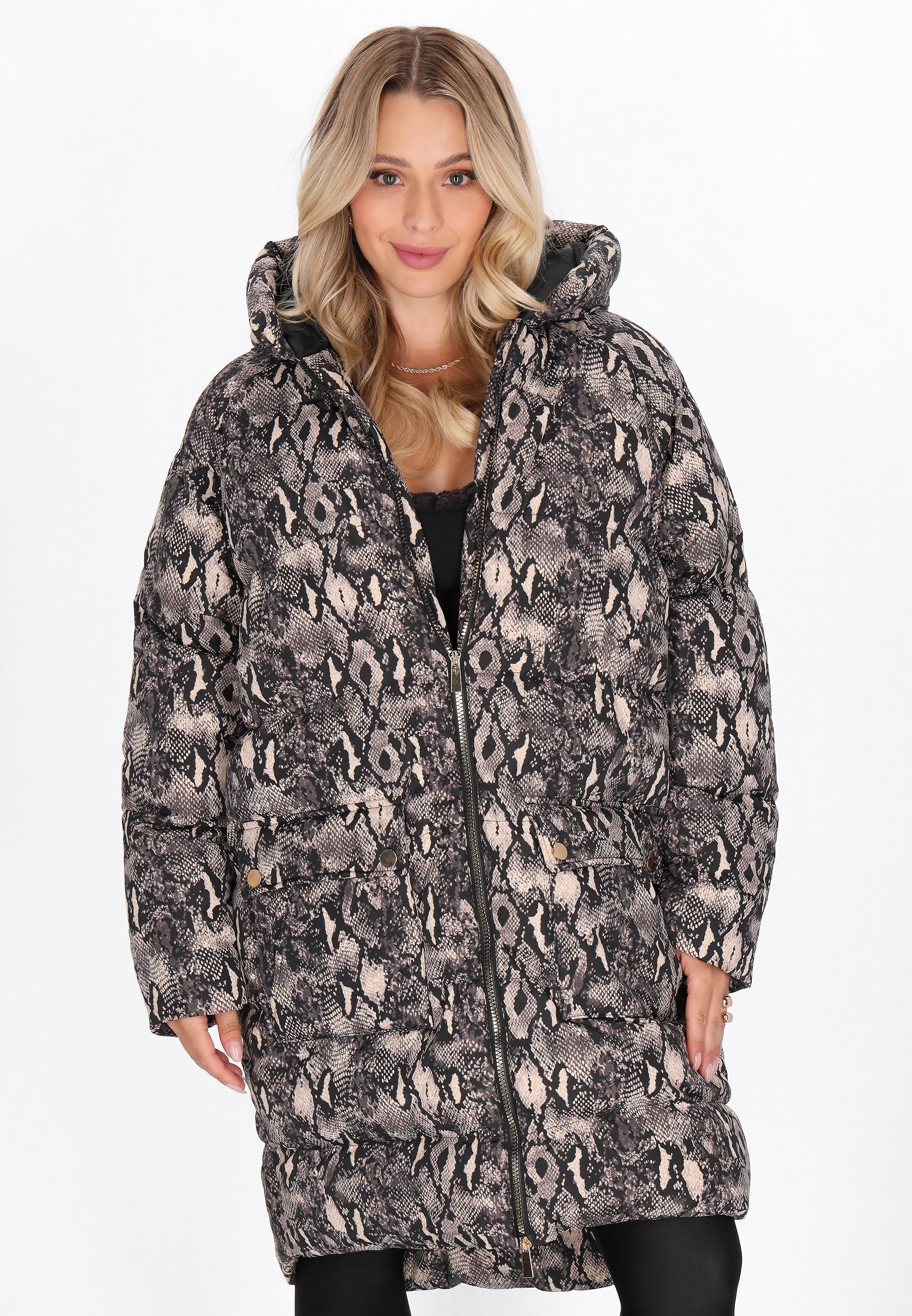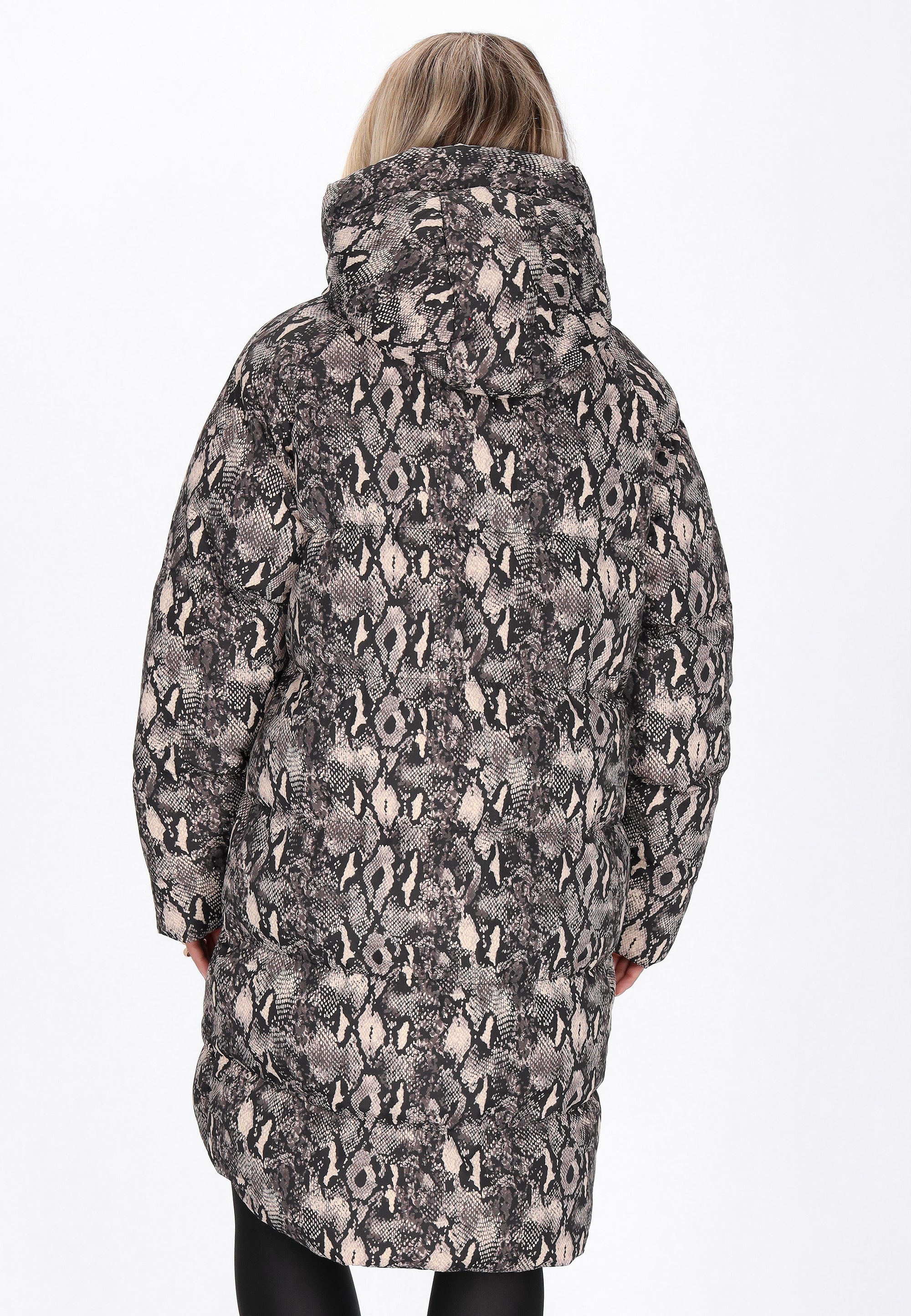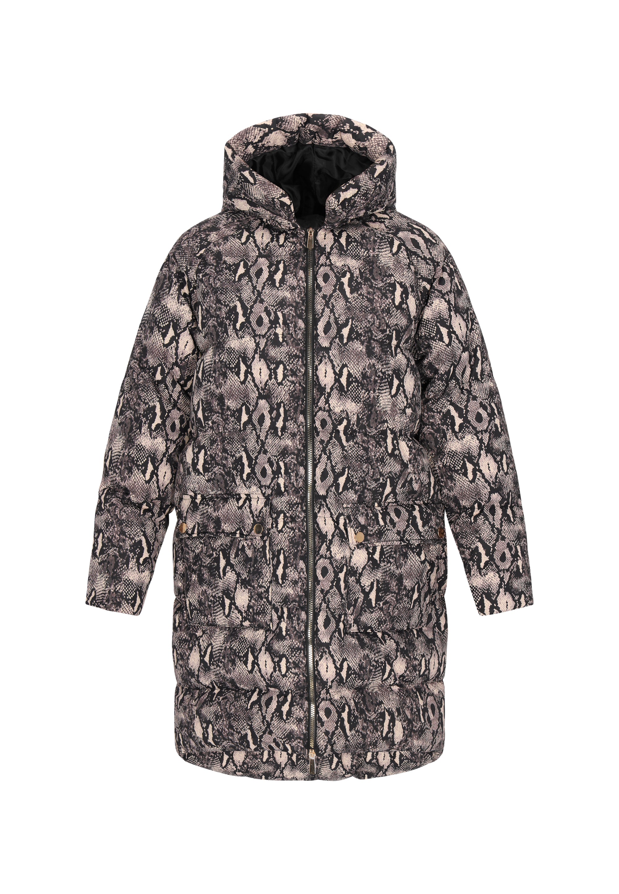 This regular-fit coat is the perfect blend of comfort and fashionable design. Its snakeskin print adds a distinctive touch. The coat features a practical hood, long sleeves, a zipper closure, and flap pockets for added functionality. Made of durable, woven fabric, it provides warmth and comfort even on cooler days. Perfect for everyday wear, this stylish and reliable coat from the Fashion Look Collection is sure to impress.