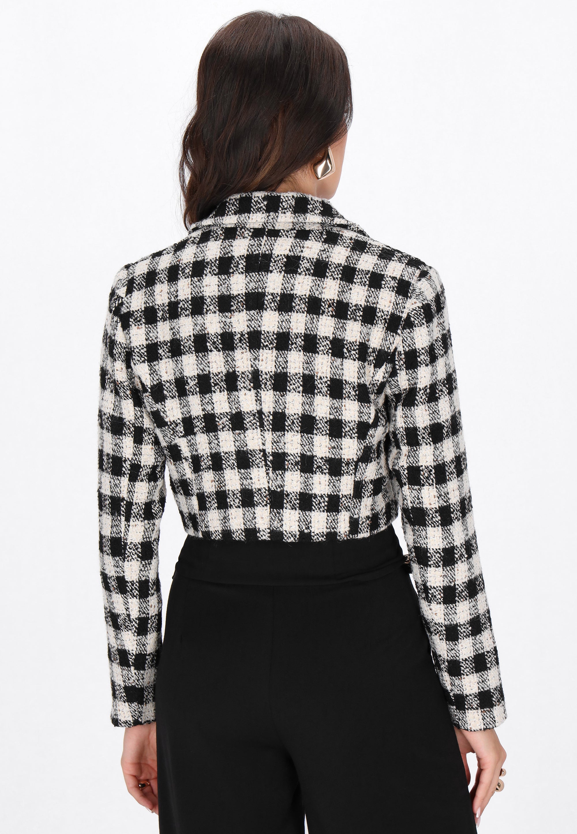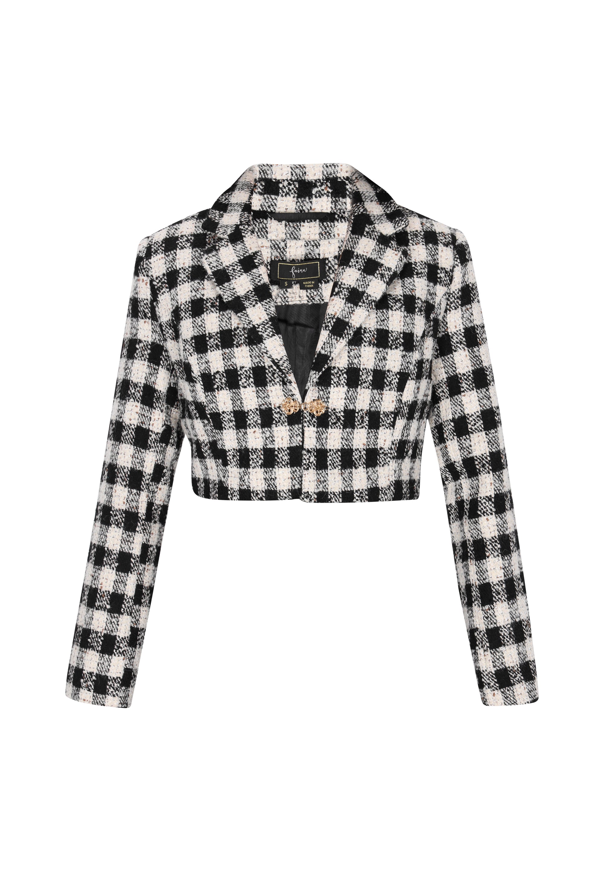 Keyword: cropped, decorative closure, elegant, event, fashion look collection, gingham pattern, hook closure, jacket, lapel collar, long sleeves, regular fit, v neck, woven