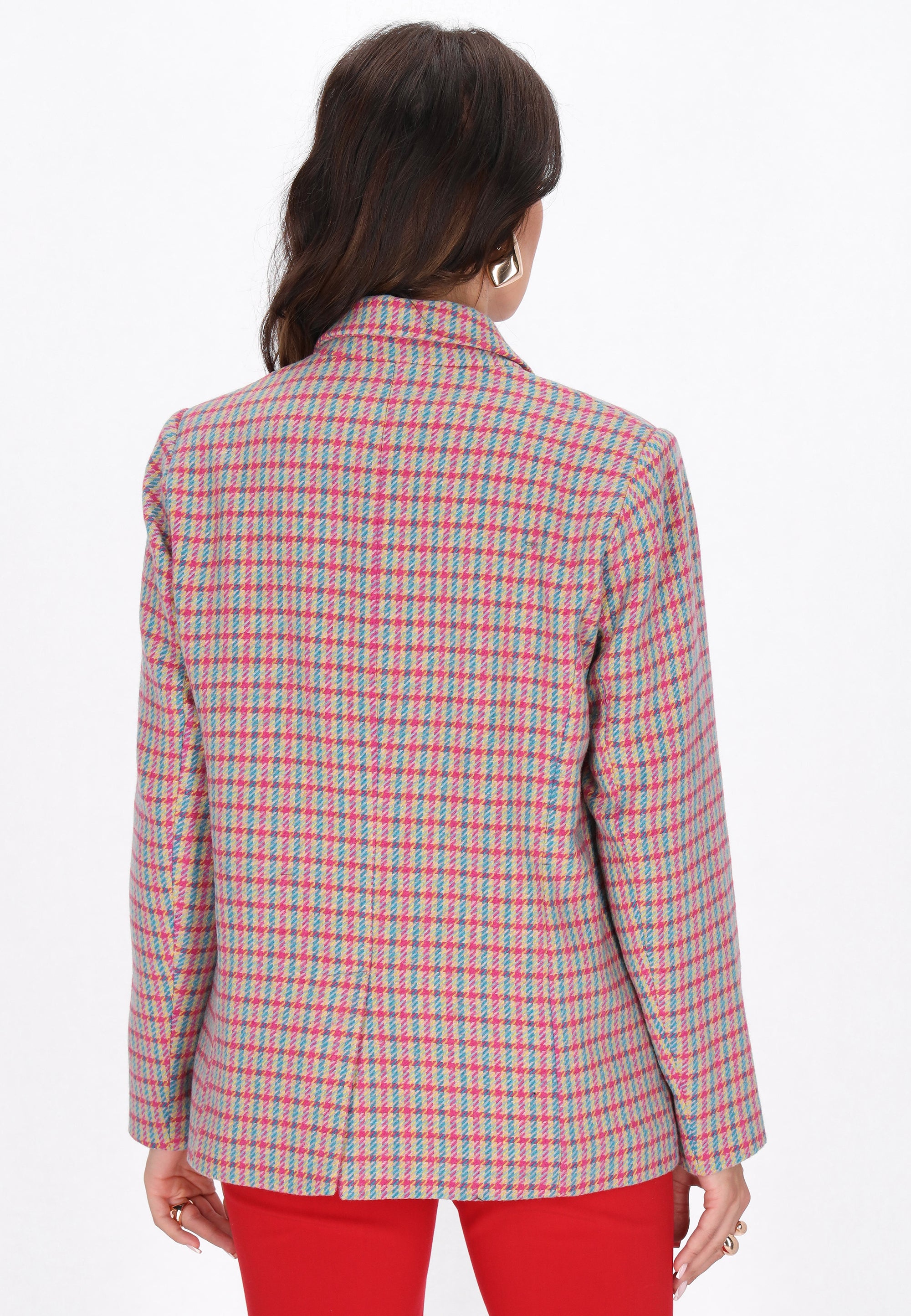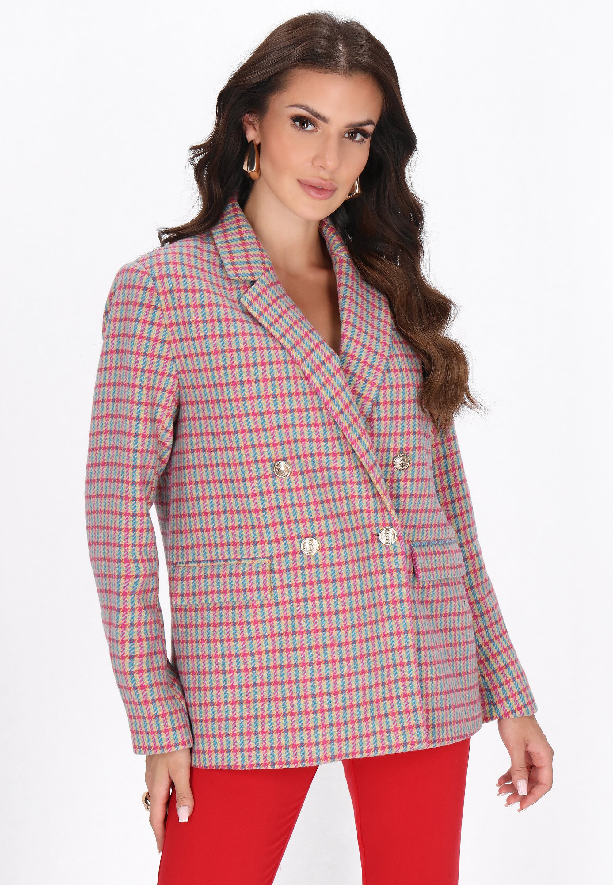 Elegant and timeless - this jacket from the Fashion Look Collection is a must-have for special occasions. Made of high-quality plaid fabric with a classic peplite pattern, it presents itself with a touch of sophistication and style. The regular cut model features a lapel collar, a heart neckline, long sleeves and a double-breasted button closure. Pockets with flaps add functionality and an elegant finish. Ideal for special events, it combines classic with a modern look.