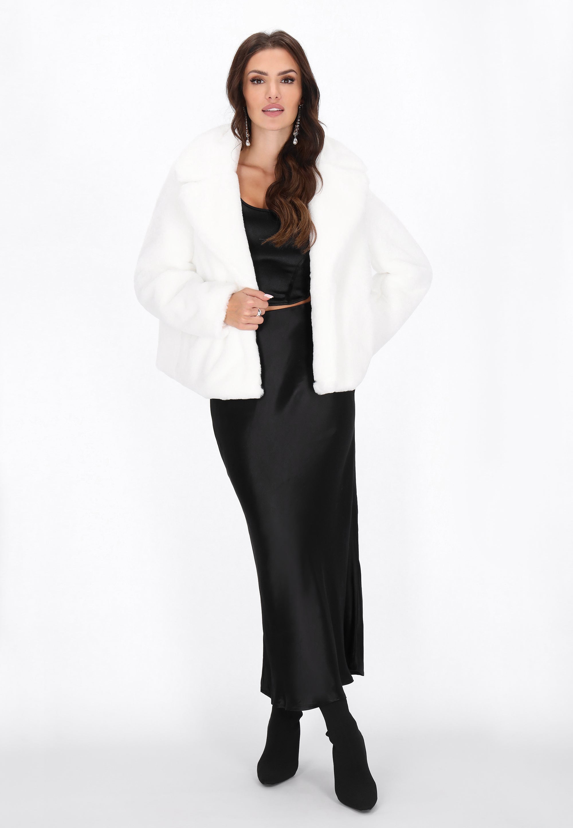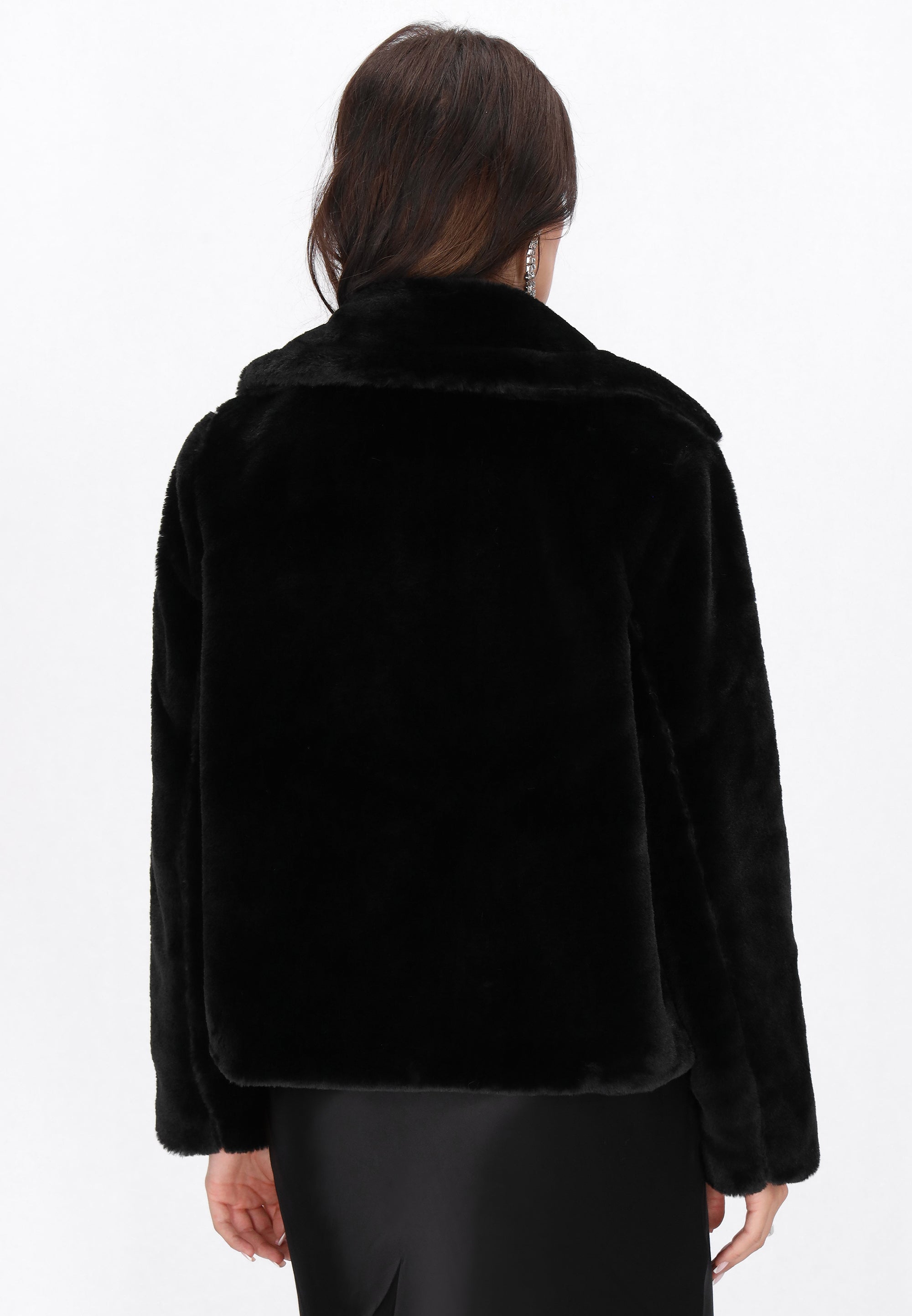 This elegant jacket from the Fashion Look Collection is the perfect choice for cooler days and special occasions. Made of high-quality fabric with a smooth pattern, it looks stylish and timeless. The regular cut model is designed with a lapel collar, a heart neckline and long sleeves. Soft eco fur trim adds a luxurious touch to the overall look. Practical pockets are a subtle finishing detail. It is a perfect choice for elegant outings.