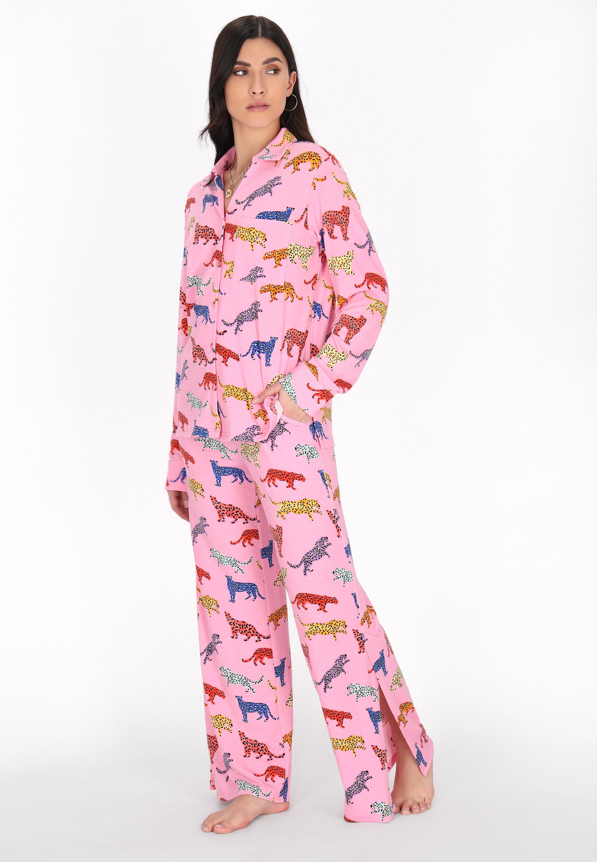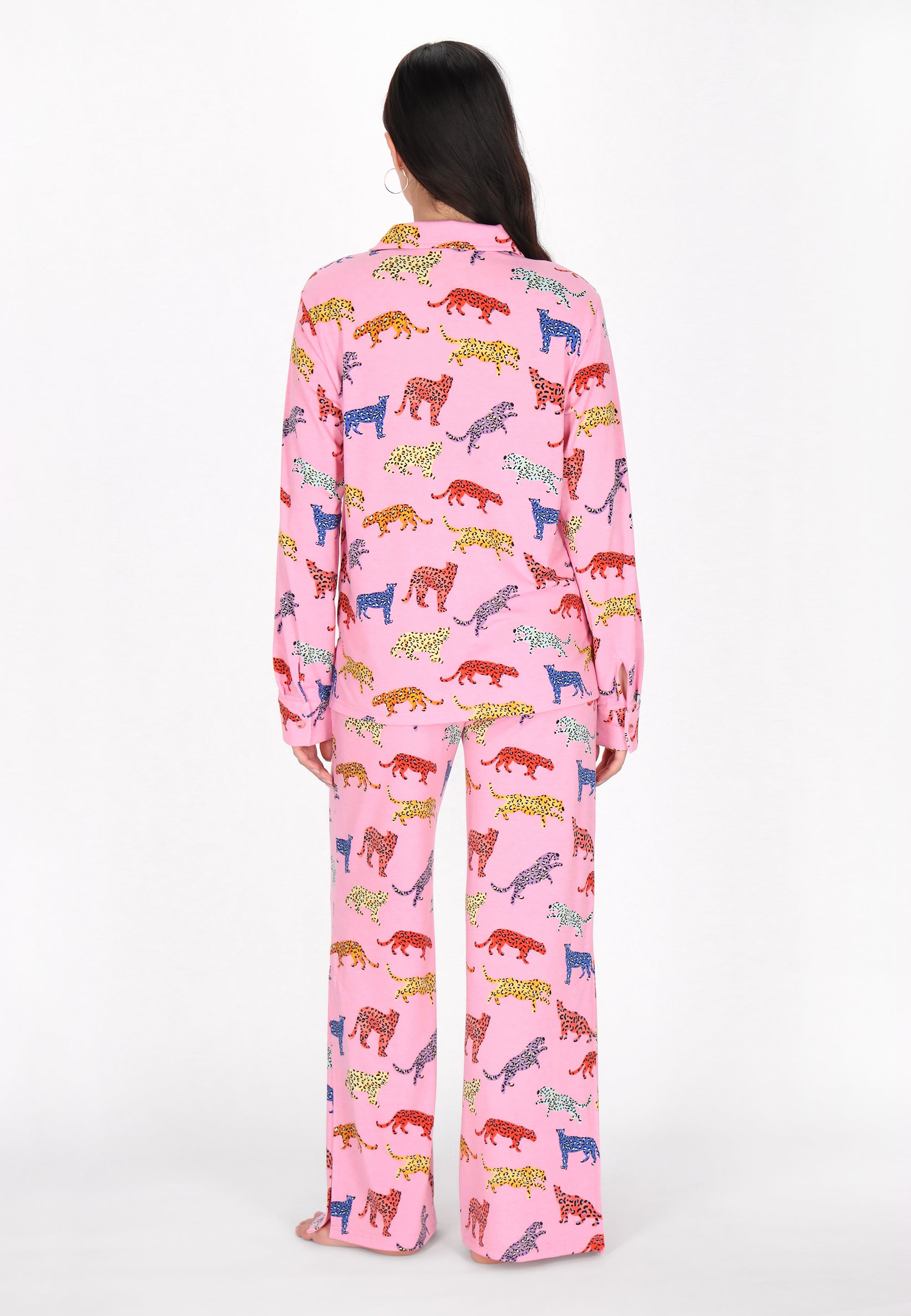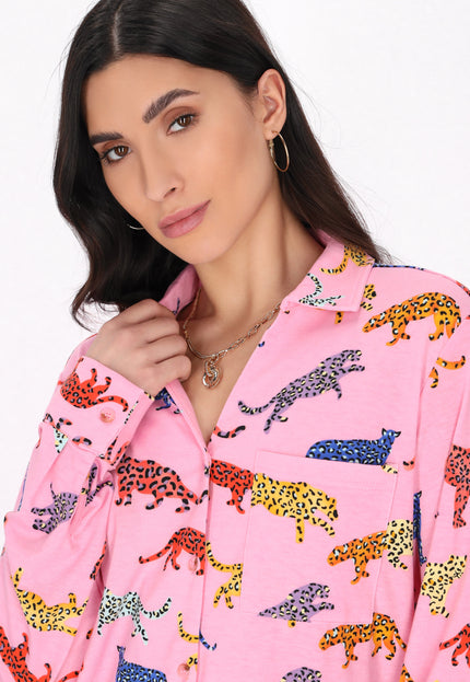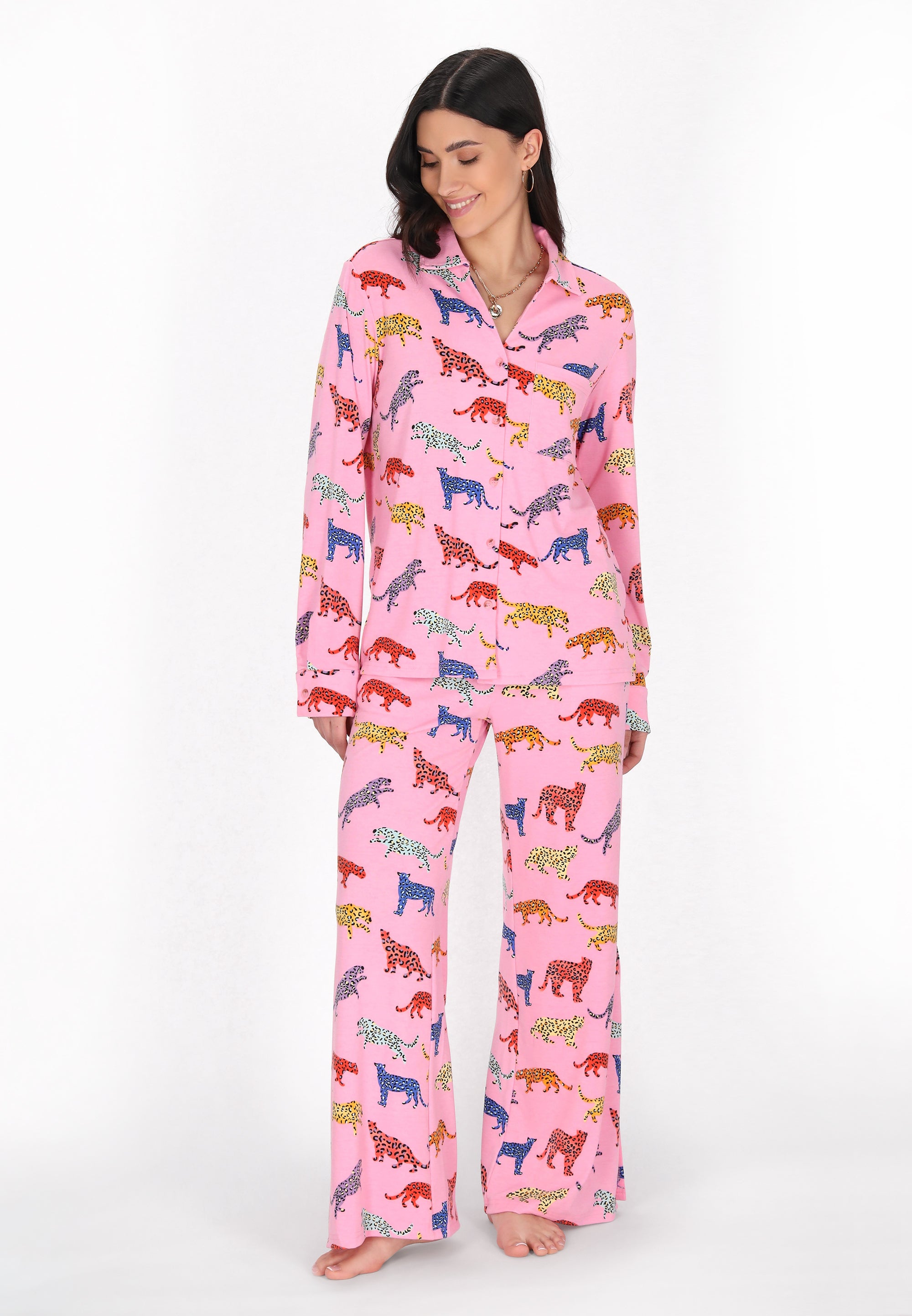 Discover our fashionable nightwear set, designed for ultimate comfort and style. This chic set consists of a button-down shirt with a pointed neckline with a chest pocket and long sleeves, complemented by long high-waisted pants with an elastic waistband. Decorated with an animal print , this woven model is perfect for fashion lovers looking for easy-to-wear options from our Sleepwear Collection.
