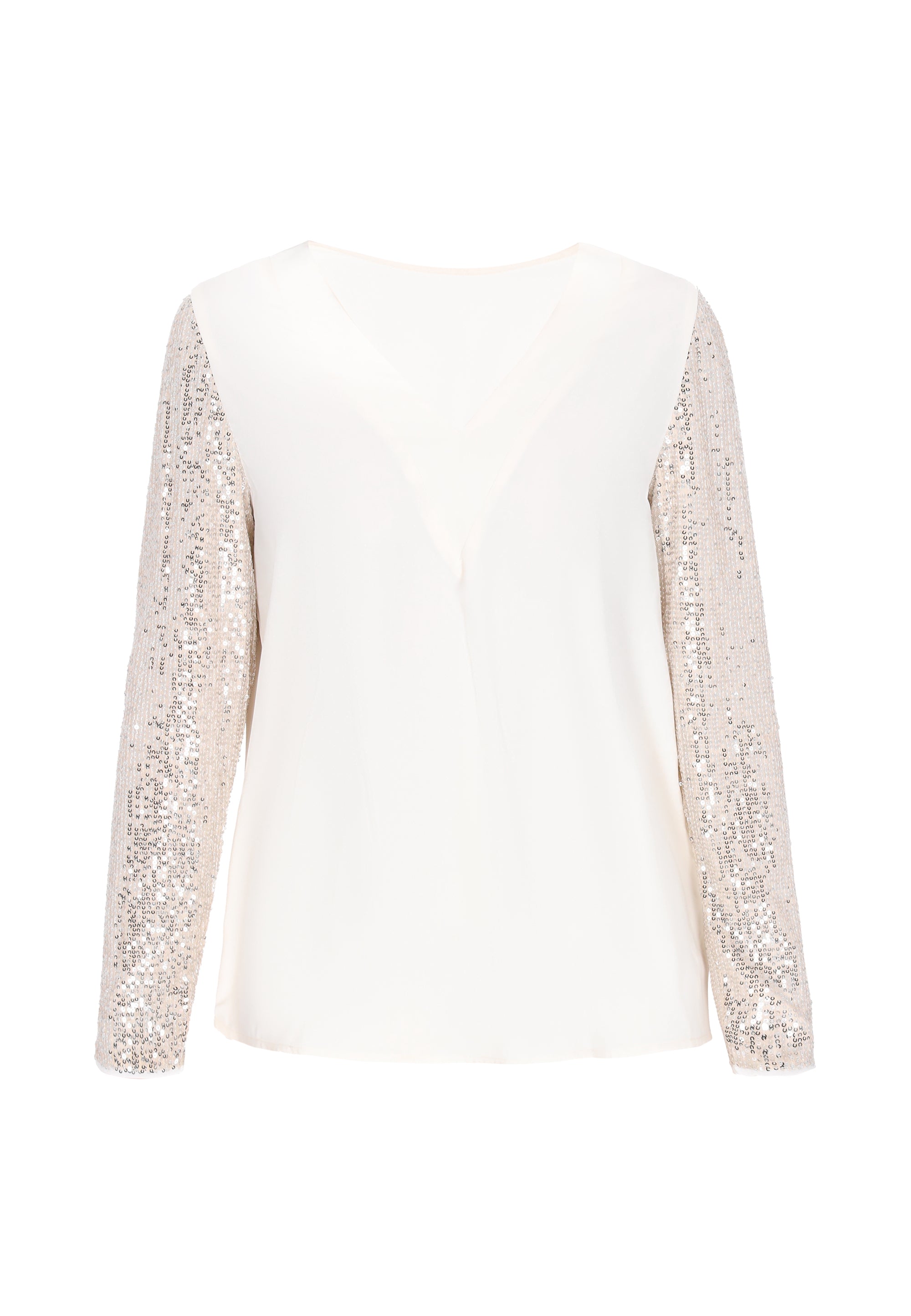 Discover a stylish blouse designed for women, featuring a regular fit and flattering V-neckline. This chic top showcases long sleeves embellished with sequins, perfect for elevating your party or event attire. The woven plain fabric beautifully contrasts with the dazzling sleeve accents, making it an essential blouse in the Fashion Look Collection.
