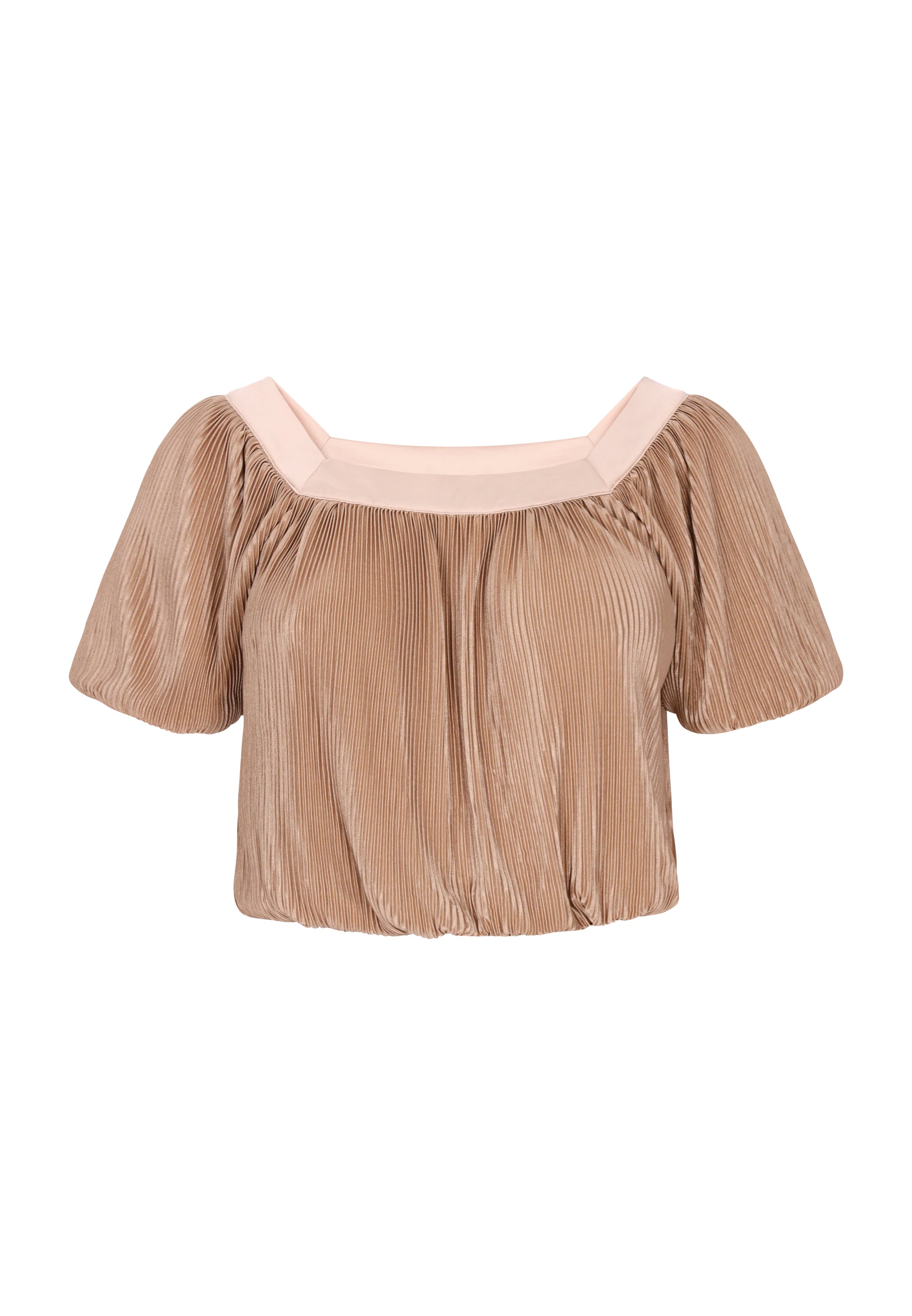 Elevate your everyday style with this stylish blouse in a short, loose fit. The square neckline is beautifully accented with a contrasting stripe, while the short buff sleeves add a playful touch. Made of shiny knit fabric, the pleated texture adds to its appeal, making it perfect for any casual occasion. It is part of the Fashion Look Collection.